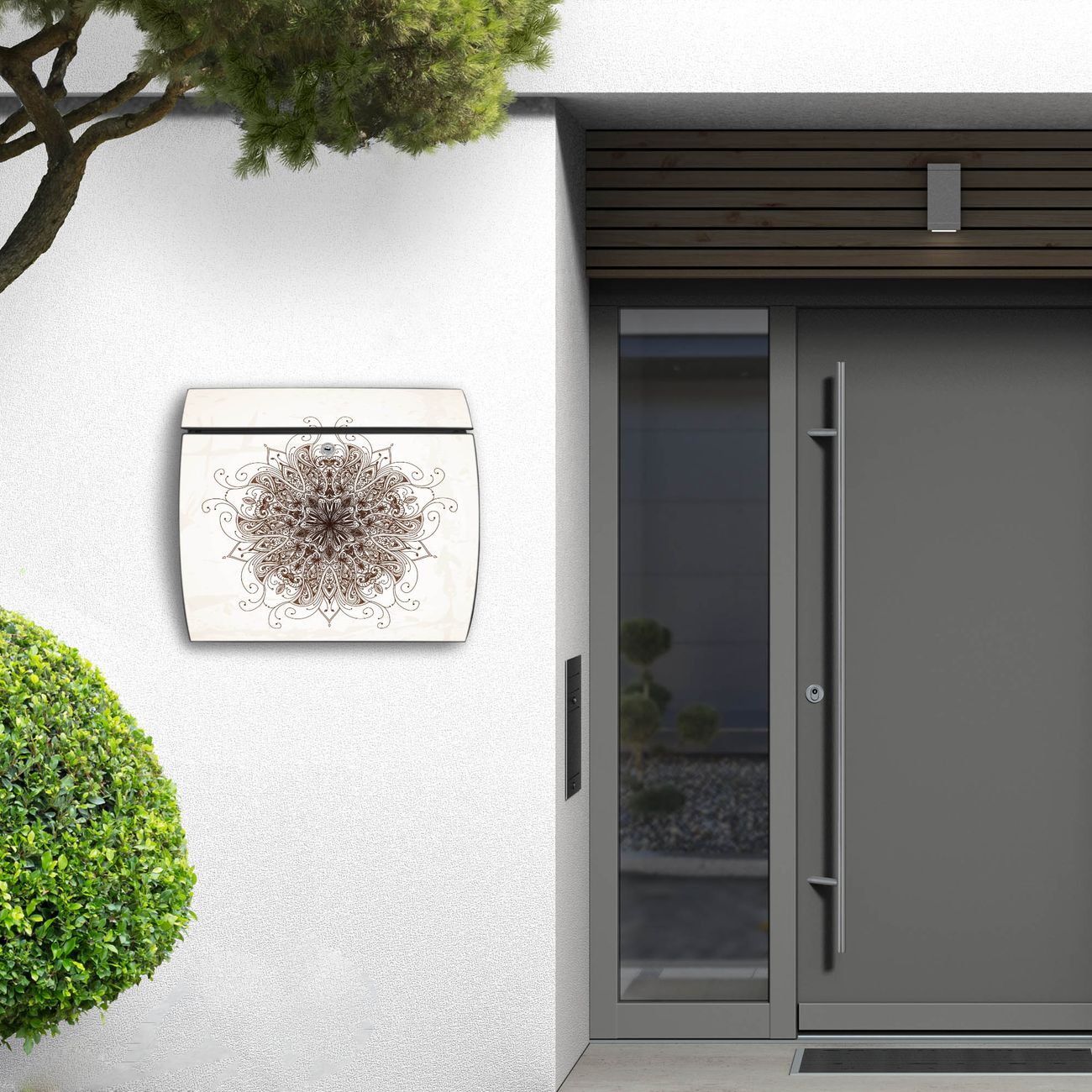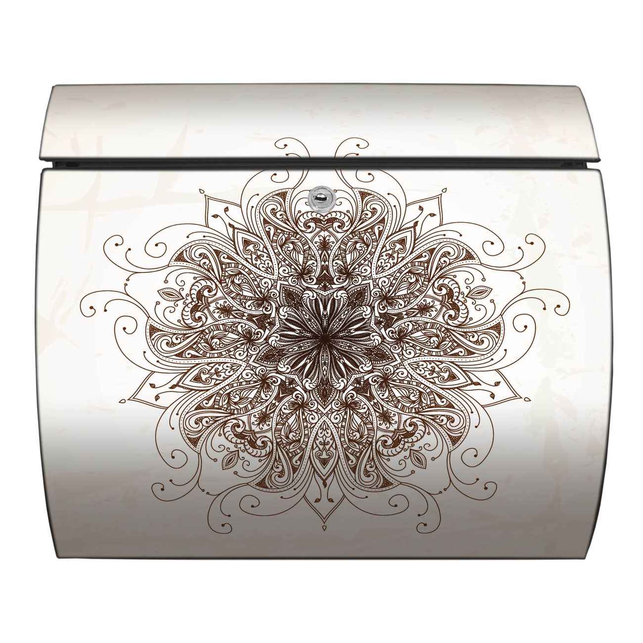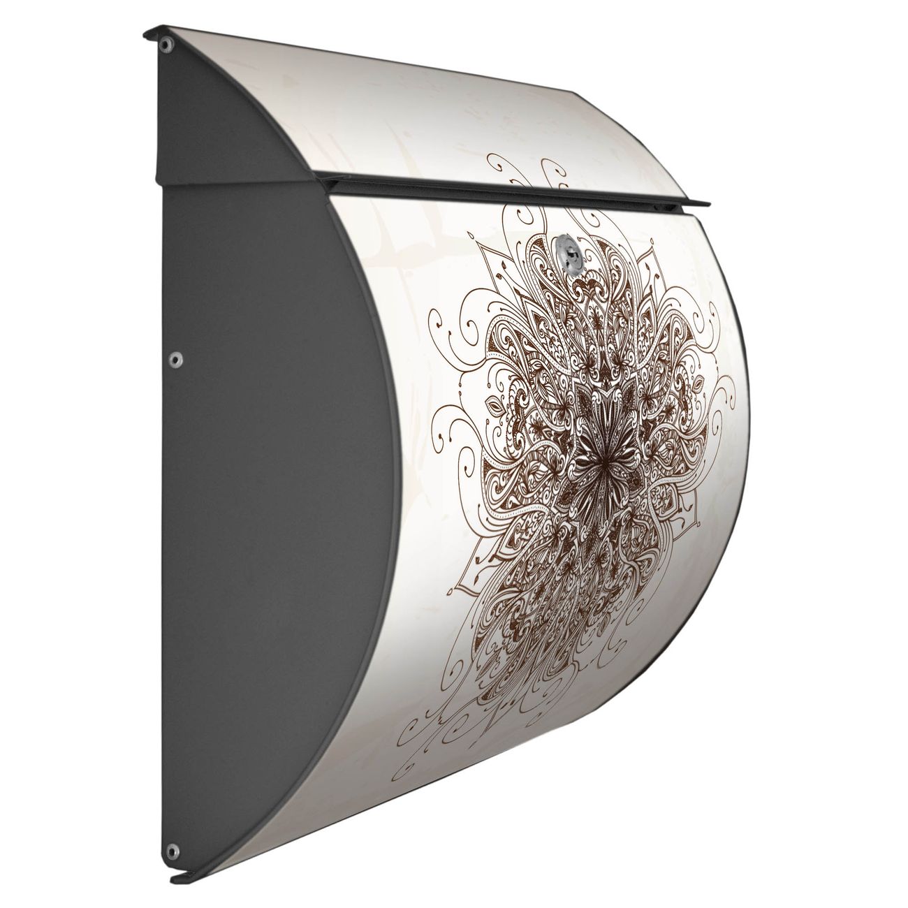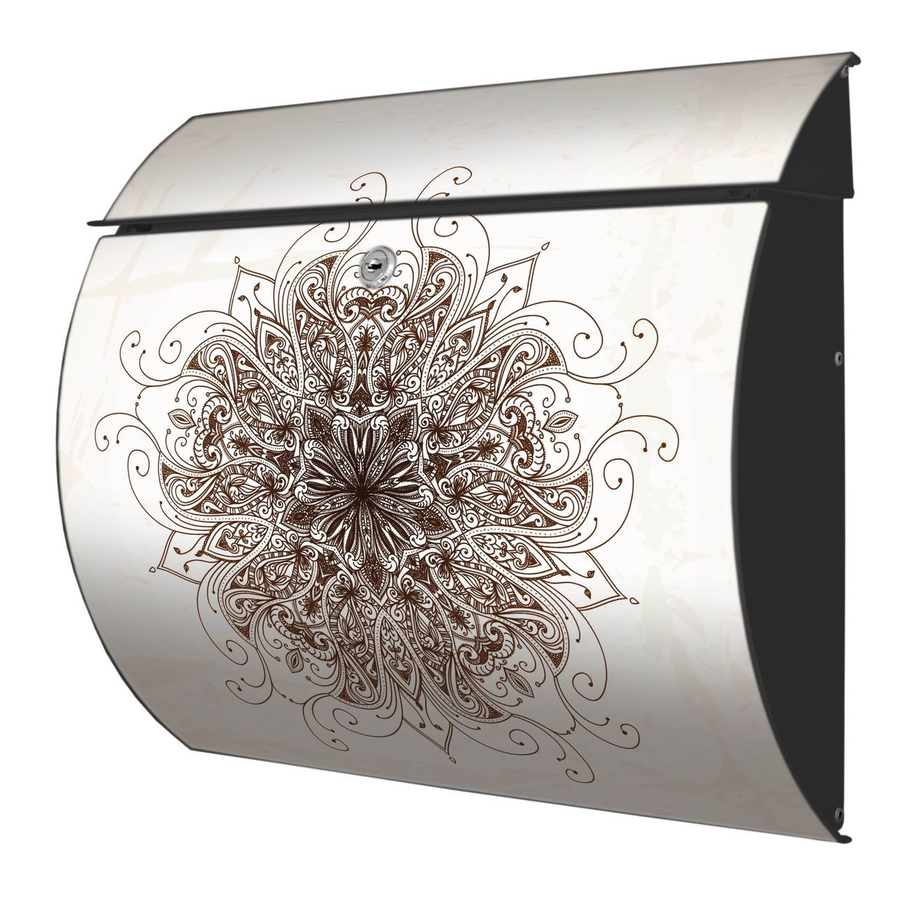 Der geschwungene Burg Wächter Briefkasten Toscana mit Motiv Mehendi bietet Ihnen mit seinem großen Fassungsvermögen genügend Platz auch für große A4 Sendungen. Auf Wunsch können Sie bei uns den passenden Standfuß bestellen und so aus dem Wandbriefkasten einen Standbriefkasten machen. Der integrierte Öffnungsstopp ermöglicht eine einfache Handhabung beim Entnehmen der Post.