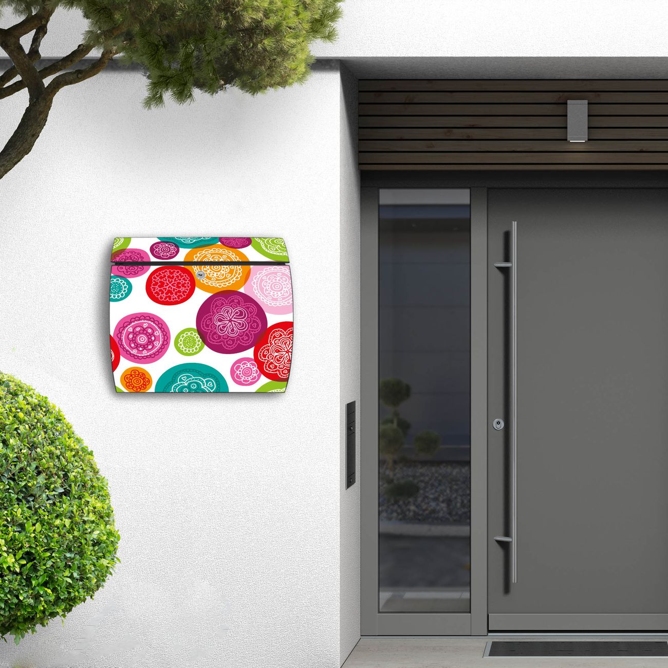 Der geschwungene Burg Wächter Briefkasten Toscana mit Motiv Naive Blüten bietet Ihnen mit seinem großen Fassungsvermögen genügend Platz auch für große A4 Sendungen. Auf Wunsch können Sie bei uns den passenden Standfuß bestellen und so aus dem Wandbriefkasten einen Standbriefkasten machen. Der integrierte Öffnungsstopp ermöglicht eine einfache Handhabung beim Entnehmen der Post.