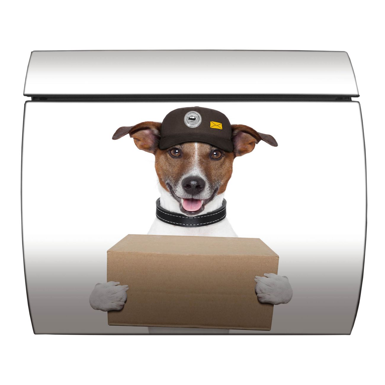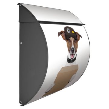 Der geschwungene Burg Wächter Briefkasten Toscana mit Motiv Paketdienst Jack Russel bietet Ihnen mit seinem großen Fassungsvermögen genügend Platz auch für große A4 Sendungen. Auf Wunsch können Sie bei uns den passenden Standfuß bestellen und so aus dem Wandbriefkasten einen Standbriefkasten machen. Der integrierte Öffnungsstopp ermöglicht eine einfache Handhabung beim Entnehmen der Post.