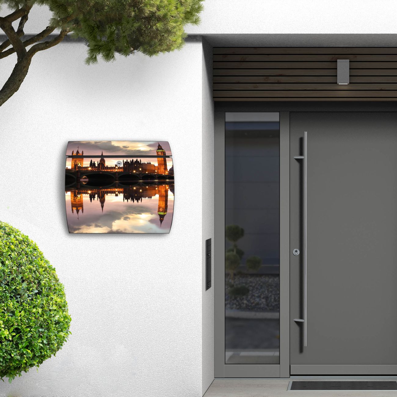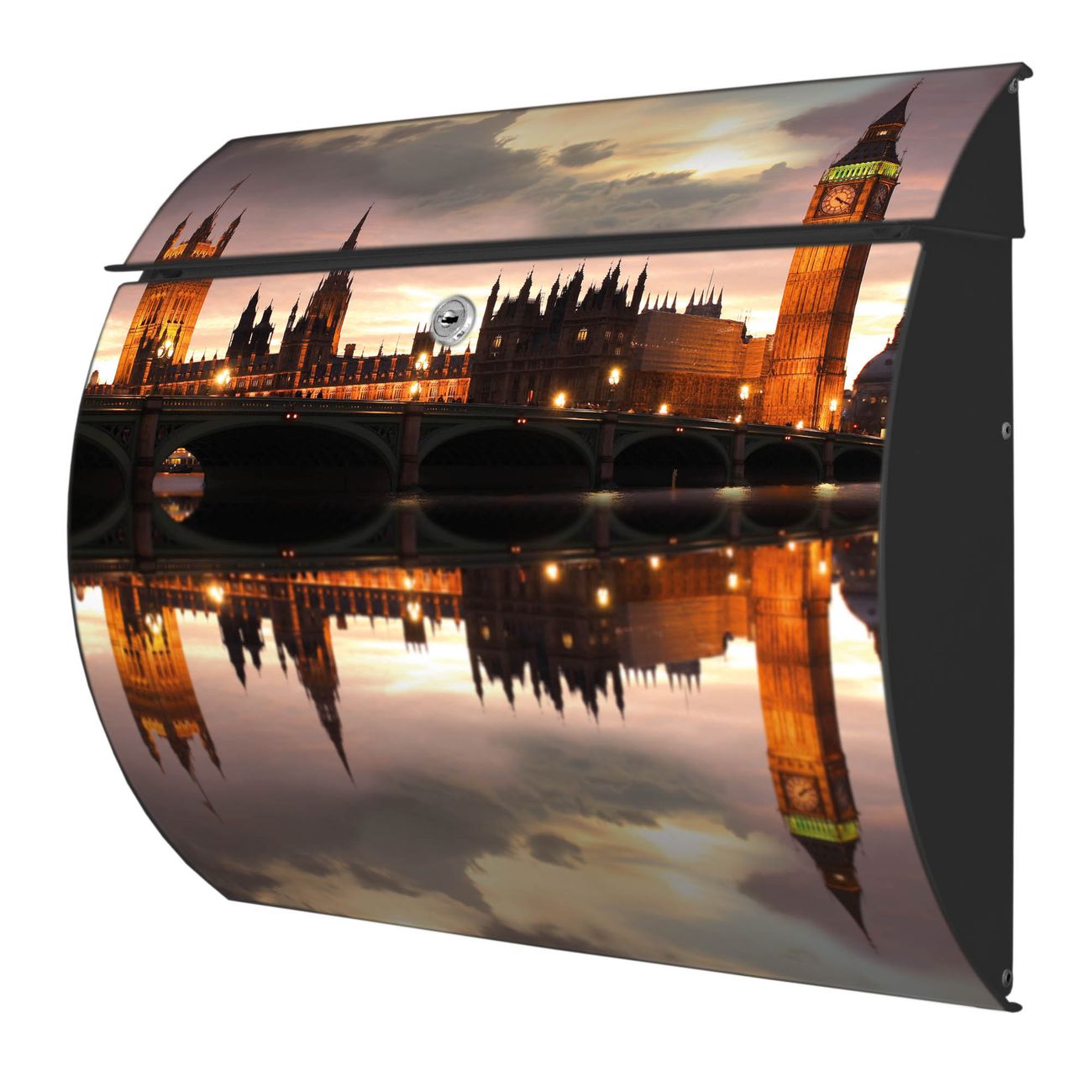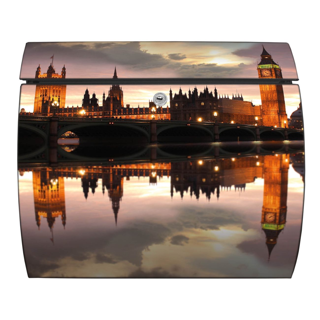 FUNKTION: DESIGN: Das Burg Wächter Modell Toscana mit Motiv Palace of Westminster hat ein sehr ansprechendes und zeitloses Design und ist besonderes wetterfest. Heben Sie Sich von der tristen grauen Masse ab, ohne auf Funktionalität zu verzichten. Wir bieten Ihnen ebenfalls Namensschilder, bereits beschriftet oder frei zu beschriften, und verschiedene selbst gestaltete Bitte-Keine-Werbung-Aufkleber. DETAILS: Der Postkasten besteht aus vollflächig verzinktem Stahl welcher in Anthrazit oder Weiß lackiert wurde oder aus Edelstahl (je nach gewählter Variante). Das Motiv besteht aus einer wetter- und UV-festen Folie, die mit einem Schutzlaminat überzogen ist, durch die Ihren Briefkasten zusätzlich vor Kratzern geschützt ist und auf den Briefkasten kaschiert wurde. Sie erhalten zu Ihrem neuen Design Briefkasten 2 Schlüssel sowie das passende Montagematerial. BANJADO: Ihr Briefkasten wird von Burg Wächter in Deutschland gefertigt und in unserer kleinen Manufaktur von Hand veredelt. Die Motivfolie ist lösungsmittelfrei und schutzlaminiert, dies sorgt für einen langen Halt. Wir legen großen Wert auf die Verbindung von Funktionalität und Design. Sie erhalten besondere Handarbeit aus Sachsen und Made in Germany.