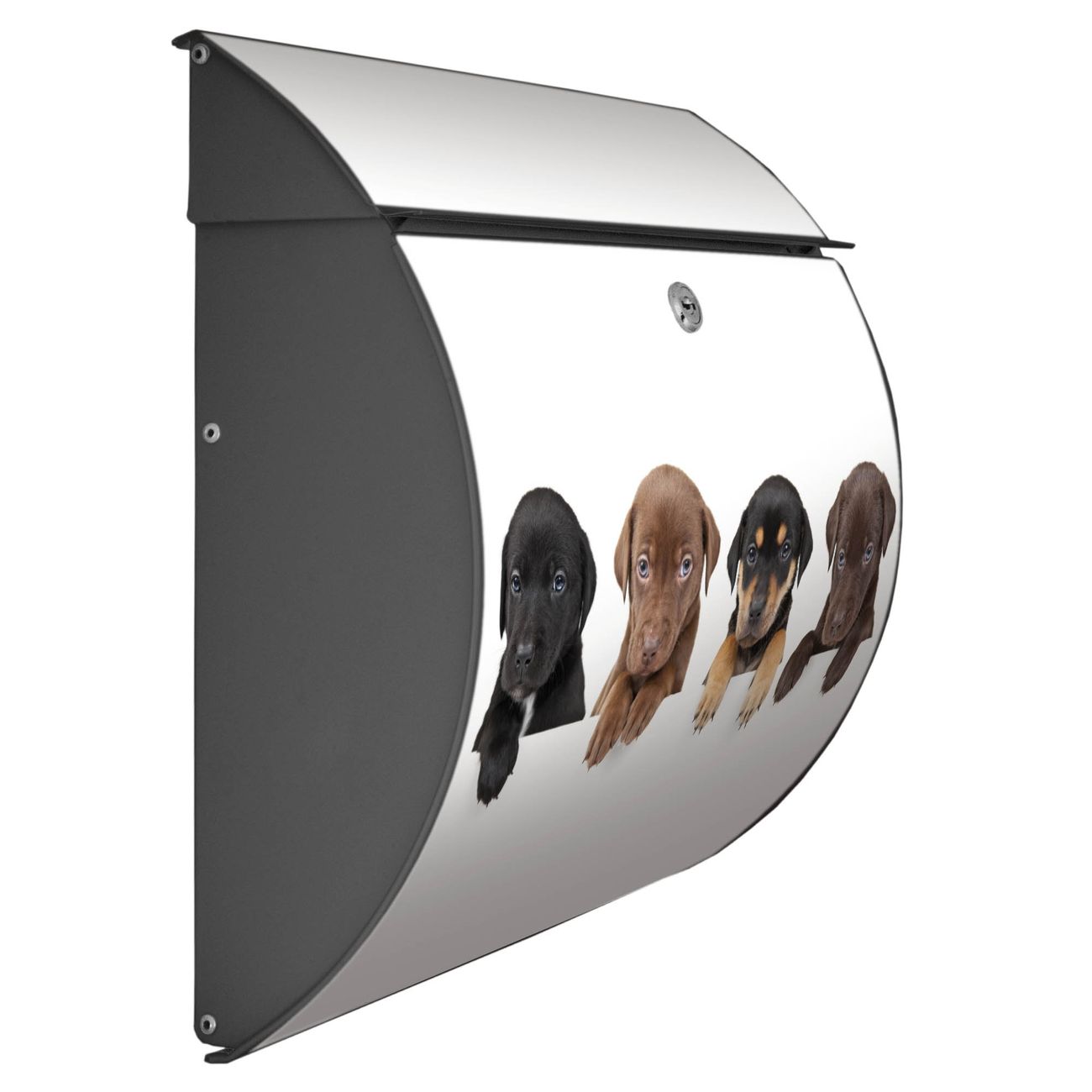 Der geschwungene Burg Wächter Briefkasten Toscana mit Motiv Puppies bietet Ihnen mit seinem großen Fassungsvermögen genügend Platz auch für große A4 Sendungen. Auf Wunsch können Sie bei uns den passenden Standfuß bestellen und so aus dem Wandbriefkasten einen Standbriefkasten machen. Der integrierte Öffnungsstopp ermöglicht eine einfache Handhabung beim Entnehmen der Post.