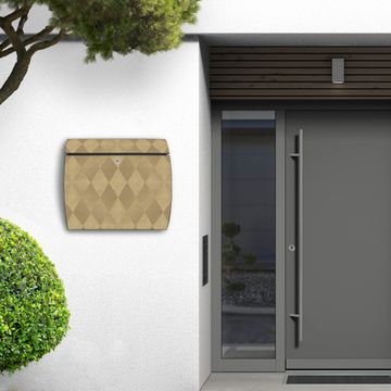Der geschwungene Burg Wächter Briefkasten Toscana mit Motiv Rauten Metall bietet Ihnen mit seinem großen Fassungsvermögen genügend Platz auch für große A4 Sendungen. Auf Wunsch können Sie bei uns den passenden Standfuß bestellen und so aus dem Wandbriefkasten einen Standbriefkasten machen. Der integrierte Öffnungsstopp ermöglicht eine einfache Handhabung beim Entnehmen der Post.