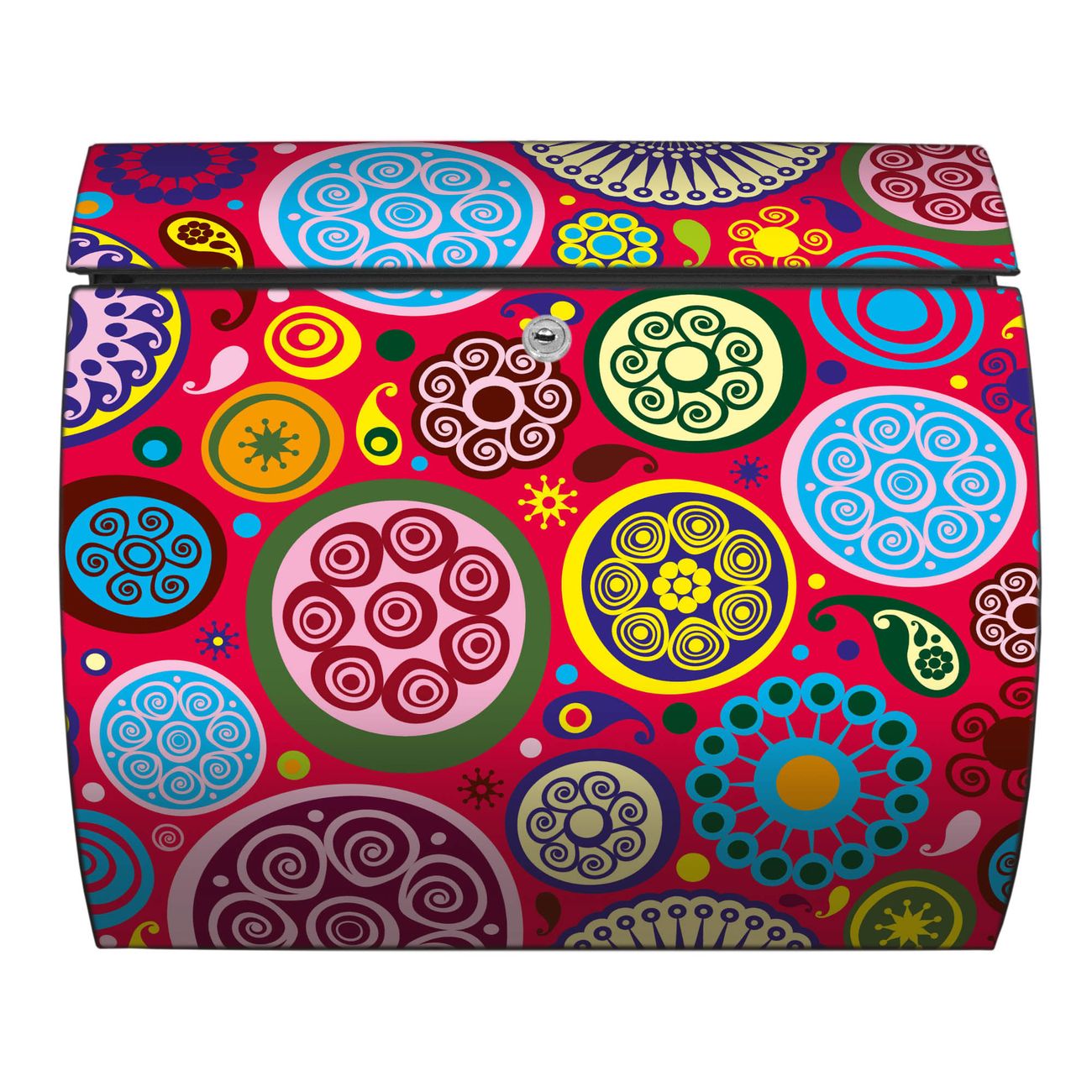Der geschwungene Burg Wächter Briefkasten Toscana mit Motiv Retro Kreise bietet Ihnen mit seinem großen Fassungsvermögen genügend Platz auch für große A4 Sendungen. Auf Wunsch können Sie bei uns den passenden Standfuß bestellen und so aus dem Wandbriefkasten einen Standbriefkasten machen. Der integrierte Öffnungsstopp ermöglicht eine einfache Handhabung beim Entnehmen der Post.