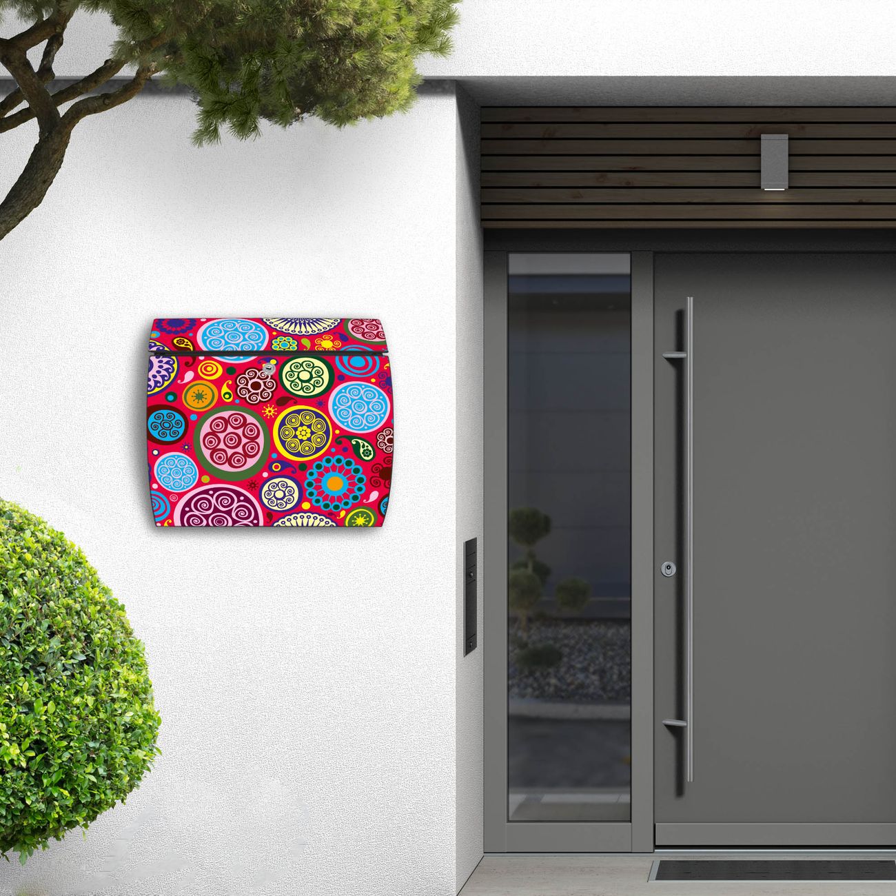 FUNKTION: DESIGN: Das Burg Wächter Modell Toscana mit Motiv Retro Kreise hat ein sehr ansprechendes und zeitloses Design und ist besonderes wetterfest. Heben Sie Sich von der tristen grauen Masse ab, ohne auf Funktionalität zu verzichten. Wir bieten Ihnen ebenfalls Namensschilder, bereits beschriftet oder frei zu beschriften, und verschiedene selbst gestaltete Bitte-Keine-Werbung-Aufkleber. DETAILS: Der Postkasten besteht aus vollflächig verzinktem Stahl welcher in Anthrazit oder Weiß lackiert wurde oder aus Edelstahl (je nach gewählter Variante). Das Motiv besteht aus einer wetter- und UV-festen Folie, die mit einem Schutzlaminat überzogen ist, durch die Ihren Briefkasten zusätzlich vor Kratzern geschützt ist und auf den Briefkasten kaschiert wurde. Sie erhalten zu Ihrem neuen Design Briefkasten 2 Schlüssel sowie das passende Montagematerial. BANJADO: Ihr Briefkasten wird von Burg Wächter in Deutschland gefertigt und in unserer kleinen Manufaktur von Hand veredelt. Die Motivfolie ist lösungsmittelfrei und schutzlaminiert, dies sorgt für einen langen Halt. Wir legen großen Wert auf die Verbindung von Funktionalität und Design. Sie erhalten besondere Handarbeit aus Sachsen und Made in Germany.
