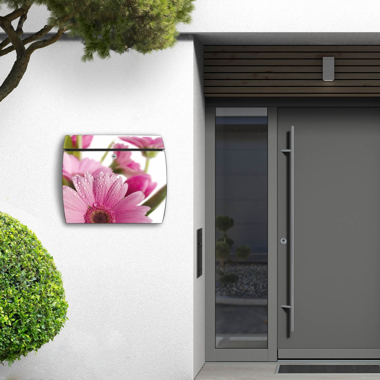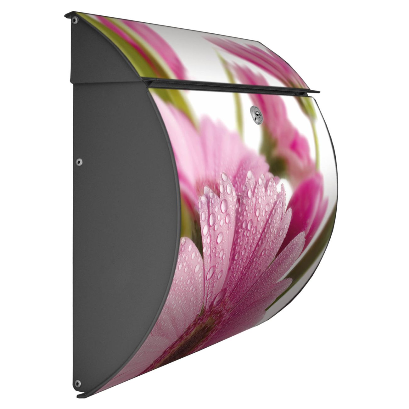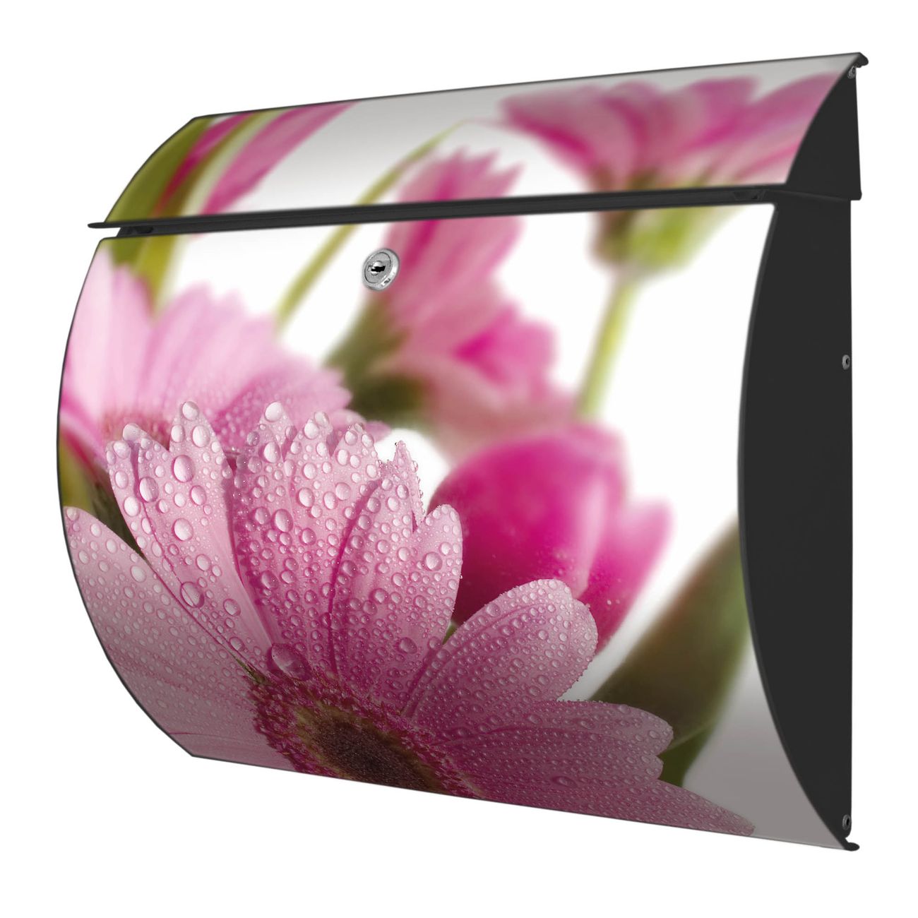 FUNKTION: DESIGN: Das Burg Wächter Modell Toscana mit Motiv Rosa Gerbera hat ein sehr ansprechendes und zeitloses Design und ist besonderes wetterfest. Heben Sie Sich von der tristen grauen Masse ab, ohne auf Funktionalität zu verzichten. Wir bieten Ihnen ebenfalls Namensschilder, bereits beschriftet oder frei zu beschriften, und verschiedene selbst gestaltete Bitte-Keine-Werbung-Aufkleber. DETAILS: Der Postkasten besteht aus vollflächig verzinktem Stahl welcher in Anthrazit oder Weiß lackiert wurde oder aus Edelstahl (je nach gewählter Variante). Das Motiv besteht aus einer wetter- und UV-festen Folie, die mit einem Schutzlaminat überzogen ist, durch die Ihren Briefkasten zusätzlich vor Kratzern geschützt ist und auf den Briefkasten kaschiert wurde. Sie erhalten zu Ihrem neuen Design Briefkasten 2 Schlüssel sowie das passende Montagematerial. BANJADO: Ihr Briefkasten wird von Burg Wächter in Deutschland gefertigt und in unserer kleinen Manufaktur von Hand veredelt. Die Motivfolie ist lösungsmittelfrei und schutzlaminiert, dies sorgt für einen langen Halt. Wir legen großen Wert auf die Verbindung von Funktionalität und Design. Sie erhalten besondere Handarbeit aus Sachsen und Made in Germany.