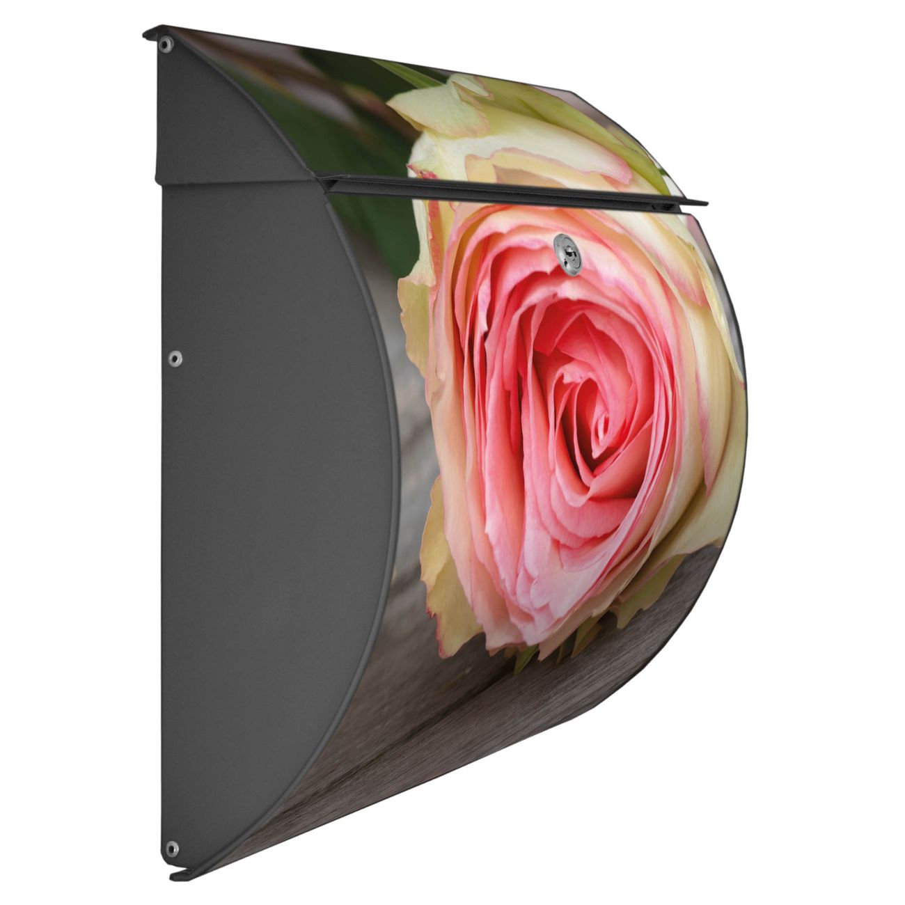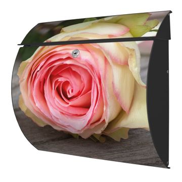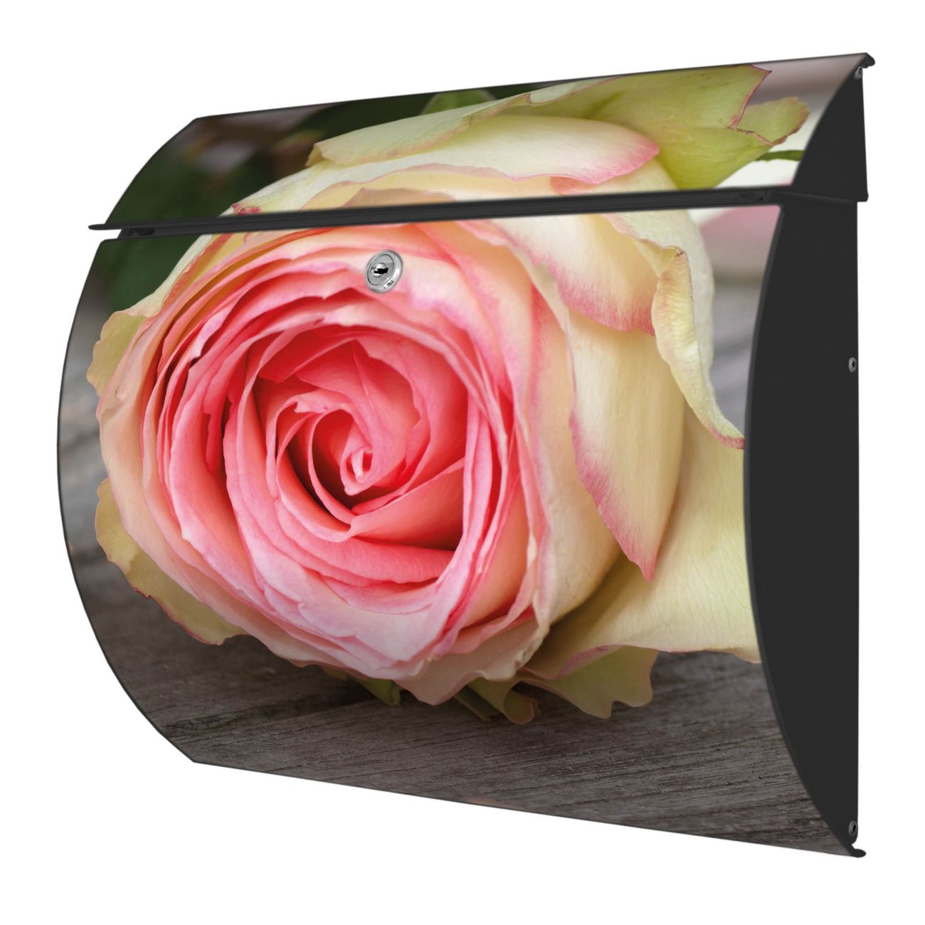 Der geschwungene Burg Wächter Briefkasten Toscana mit Motiv Rosa Rose bietet Ihnen mit seinem großen Fassungsvermögen genügend Platz auch für große A4 Sendungen. Auf Wunsch können Sie bei uns den passenden Standfuß bestellen und so aus dem Wandbriefkasten einen Standbriefkasten machen. Der integrierte Öffnungsstopp ermöglicht eine einfache Handhabung beim Entnehmen der Post.
