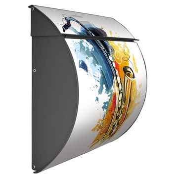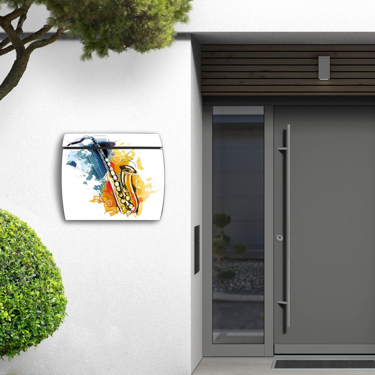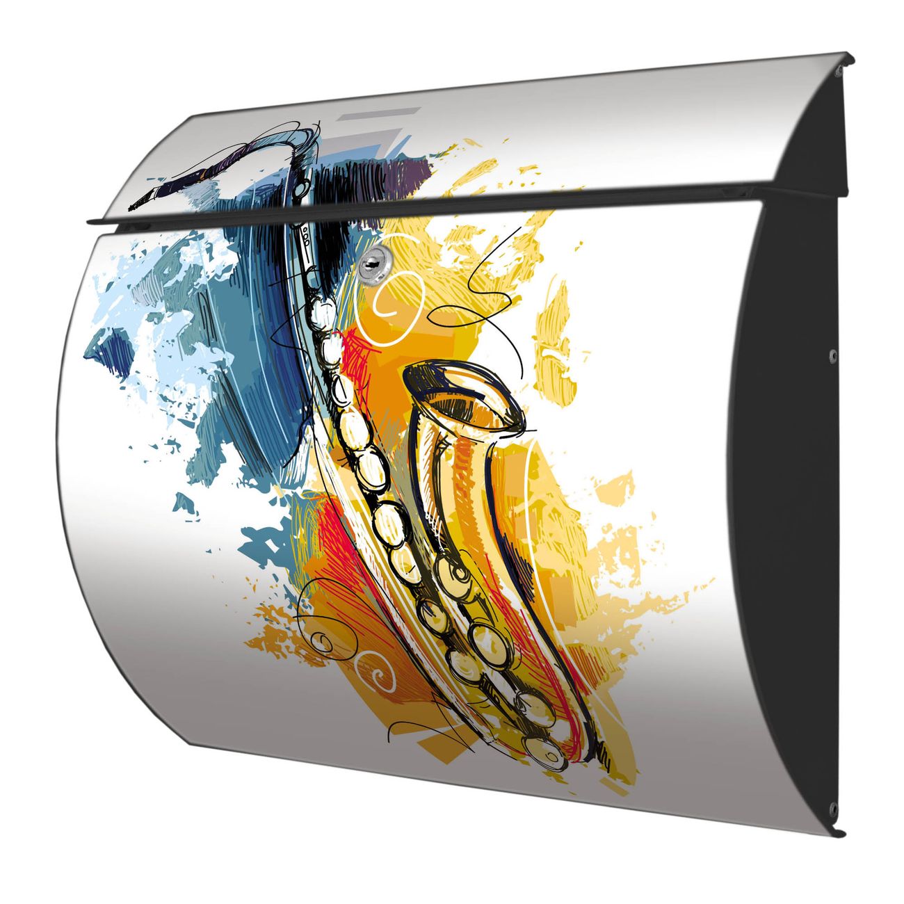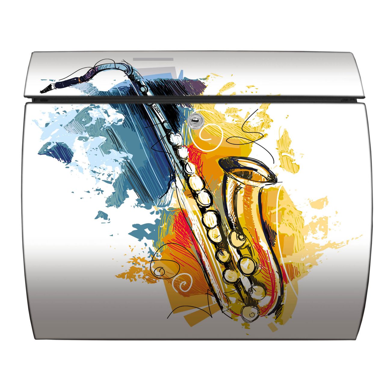 FUNKTION: DESIGN: Das Burg Wächter Modell Toscana mit Motiv Saxophon hat ein sehr ansprechendes und zeitloses Design und ist besonderes wetterfest. Heben Sie Sich von der tristen grauen Masse ab, ohne auf Funktionalität zu verzichten. Wir bieten Ihnen ebenfalls Namensschilder, bereits beschriftet oder frei zu beschriften, und verschiedene selbst gestaltete Bitte-Keine-Werbung-Aufkleber. DETAILS: Der Postkasten besteht aus vollflächig verzinktem Stahl welcher in Anthrazit oder Weiß lackiert wurde oder aus Edelstahl (je nach gewählter Variante). Das Motiv besteht aus einer wetter- und UV-festen Folie, die mit einem Schutzlaminat überzogen ist, durch die Ihren Briefkasten zusätzlich vor Kratzern geschützt ist und auf den Briefkasten kaschiert wurde. Sie erhalten zu Ihrem neuen Design Briefkasten 2 Schlüssel sowie das passende Montagematerial. BANJADO: Ihr Briefkasten wird von Burg Wächter in Deutschland gefertigt und in unserer kleinen Manufaktur von Hand veredelt. Die Motivfolie ist lösungsmittelfrei und schutzlaminiert, dies sorgt für einen langen Halt. Wir legen großen Wert auf die Verbindung von Funktionalität und Design. Sie erhalten besondere Handarbeit aus Sachsen und Made in Germany.