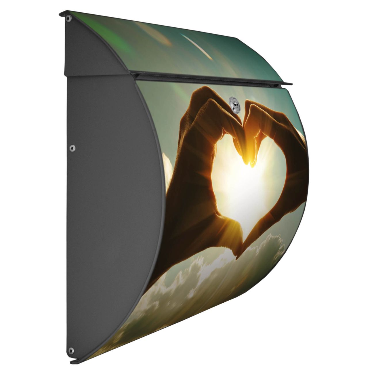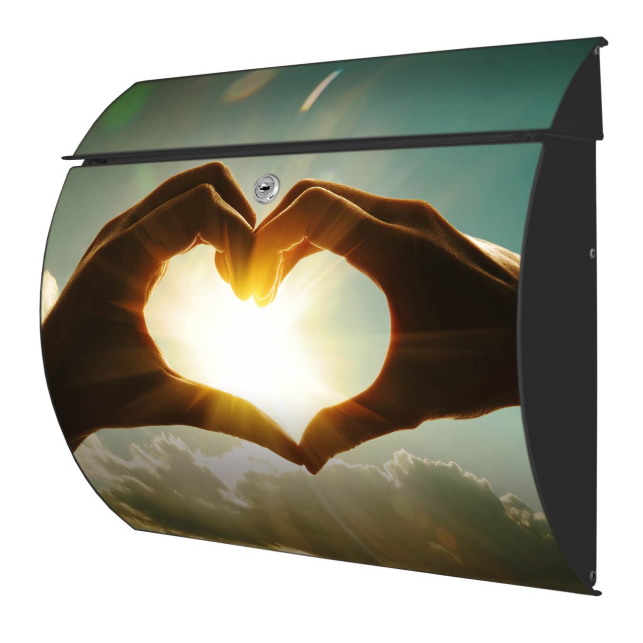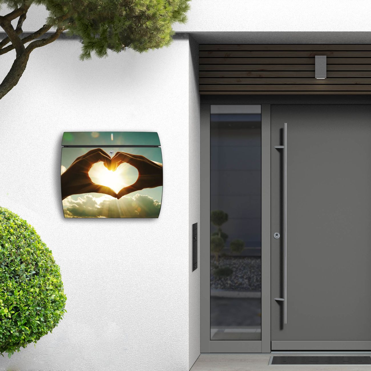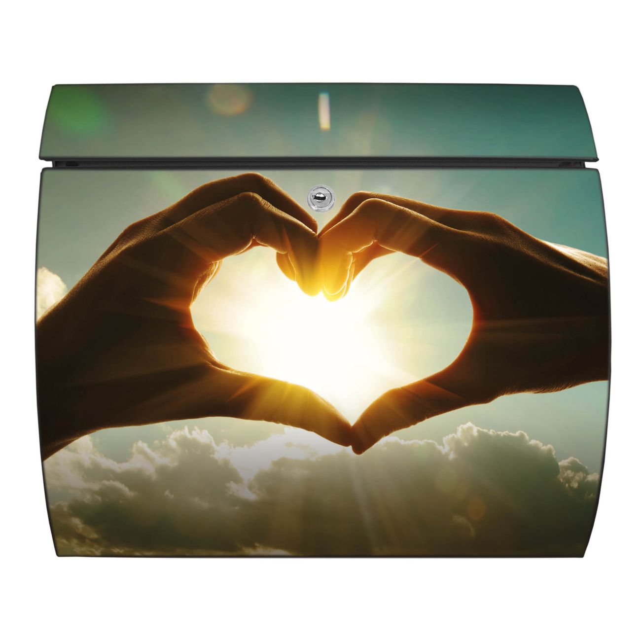 Der geschwungene Burg Wächter Briefkasten Toscana mit Motiv Sonne im Herzen bietet Ihnen mit seinem großen Fassungsvermögen genügend Platz auch für große A4 Sendungen. Auf Wunsch können Sie bei uns den passenden Standfuß bestellen und so aus dem Wandbriefkasten einen Standbriefkasten machen. Der integrierte Öffnungsstopp ermöglicht eine einfache Handhabung beim Entnehmen der Post.