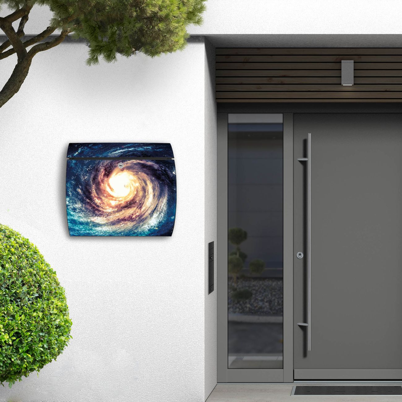 Der geschwungene Burg Wächter Briefkasten Toscana mit Motiv Sternenwirbel bietet Ihnen mit seinem großen Fassungsvermögen genügend Platz auch für große A4 Sendungen. Auf Wunsch können Sie bei uns den passenden Standfuß bestellen und so aus dem Wandbriefkasten einen Standbriefkasten machen. Der integrierte Öffnungsstopp ermöglicht eine einfache Handhabung beim Entnehmen der Post.