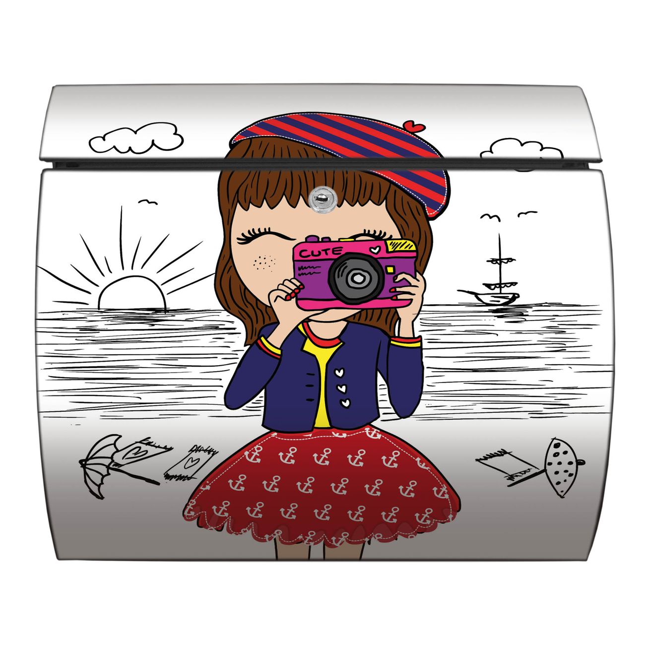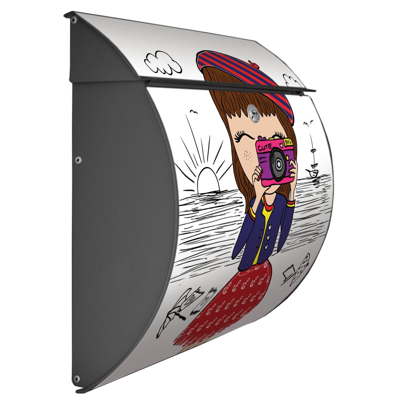 Der geschwungene Burg Wächter Briefkasten Toscana mit Motiv Süße Kamera bietet Ihnen mit seinem großen Fassungsvermögen genügend Platz auch für große A4 Sendungen. Auf Wunsch können Sie bei uns den passenden Standfuß bestellen und so aus dem Wandbriefkasten einen Standbriefkasten machen. Der integrierte Öffnungsstopp ermöglicht eine einfache Handhabung beim Entnehmen der Post.