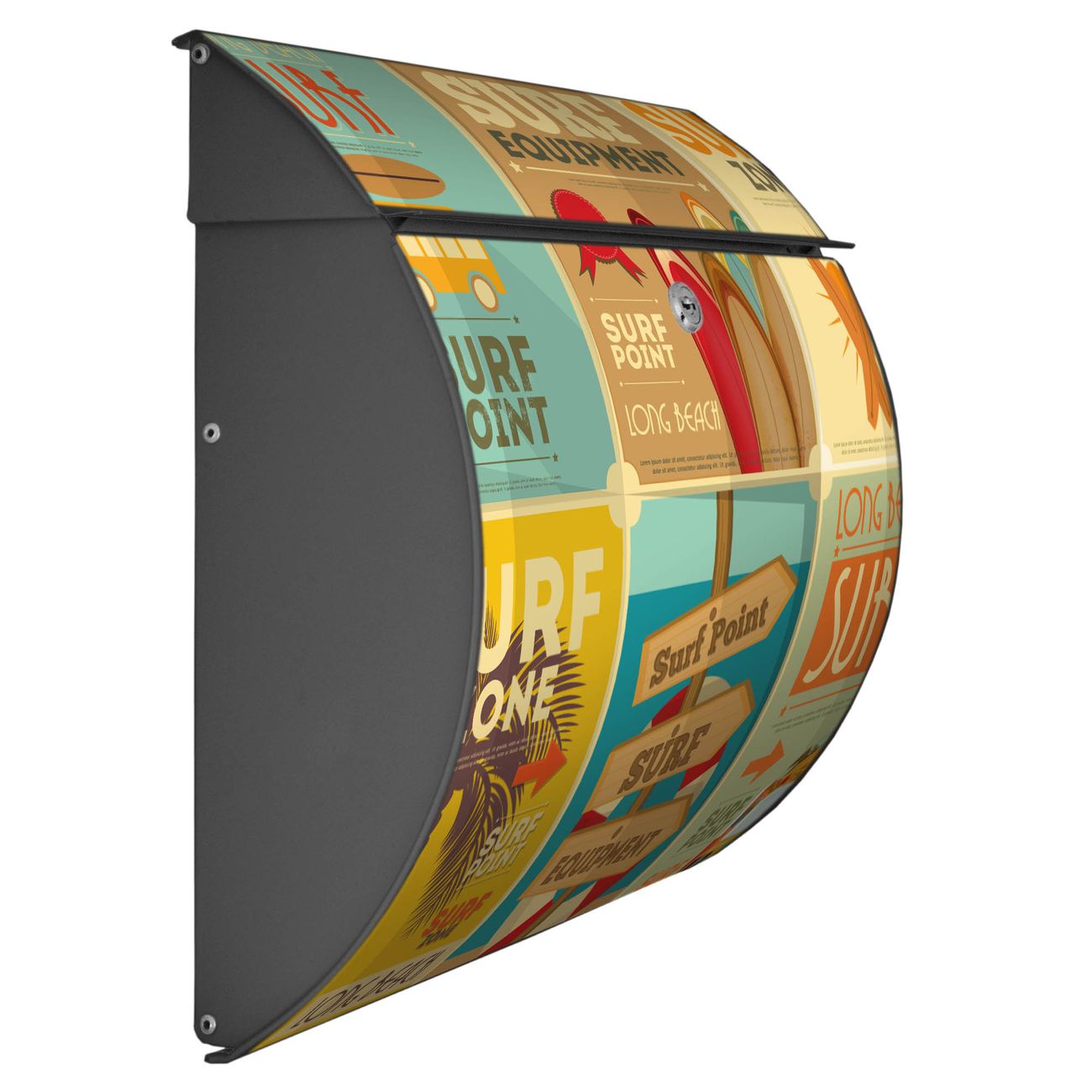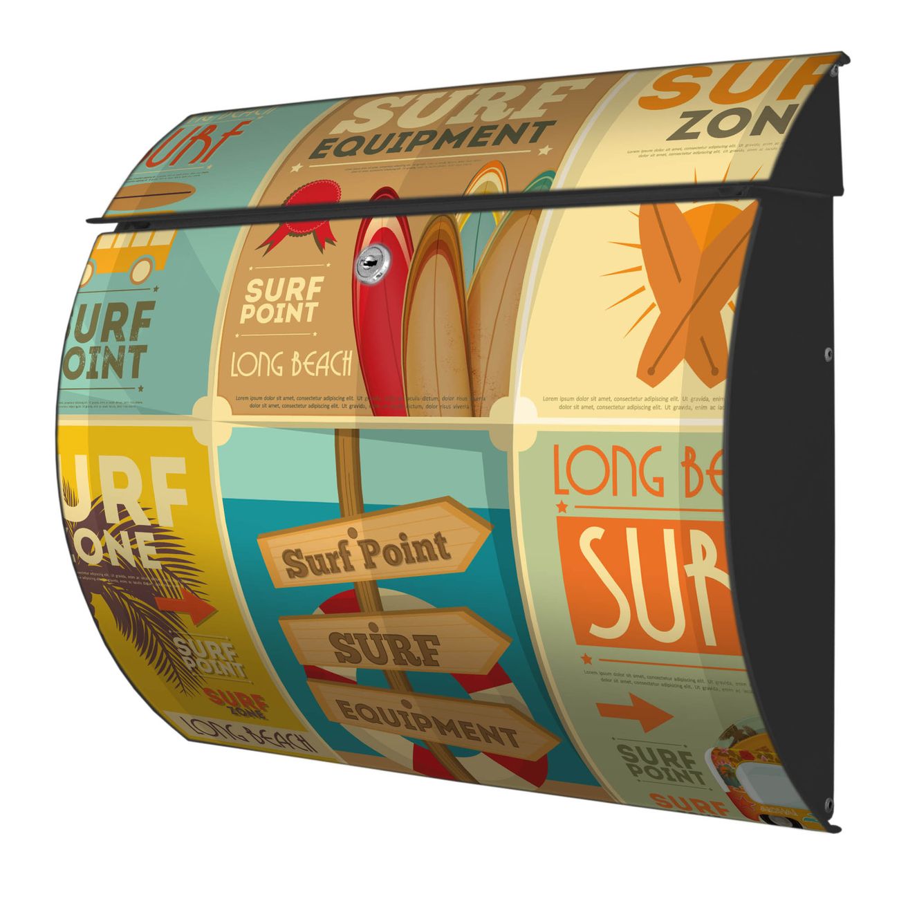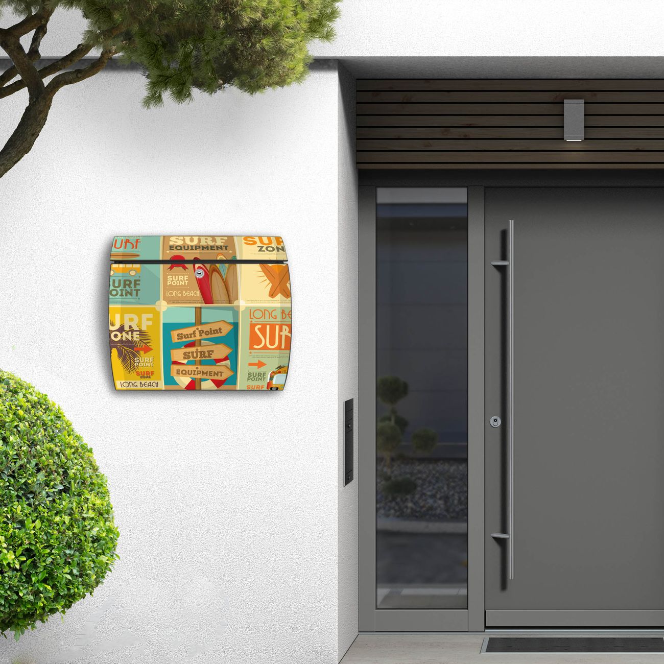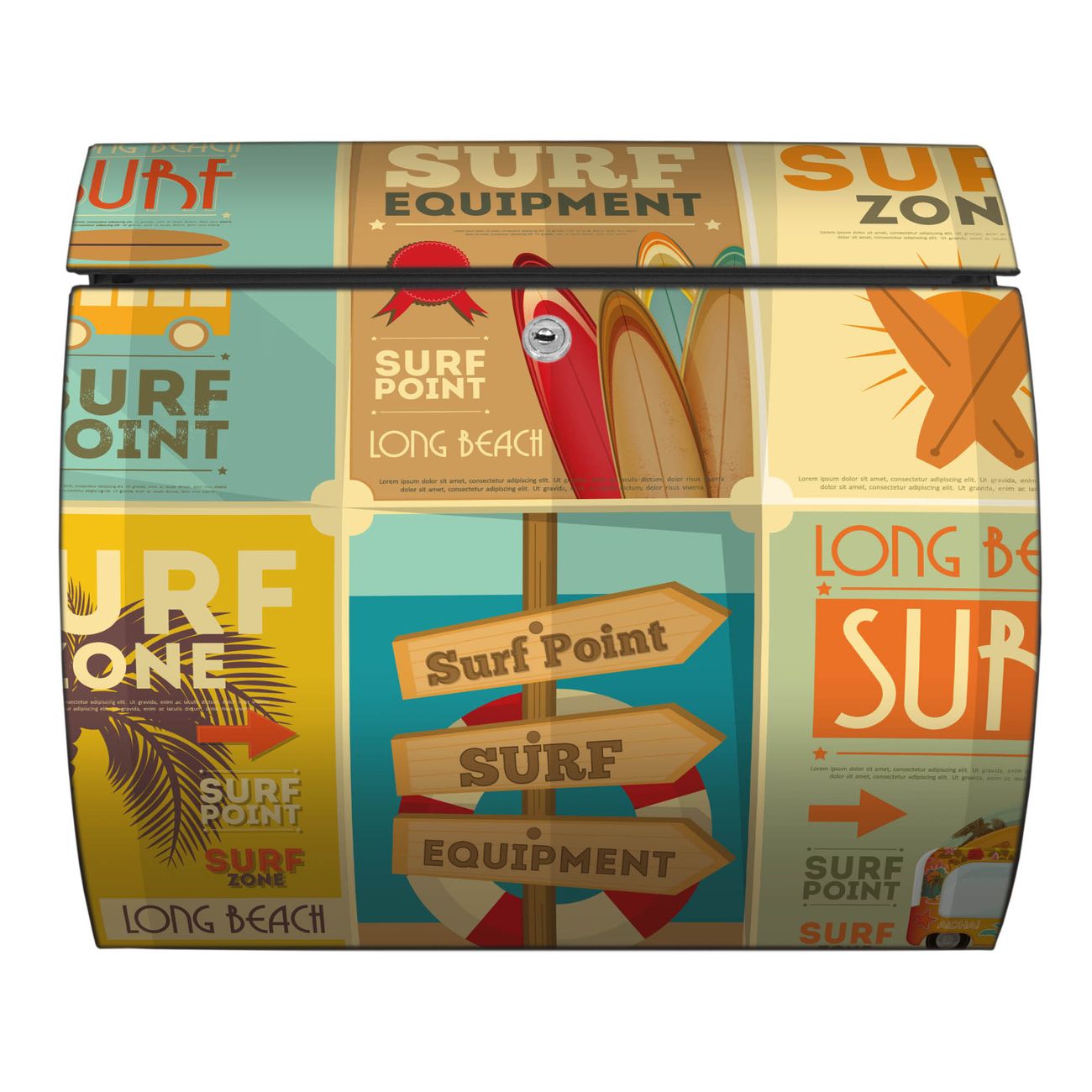 FUNKTION: DESIGN: Das Burg Wächter Modell Toscana mit Motiv Surf Point hat ein sehr ansprechendes und zeitloses Design und ist besonderes wetterfest. Heben Sie Sich von der tristen grauen Masse ab, ohne auf Funktionalität zu verzichten. Wir bieten Ihnen ebenfalls Namensschilder, bereits beschriftet oder frei zu beschriften, und verschiedene selbst gestaltete Bitte-Keine-Werbung-Aufkleber. DETAILS: Der Postkasten besteht aus vollflächig verzinktem Stahl welcher in Anthrazit oder Weiß lackiert wurde oder aus Edelstahl (je nach gewählter Variante). Das Motiv besteht aus einer wetter- und UV-festen Folie, die mit einem Schutzlaminat überzogen ist, durch die Ihren Briefkasten zusätzlich vor Kratzern geschützt ist und auf den Briefkasten kaschiert wurde. Sie erhalten zu Ihrem neuen Design Briefkasten 2 Schlüssel sowie das passende Montagematerial. BANJADO: Ihr Briefkasten wird von Burg Wächter in Deutschland gefertigt und in unserer kleinen Manufaktur von Hand veredelt. Die Motivfolie ist lösungsmittelfrei und schutzlaminiert, dies sorgt für einen langen Halt. Wir legen großen Wert auf die Verbindung von Funktionalität und Design. Sie erhalten besondere Handarbeit aus Sachsen und Made in Germany.