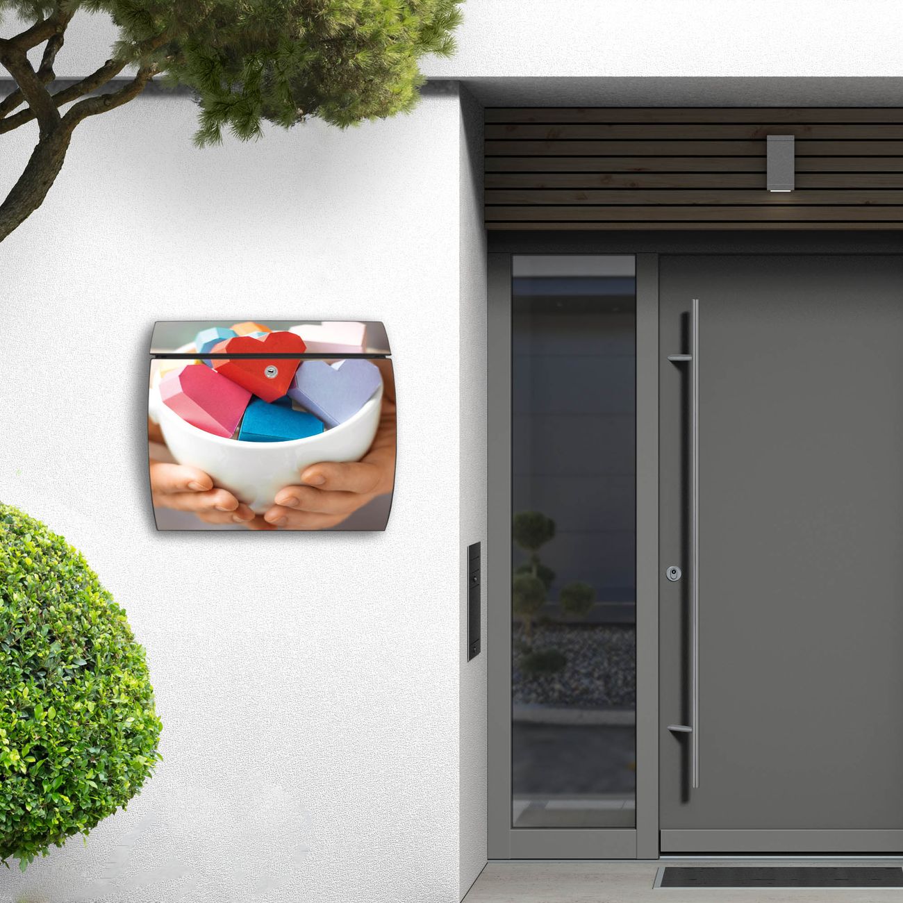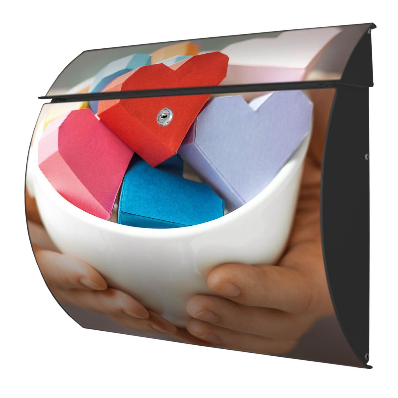 FUNKTION: DESIGN: Das Burg Wächter Modell Toscana mit Motiv Tasse voller Herzen hat ein sehr ansprechendes und zeitloses Design und ist besonderes wetterfest. Heben Sie Sich von der tristen grauen Masse ab, ohne auf Funktionalität zu verzichten. Wir bieten Ihnen ebenfalls Namensschilder, bereits beschriftet oder frei zu beschriften, und verschiedene selbst gestaltete Bitte-Keine-Werbung-Aufkleber. DETAILS: Der Postkasten besteht aus vollflächig verzinktem Stahl welcher in Anthrazit oder Weiß lackiert wurde oder aus Edelstahl (je nach gewählter Variante). Das Motiv besteht aus einer wetter- und UV-festen Folie, die mit einem Schutzlaminat überzogen ist, durch die Ihren Briefkasten zusätzlich vor Kratzern geschützt ist und auf den Briefkasten kaschiert wurde. Sie erhalten zu Ihrem neuen Design Briefkasten 2 Schlüssel sowie das passende Montagematerial. BANJADO: Ihr Briefkasten wird von Burg Wächter in Deutschland gefertigt und in unserer kleinen Manufaktur von Hand veredelt. Die Motivfolie ist lösungsmittelfrei und schutzlaminiert, dies sorgt für einen langen Halt. Wir legen großen Wert auf die Verbindung von Funktionalität und Design. Sie erhalten besondere Handarbeit aus Sachsen und Made in Germany.