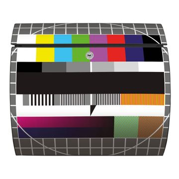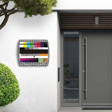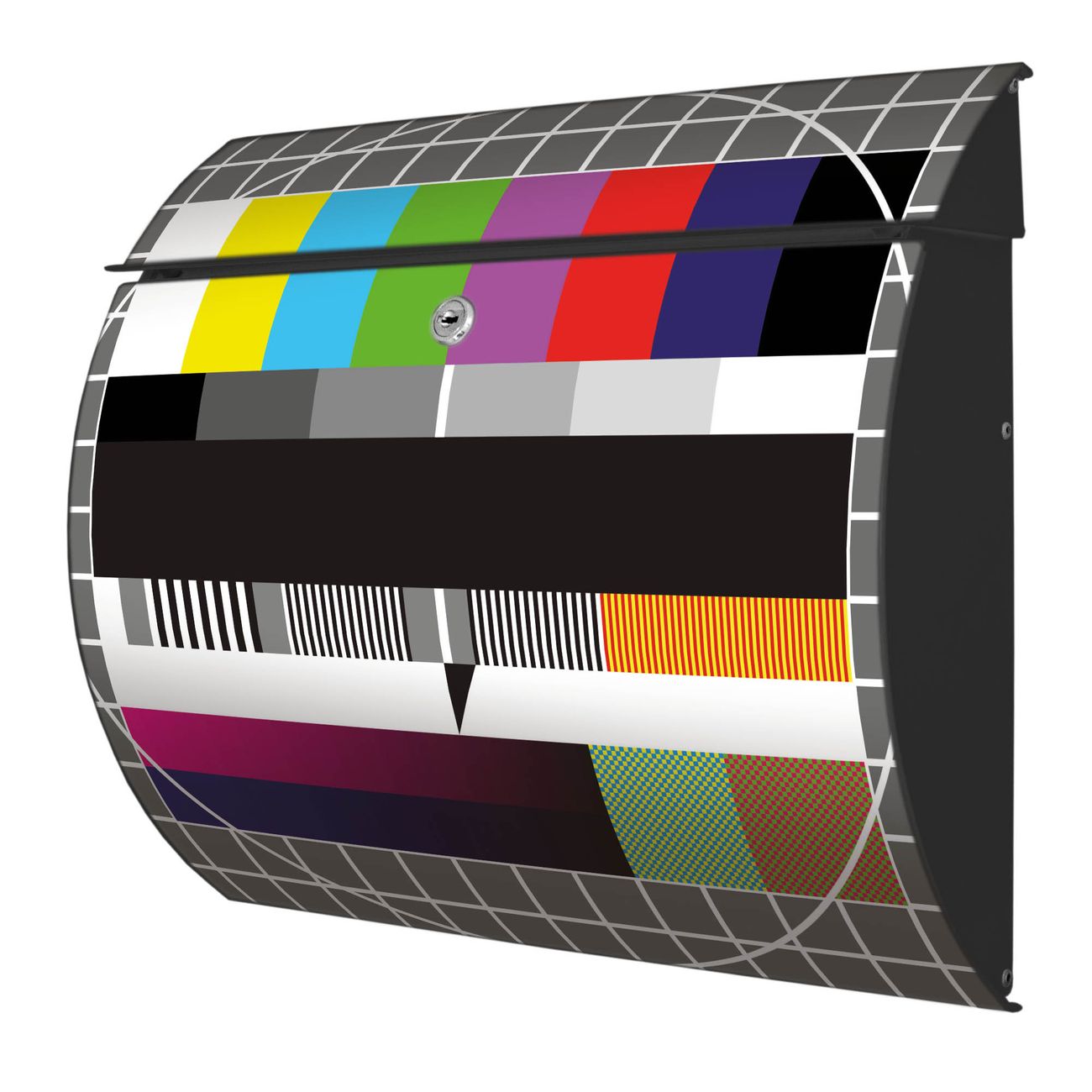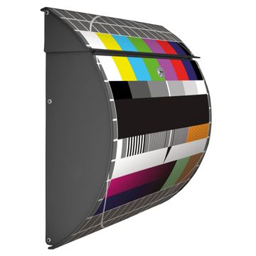Der geschwungene Burg Wächter Briefkasten Toscana mit Motiv Testbild bietet Ihnen mit seinem großen Fassungsvermögen genügend Platz auch für große A4 Sendungen. Auf Wunsch können Sie bei uns den passenden Standfuß bestellen und so aus dem Wandbriefkasten einen Standbriefkasten machen. Der integrierte Öffnungsstopp ermöglicht eine einfache Handhabung beim Entnehmen der Post.
