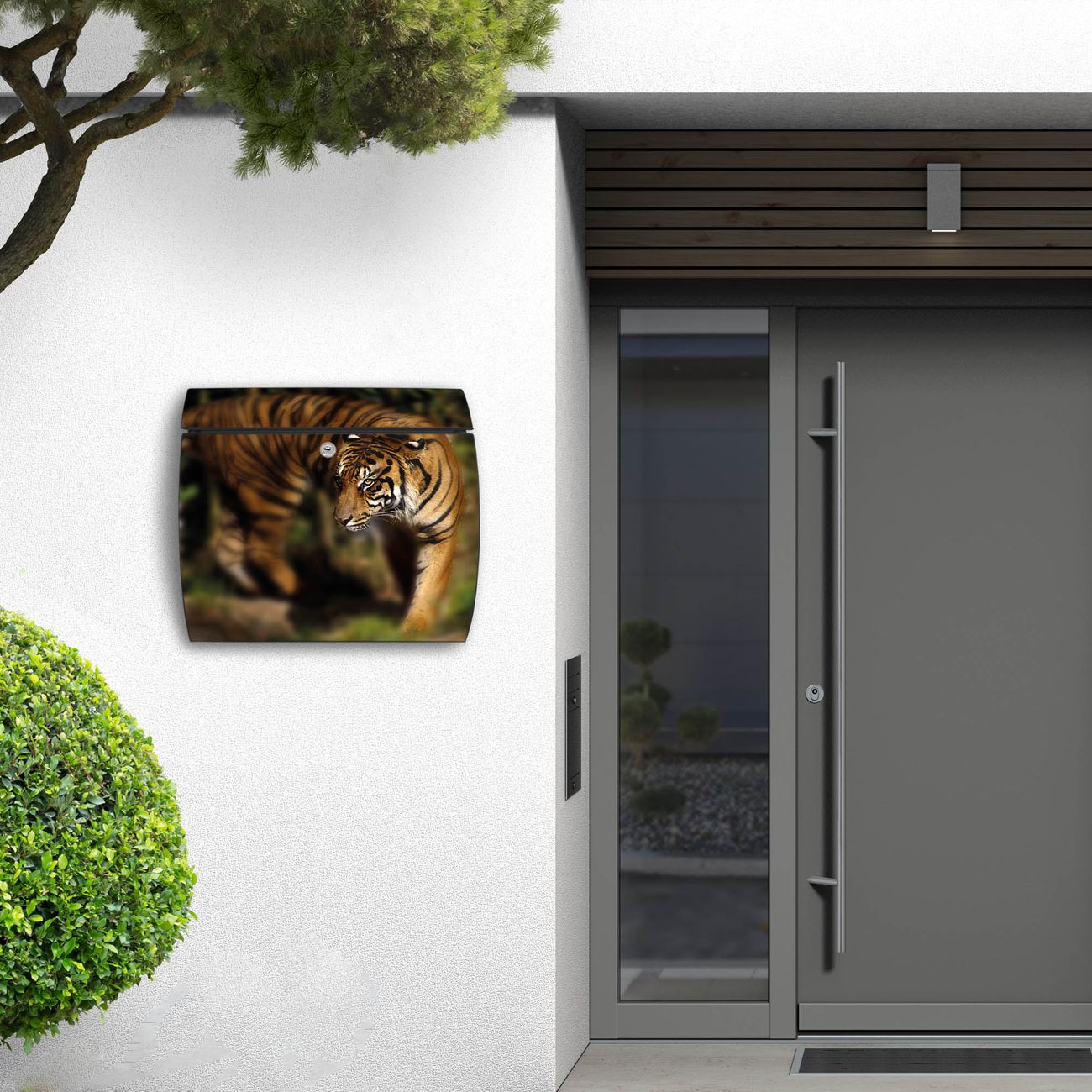 FUNKTION: DESIGN: Das Burg Wächter Modell Toscana mit Motiv Tiger hat ein sehr ansprechendes und zeitloses Design und ist besonderes wetterfest. Heben Sie Sich von der tristen grauen Masse ab, ohne auf Funktionalität zu verzichten. Wir bieten Ihnen ebenfalls Namensschilder, bereits beschriftet oder frei zu beschriften, und verschiedene selbst gestaltete Bitte-Keine-Werbung-Aufkleber. DETAILS: Der Postkasten besteht aus vollflächig verzinktem Stahl welcher in Anthrazit oder Weiß lackiert wurde oder aus Edelstahl (je nach gewählter Variante). Das Motiv besteht aus einer wetter- und UV-festen Folie, die mit einem Schutzlaminat überzogen ist, durch die Ihren Briefkasten zusätzlich vor Kratzern geschützt ist und auf den Briefkasten kaschiert wurde. Sie erhalten zu Ihrem neuen Design Briefkasten 2 Schlüssel sowie das passende Montagematerial. BANJADO: Ihr Briefkasten wird von Burg Wächter in Deutschland gefertigt und in unserer kleinen Manufaktur von Hand veredelt. Die Motivfolie ist lösungsmittelfrei und schutzlaminiert, dies sorgt für einen langen Halt. Wir legen großen Wert auf die Verbindung von Funktionalität und Design. Sie erhalten besondere Handarbeit aus Sachsen und Made in Germany.