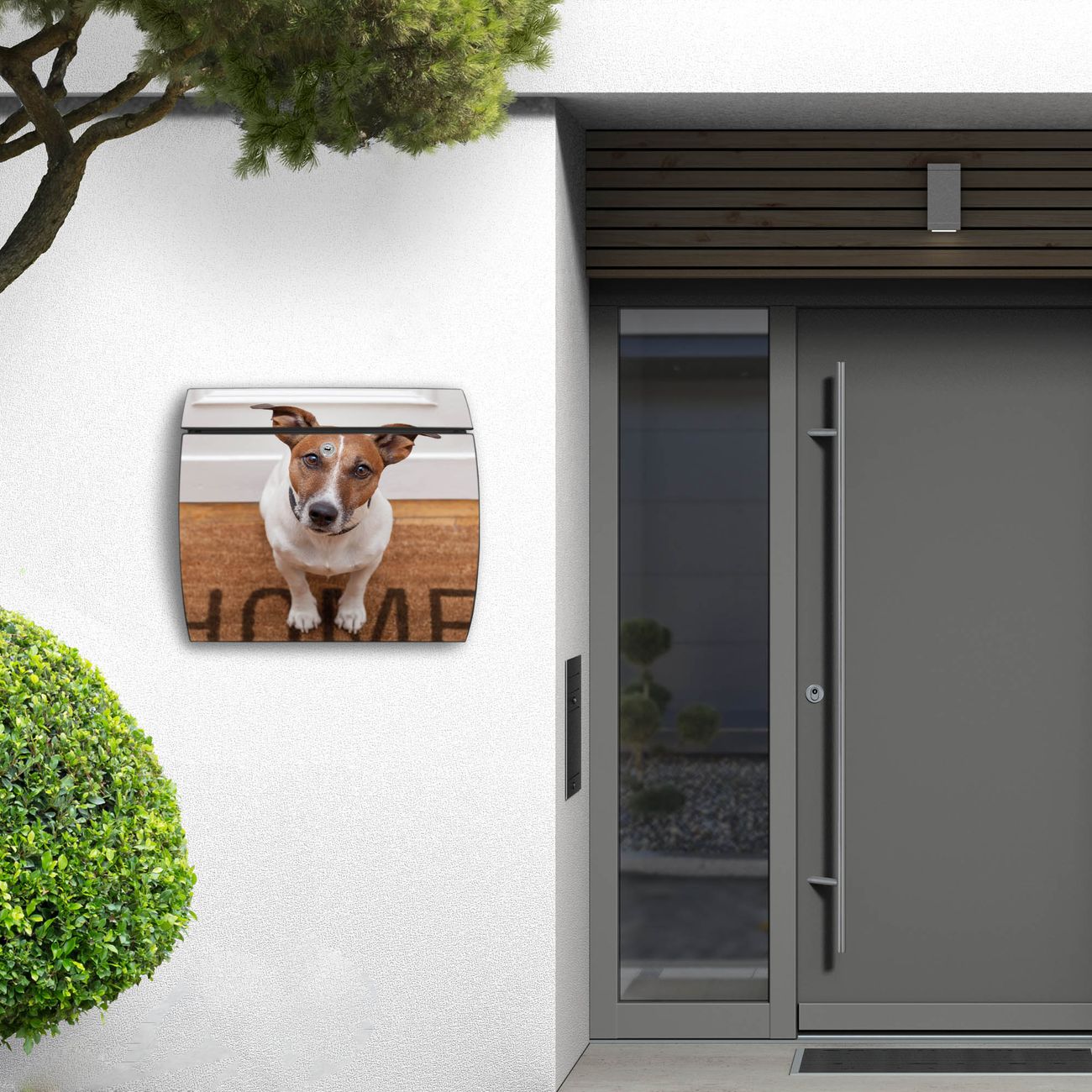 FUNKTION: DESIGN: Das Burg Wächter Modell Toscana mit Motiv Wachhund Jack Russel hat ein sehr ansprechendes und zeitloses Design und ist besonderes wetterfest. Heben Sie Sich von der tristen grauen Masse ab, ohne auf Funktionalität zu verzichten. Wir bieten Ihnen ebenfalls Namensschilder, bereits beschriftet oder frei zu beschriften, und verschiedene selbst gestaltete Bitte-Keine-Werbung-Aufkleber. DETAILS: Der Postkasten besteht aus vollflächig verzinktem Stahl welcher in Anthrazit oder Weiß lackiert wurde oder aus Edelstahl (je nach gewählter Variante). Das Motiv besteht aus einer wetter- und UV-festen Folie, die mit einem Schutzlaminat überzogen ist, durch die Ihren Briefkasten zusätzlich vor Kratzern geschützt ist und auf den Briefkasten kaschiert wurde. Sie erhalten zu Ihrem neuen Design Briefkasten 2 Schlüssel sowie das passende Montagematerial. BANJADO: Ihr Briefkasten wird von Burg Wächter in Deutschland gefertigt und in unserer kleinen Manufaktur von Hand veredelt. Die Motivfolie ist lösungsmittelfrei und schutzlaminiert, dies sorgt für einen langen Halt. Wir legen großen Wert auf die Verbindung von Funktionalität und Design. Sie erhalten besondere Handarbeit aus Sachsen und Made in Germany.