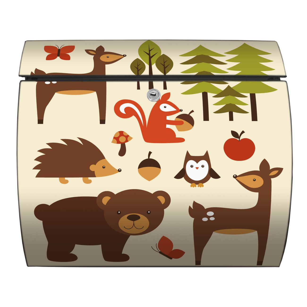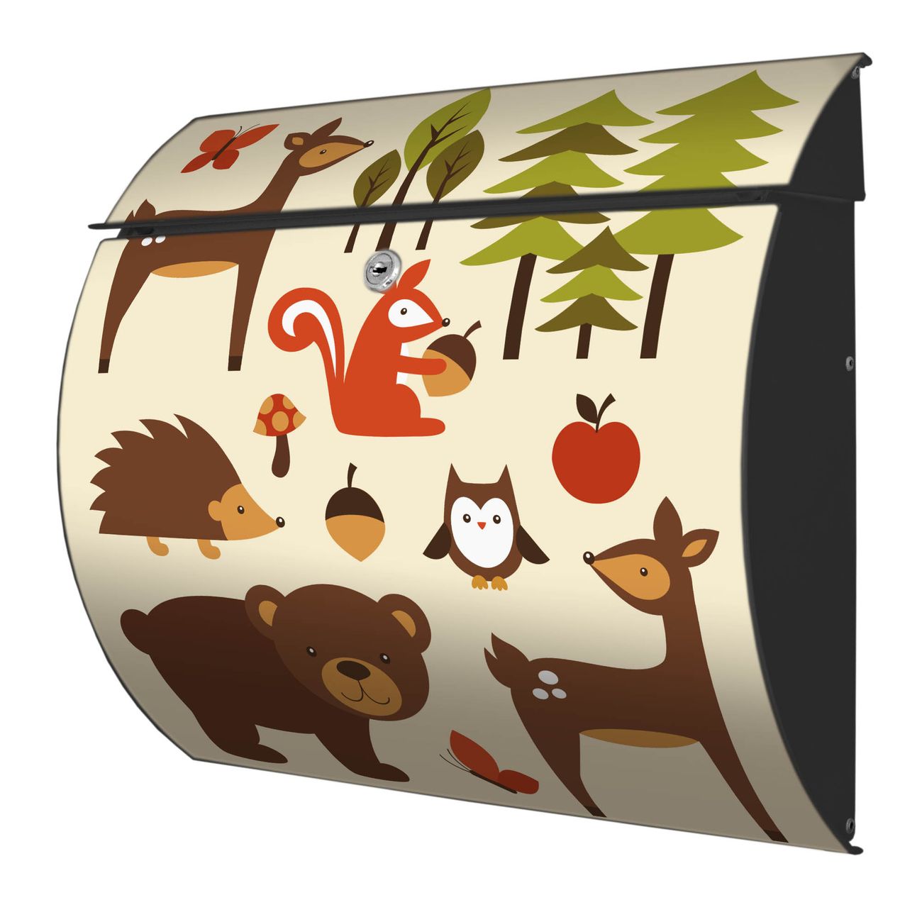 FUNKTION: DESIGN: Das Burg Wächter Modell Toscana mit Motiv Waldfreunde hat ein sehr ansprechendes und zeitloses Design und ist besonderes wetterfest. Heben Sie Sich von der tristen grauen Masse ab, ohne auf Funktionalität zu verzichten. Wir bieten Ihnen ebenfalls Namensschilder, bereits beschriftet oder frei zu beschriften, und verschiedene selbst gestaltete Bitte-Keine-Werbung-Aufkleber. DETAILS: Der Postkasten besteht aus vollflächig verzinktem Stahl welcher in Anthrazit oder Weiß lackiert wurde oder aus Edelstahl (je nach gewählter Variante). Das Motiv besteht aus einer wetter- und UV-festen Folie, die mit einem Schutzlaminat überzogen ist, durch die Ihren Briefkasten zusätzlich vor Kratzern geschützt ist und auf den Briefkasten kaschiert wurde. Sie erhalten zu Ihrem neuen Design Briefkasten 2 Schlüssel sowie das passende Montagematerial. BANJADO: Ihr Briefkasten wird von Burg Wächter in Deutschland gefertigt und in unserer kleinen Manufaktur von Hand veredelt. Die Motivfolie ist lösungsmittelfrei und schutzlaminiert, dies sorgt für einen langen Halt. Wir legen großen Wert auf die Verbindung von Funktionalität und Design. Sie erhalten besondere Handarbeit aus Sachsen und Made in Germany.
