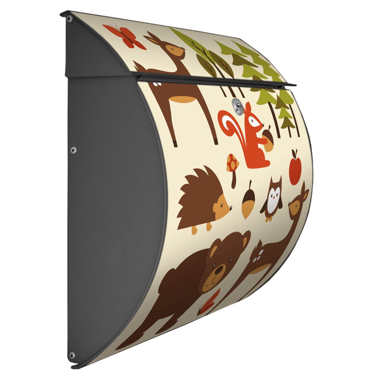 Der geschwungene Burg Wächter Briefkasten Toscana mit Motiv Waldfreunde bietet Ihnen mit seinem großen Fassungsvermögen genügend Platz auch für große A4 Sendungen. Auf Wunsch können Sie bei uns den passenden Standfuß bestellen und so aus dem Wandbriefkasten einen Standbriefkasten machen. Der integrierte Öffnungsstopp ermöglicht eine einfache Handhabung beim Entnehmen der Post.