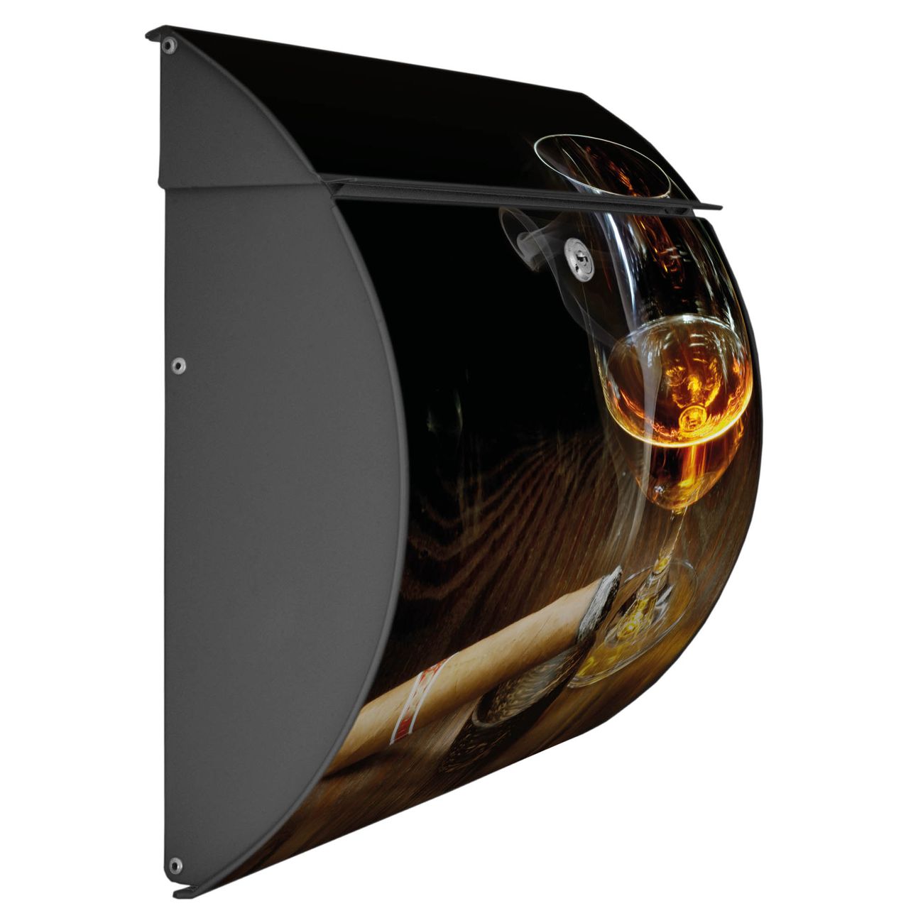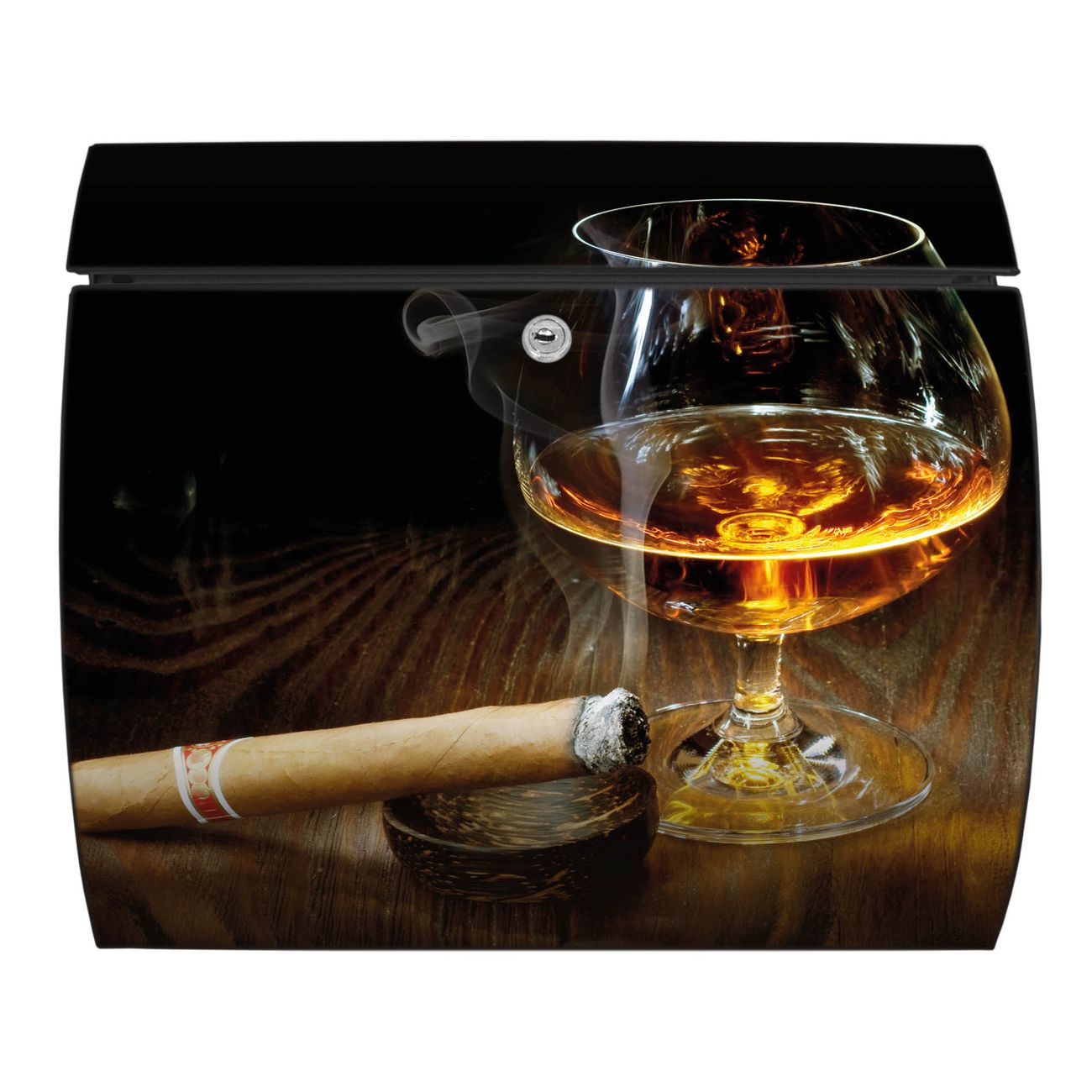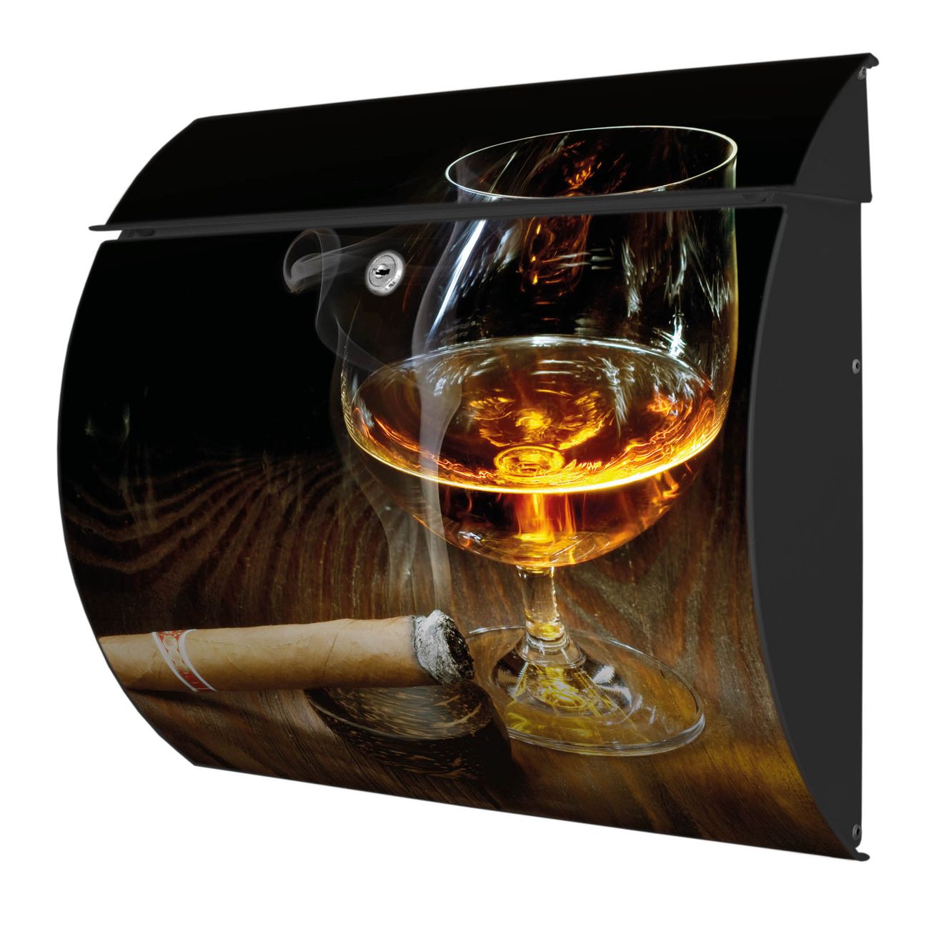 Der geschwungene Burg Wächter Briefkasten Toscana mit Motiv Whiskey & Cigar bietet Ihnen mit seinem großen Fassungsvermögen genügend Platz auch für große A4 Sendungen. Auf Wunsch können Sie bei uns den passenden Standfuß bestellen und so aus dem Wandbriefkasten einen Standbriefkasten machen. Der integrierte Öffnungsstopp ermöglicht eine einfache Handhabung beim Entnehmen der Post.