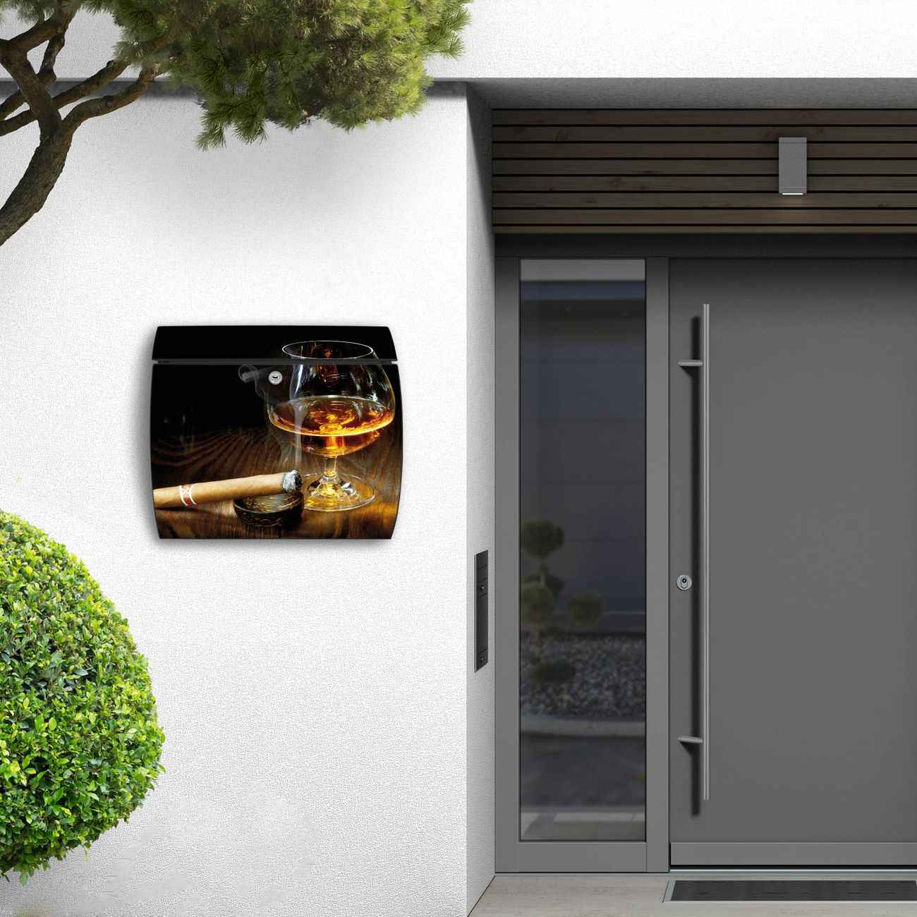 FUNKTION: DESIGN: Das Burg Wächter Modell Toscana mit Motiv Whiskey & Cigar hat ein sehr ansprechendes und zeitloses Design und ist besonderes wetterfest. Heben Sie Sich von der tristen grauen Masse ab, ohne auf Funktionalität zu verzichten. Wir bieten Ihnen ebenfalls Namensschilder, bereits beschriftet oder frei zu beschriften, und verschiedene selbst gestaltete Bitte-Keine-Werbung-Aufkleber. DETAILS: Der Postkasten besteht aus vollflächig verzinktem Stahl welcher in Anthrazit oder Weiß lackiert wurde oder aus Edelstahl (je nach gewählter Variante). Das Motiv besteht aus einer wetter- und UV-festen Folie, die mit einem Schutzlaminat überzogen ist, durch die Ihren Briefkasten zusätzlich vor Kratzern geschützt ist und auf den Briefkasten kaschiert wurde. Sie erhalten zu Ihrem neuen Design Briefkasten 2 Schlüssel sowie das passende Montagematerial. BANJADO: Ihr Briefkasten wird von Burg Wächter in Deutschland gefertigt und in unserer kleinen Manufaktur von Hand veredelt. Die Motivfolie ist lösungsmittelfrei und schutzlaminiert, dies sorgt für einen langen Halt. Wir legen großen Wert auf die Verbindung von Funktionalität und Design. Sie erhalten besondere Handarbeit aus Sachsen und Made in Germany.
