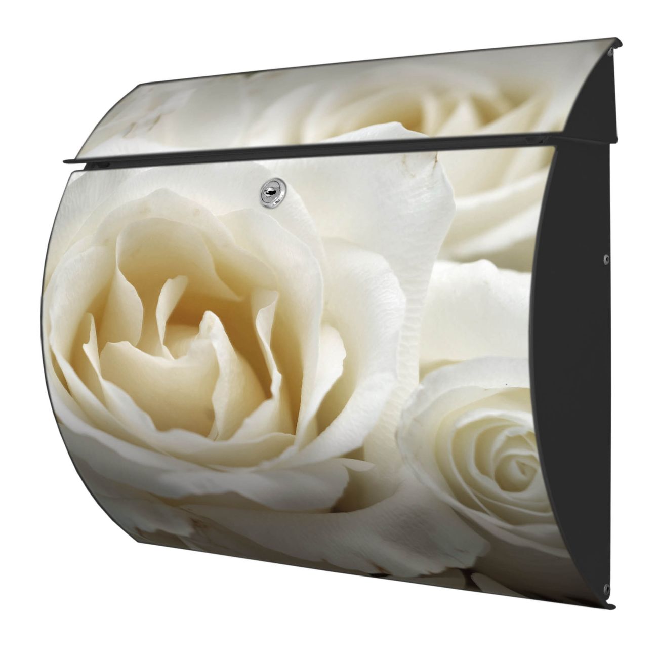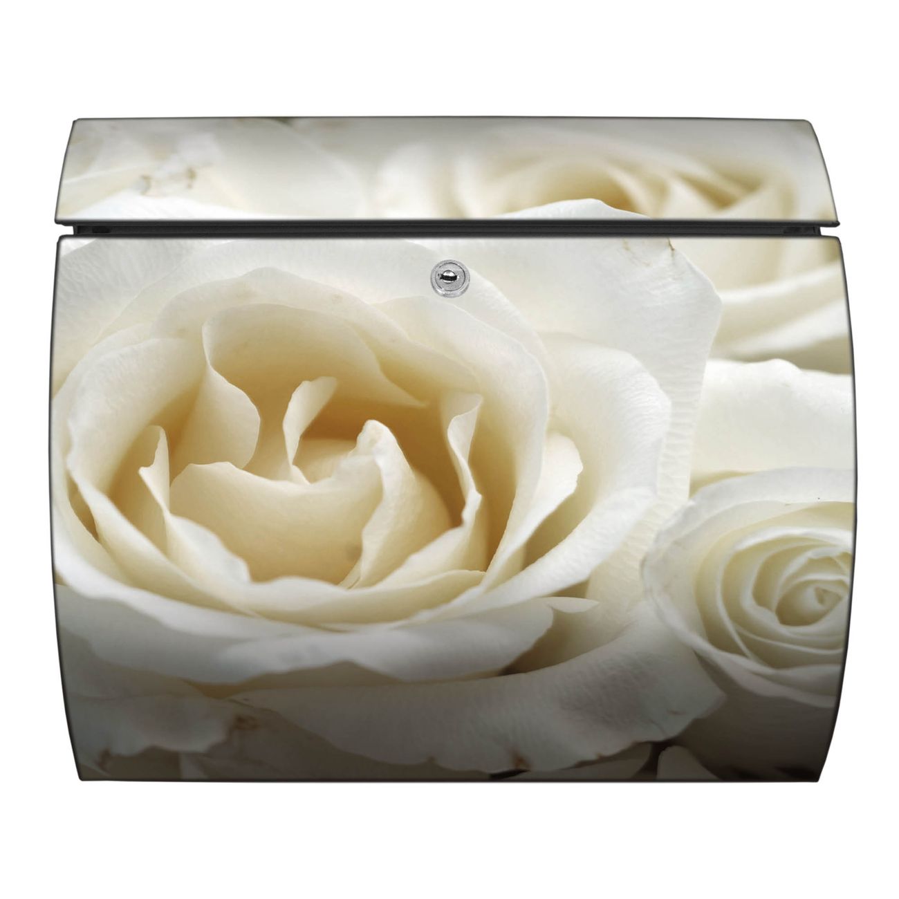 FUNKTION: DESIGN: Das Burg Wächter Modell Toscana mit Motiv White Roses hat ein sehr ansprechendes und zeitloses Design und ist besonderes wetterfest. Heben Sie Sich von der tristen grauen Masse ab, ohne auf Funktionalität zu verzichten. Wir bieten Ihnen ebenfalls Namensschilder, bereits beschriftet oder frei zu beschriften, und verschiedene selbst gestaltete Bitte-Keine-Werbung-Aufkleber. DETAILS: Der Postkasten besteht aus vollflächig verzinktem Stahl welcher in Anthrazit oder Weiß lackiert wurde oder aus Edelstahl (je nach gewählter Variante). Das Motiv besteht aus einer wetter- und UV-festen Folie, die mit einem Schutzlaminat überzogen ist, durch die Ihren Briefkasten zusätzlich vor Kratzern geschützt ist und auf den Briefkasten kaschiert wurde. Sie erhalten zu Ihrem neuen Design Briefkasten 2 Schlüssel sowie das passende Montagematerial. BANJADO: Ihr Briefkasten wird von Burg Wächter in Deutschland gefertigt und in unserer kleinen Manufaktur von Hand veredelt. Die Motivfolie ist lösungsmittelfrei und schutzlaminiert, dies sorgt für einen langen Halt. Wir legen großen Wert auf die Verbindung von Funktionalität und Design. Sie erhalten besondere Handarbeit aus Sachsen und Made in Germany.