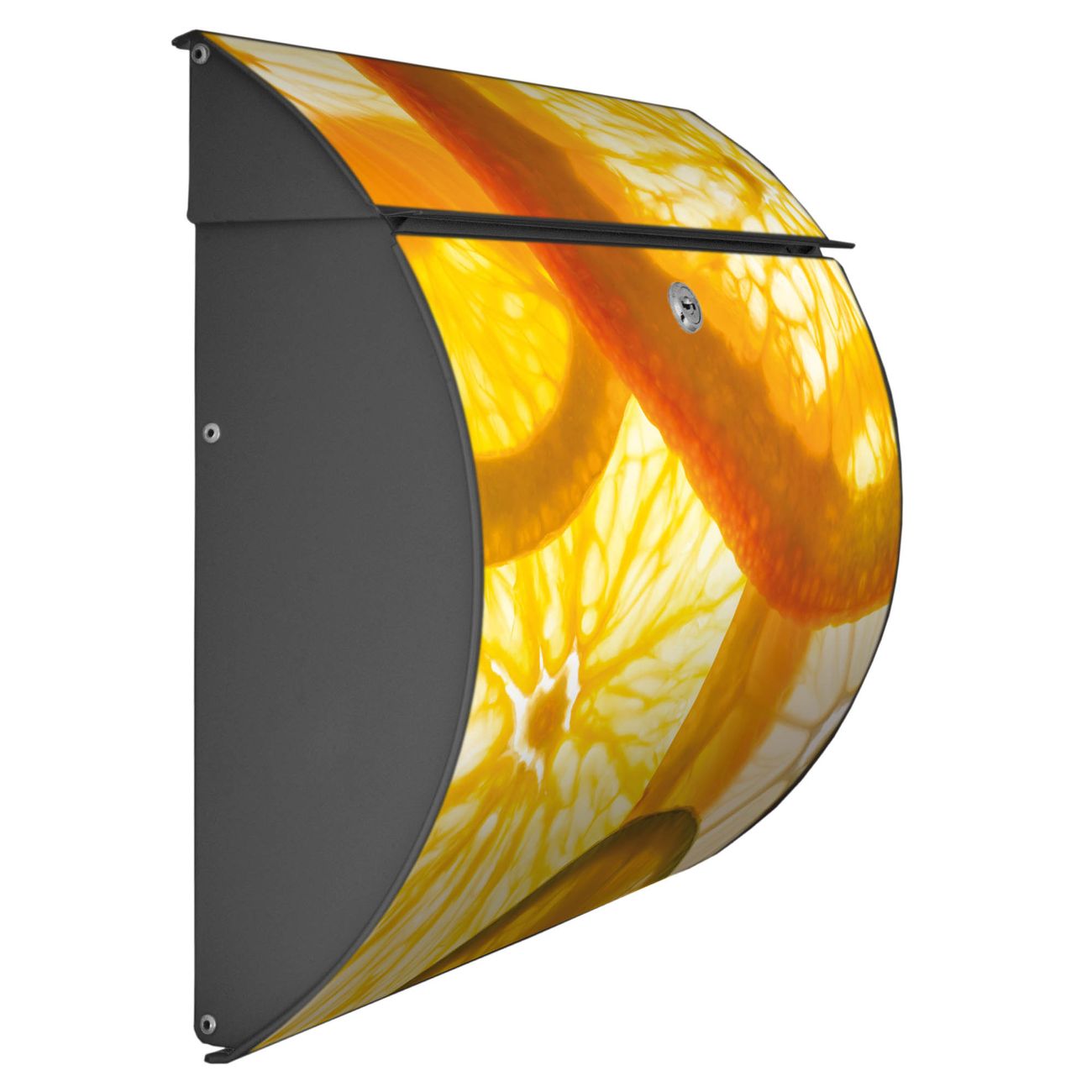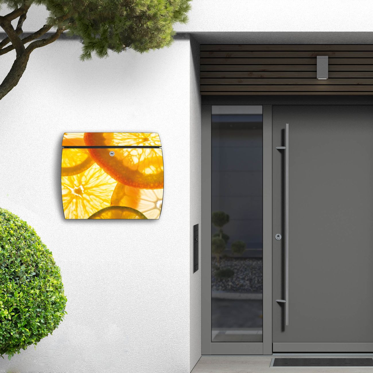 FUNKTION: DESIGN: Das Burg Wächter Modell Toscana mit Motiv Zitrusfrüchte hat ein sehr ansprechendes und zeitloses Design und ist besonderes wetterfest. Heben Sie Sich von der tristen grauen Masse ab, ohne auf Funktionalität zu verzichten. Wir bieten Ihnen ebenfalls Namensschilder, bereits beschriftet oder frei zu beschriften, und verschiedene selbst gestaltete Bitte-Keine-Werbung-Aufkleber. DETAILS: Der Postkasten besteht aus vollflächig verzinktem Stahl welcher in Anthrazit oder Weiß lackiert wurde oder aus Edelstahl (je nach gewählter Variante). Das Motiv besteht aus einer wetter- und UV-festen Folie, die mit einem Schutzlaminat überzogen ist, durch die Ihren Briefkasten zusätzlich vor Kratzern geschützt ist und auf den Briefkasten kaschiert wurde. Sie erhalten zu Ihrem neuen Design Briefkasten 2 Schlüssel sowie das passende Montagematerial. BANJADO: Ihr Briefkasten wird von Burg Wächter in Deutschland gefertigt und in unserer kleinen Manufaktur von Hand veredelt. Die Motivfolie ist lösungsmittelfrei und schutzlaminiert, dies sorgt für einen langen Halt. Wir legen großen Wert auf die Verbindung von Funktionalität und Design. Sie erhalten besondere Handarbeit aus Sachsen und Made in Germany.