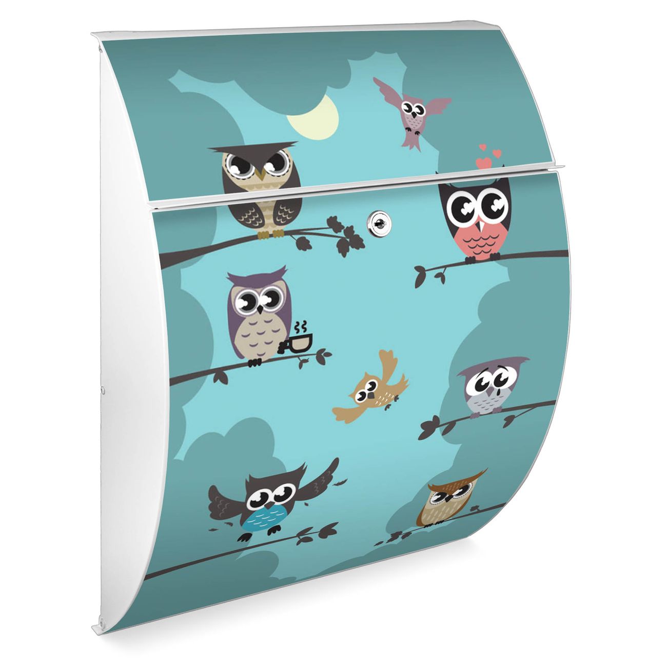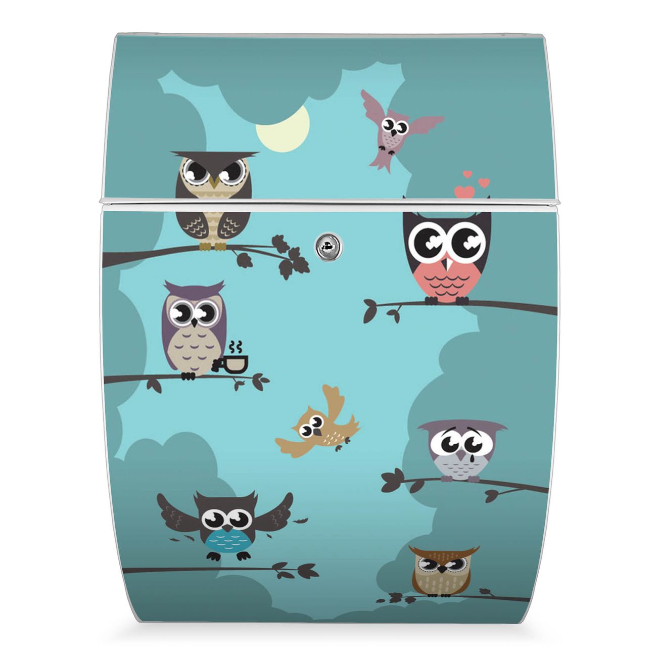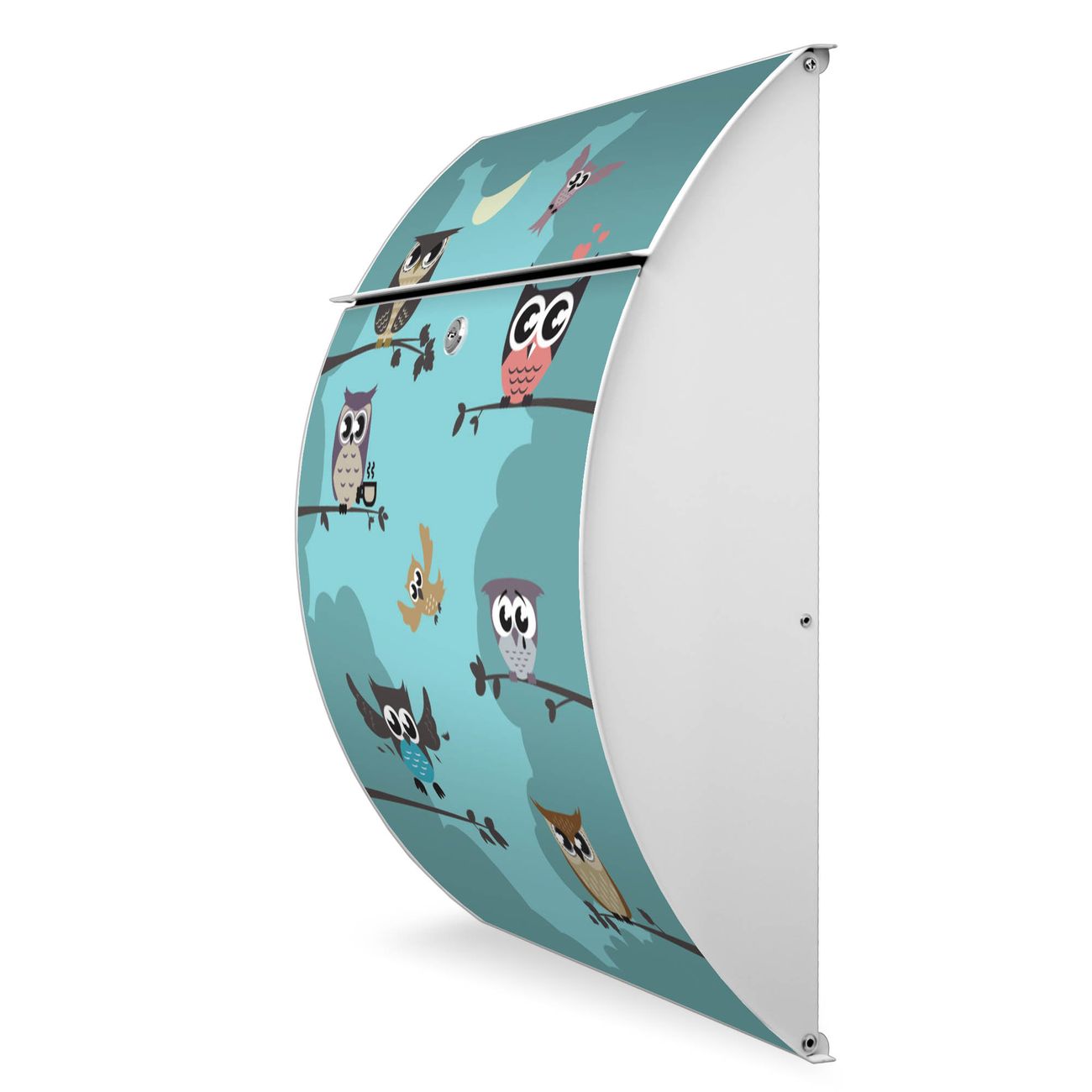 Der weiße Burg Wächter Design Briefkasten mit Motiv Acht Eulen bietet Ihnen mit seinem Fassungsvermögen genügend Platz auch für große A4 Sendungen. Auf Wunsch können Sie bei uns auch den passenden Ständer kaufen und so aus dem Wandbriefkasten einen Standbriefkasten machen.