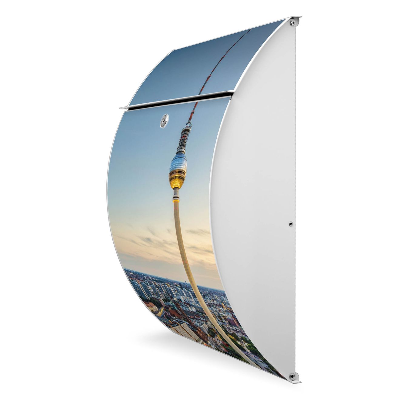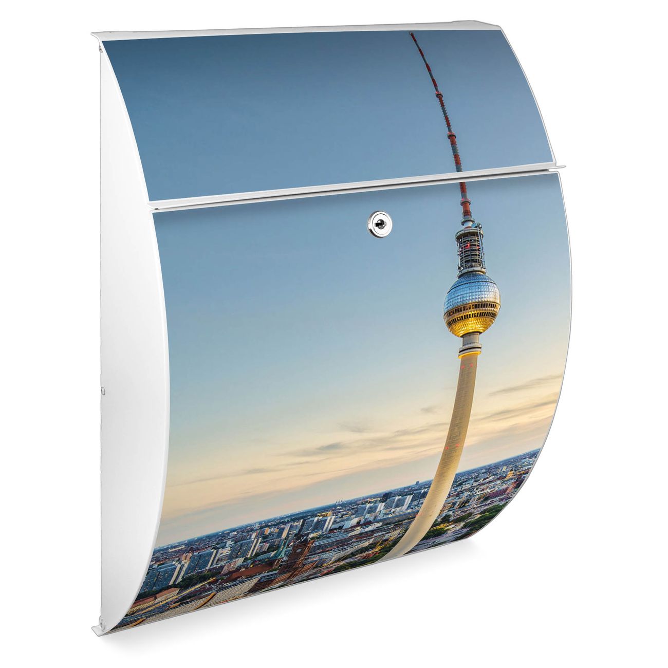 Der weiße Burg Wächter Design Briefkasten mit Motiv Alexanderplatz bietet Ihnen mit seinem Fassungsvermögen genügend Platz auch für große A4 Sendungen. Auf Wunsch können Sie bei uns auch den passenden Ständer kaufen und so aus dem Wandbriefkasten einen Standbriefkasten machen.