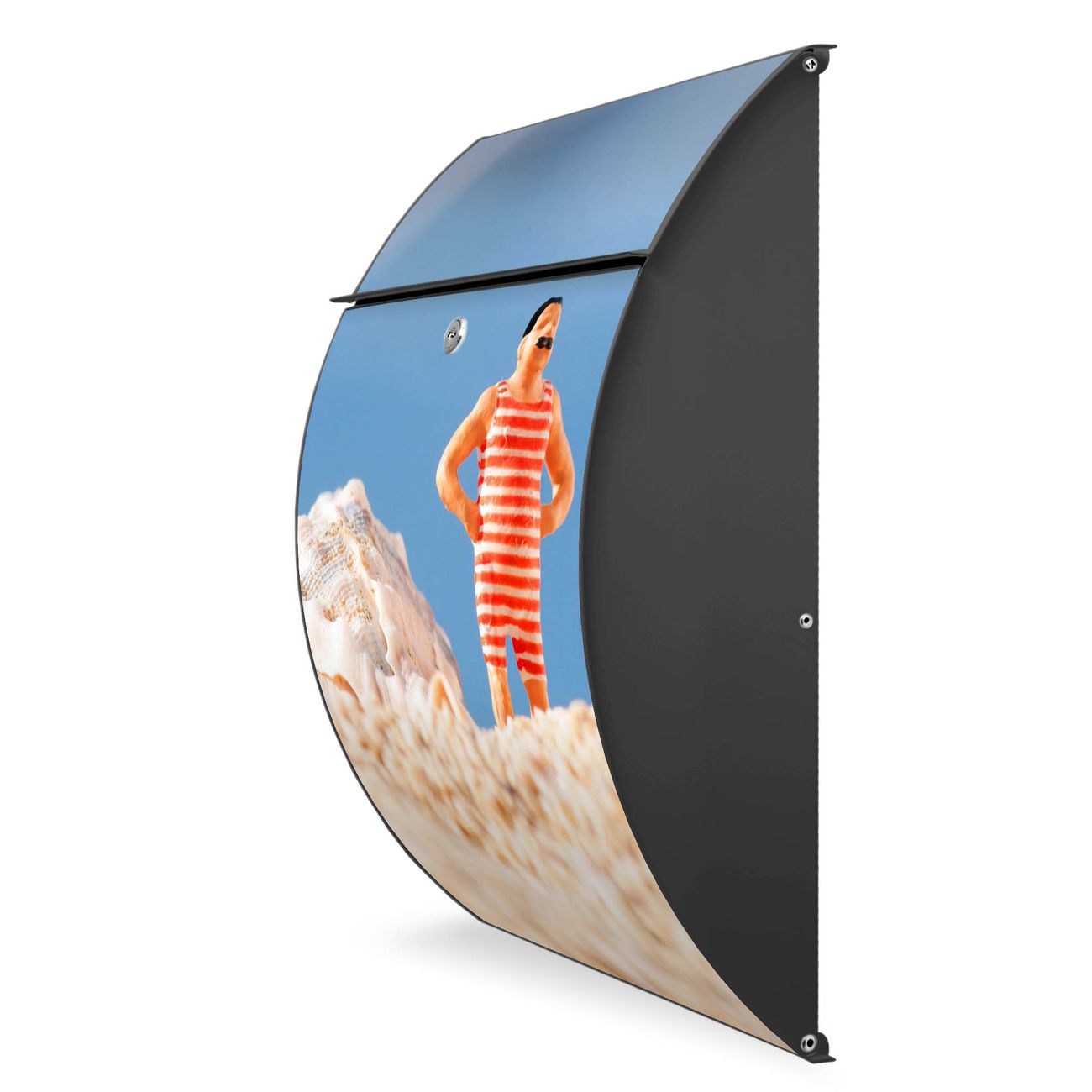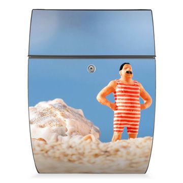 FUNKTION: DESIGN: Das Modell Riviera mit Motiv Bademeister hat ein sehr ansprechendes und zeitloses Design. Heben Sie Sich von der tristen grauen Masse ab, ohne auf Funktionalität zu verzichten. Der integrierte Öffnungsstopp ermöglicht eine einfache Handhabung beim Entnehmen der Post. DETAILS: Der Postkasten besteht aus vollflächig verzinktem Stahl welcher in Anthrazit lackiert wurde. Das Motiv besteht aus einer wetter- und UV-festen Folie, die mit einem Schutzlaminat überzogen ist, durch die Ihren Briefkasten zusätzlich vor Kratzern geschützt ist. Sie erhalten 2 Schlüssel sowie das passende Montagematerial. NUTZEN: Sie können den Briefkasten sowohl als Wandbriefkasten montieren oder einen passenden Ständer kaufen und als Standbriefkasten einbetonieren. Die Größe bietet genügend Platz für Sendungen aller Art, der Einwurf fasst auch größere A4 Sendungen. BANJADO: Ihr Briefkasten wird in Sachsen in einer kleinen Manufaktur von Hand veredelt. Die Motivfolie ist lösungsmittelfrei und schutzlaminiert, dies sorgt für einen langen Halt. Wir legen großen Wert auf die Verbindung von Funktionalität und Design. Sie erhalten Handarbeit aus Sachsen.