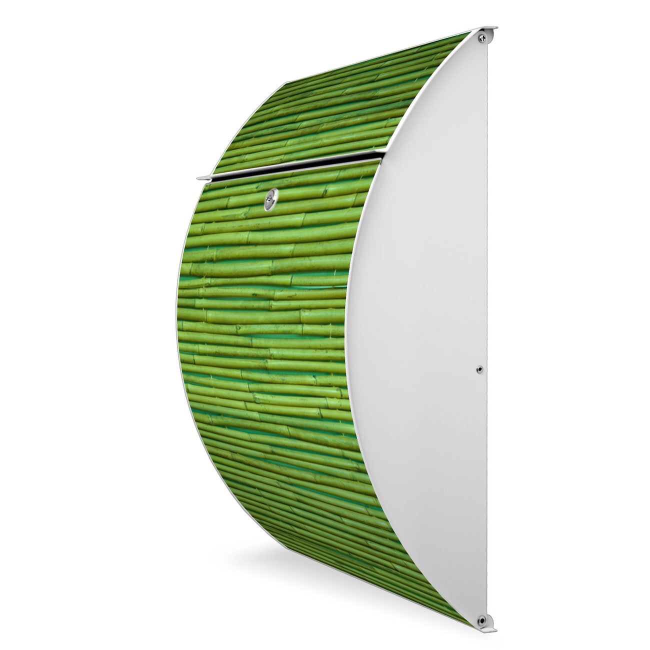 Der weiße Burg Wächter Design Briefkasten mit Motiv Bambus Grün bietet Ihnen mit seinem Fassungsvermögen genügend Platz auch für große A4 Sendungen. Auf Wunsch können Sie bei uns auch den passenden Ständer kaufen und so aus dem Wandbriefkasten einen Standbriefkasten machen.