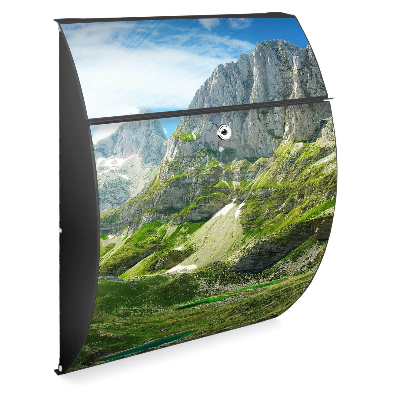 FUNKTION: DESIGN: Das Modell Riviera mit Motiv Bergsee Alpen hat ein sehr ansprechendes und zeitloses Design. Heben Sie Sich von der tristen grauen Masse ab, ohne auf Funktionalität zu verzichten. Der integrierte Öffnungsstopp ermöglicht eine einfache Handhabung beim Entnehmen der Post. DETAILS: Der Postkasten besteht aus vollflächig verzinktem Stahl welcher in Anthrazit lackiert wurde. Das Motiv besteht aus einer wetter- und UV-festen Folie, die mit einem Schutzlaminat überzogen ist, durch die Ihren Briefkasten zusätzlich vor Kratzern geschützt ist. Sie erhalten 2 Schlüssel sowie das passende Montagematerial. NUTZEN: Sie können den Briefkasten sowohl als Wandbriefkasten montieren oder einen passenden Ständer kaufen und als Standbriefkasten einbetonieren. Die Größe bietet genügend Platz für Sendungen aller Art, der Einwurf fasst auch größere A4 Sendungen. BANJADO: Ihr Briefkasten wird in Sachsen in einer kleinen Manufaktur von Hand veredelt. Die Motivfolie ist lösungsmittelfrei und schutzlaminiert, dies sorgt für einen langen Halt. Wir legen großen Wert auf die Verbindung von Funktionalität und Design. Sie erhalten Handarbeit aus Sachsen.