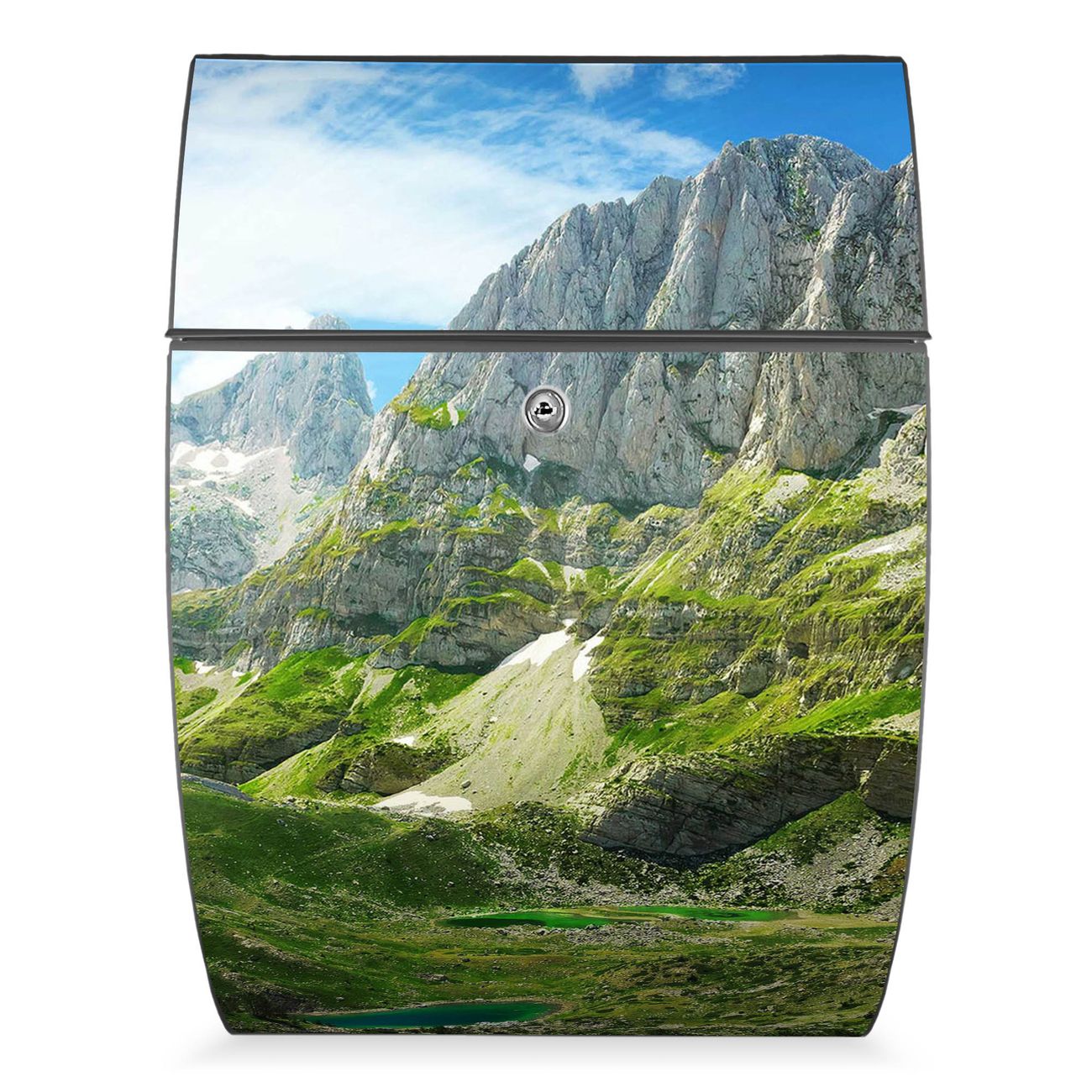 Der Burg Wächter Design Briefkasten mit Motiv Bergsee Alpen bietet Ihnen mit seinem Fassungsvermögen genügend Platz auch für große A4 Sendungen. Auf Wunsch können Sie bei uns den passenden Ständer kaufen und so aus dem Wandbriefkasten einen Standbriefkasten machen.
