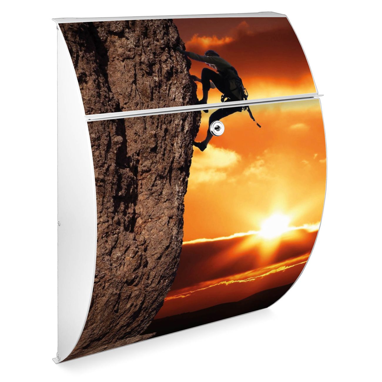 Der weiße Burg Wächter Design Briefkasten mit Motiv Bergsteiger bietet Ihnen mit seinem Fassungsvermögen genügend Platz auch für große A4 Sendungen. Auf Wunsch können Sie bei uns auch den passenden Ständer kaufen und so aus dem Wandbriefkasten einen Standbriefkasten machen.