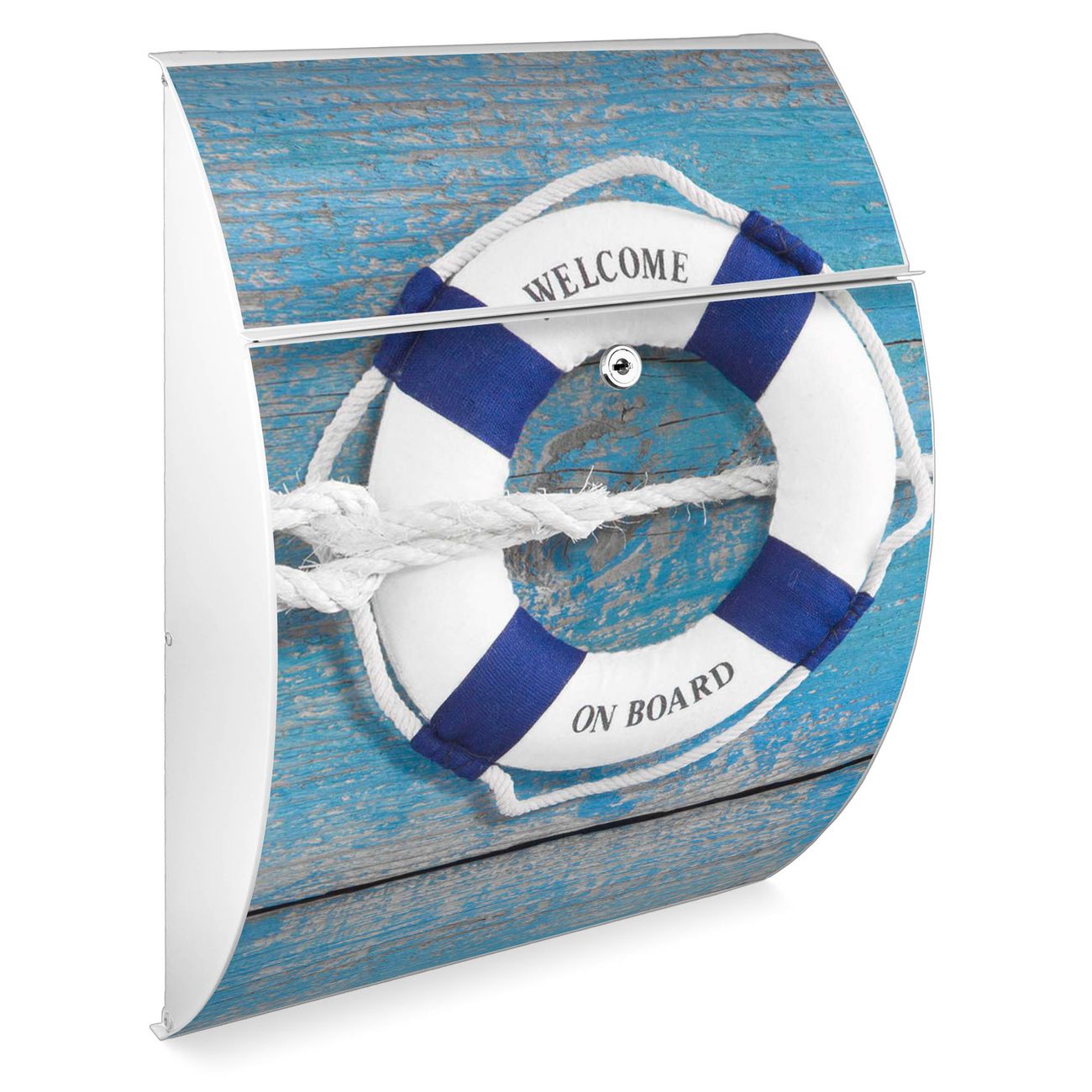 FUNKTION: DESIGN: Das Modell Riviera mit Motiv Blauer Rettungsring hat ein sehr ansprechendes und zeitloses Design. Heben Sie Sich von der tristen grauen Masse ab, ohne auf Funktionalität zu verzichten. Der integrierte Öffnungsstopp ermöglicht eine einfache Handhabung beim Entnehmen der Post. DETAILS: Der Postkasten besteht aus vollflächig verzinktem Stahl welcher in weiß lackiert wurde. Das Motiv besteht aus einer wetter- und UV-festen Folie, die mit einem Schutzlaminat überzogen ist, durch die Ihren Briefkasten zusätzlich vor Kratzern geschützt ist. Sie erhalten 2 Schlüssel sowie das passende Montagematerial. NUTZEN: Sie können den Briefkasten sowohl als Wandbriefkasten montieren oder einen passenden Ständer kaufen und als Standbriefkasten einbetonieren. Die Größe bietet genügend Platz für Sendungen aller Art, der Einwurf fasst auch größere A4 Sendungen. BANJADO: Ihr Briefkasten wird in Sachsen in einer kleinen Manufaktur von Hand veredelt. Die Motivfolie ist lösungsmittelfrei und schutzlaminiert, dies sorgt für einen langen Halt. Wir legen großen Wert auf die Verbindung von Funktionalität und Design. Sie erhalten Handarbeit aus Sachsen.