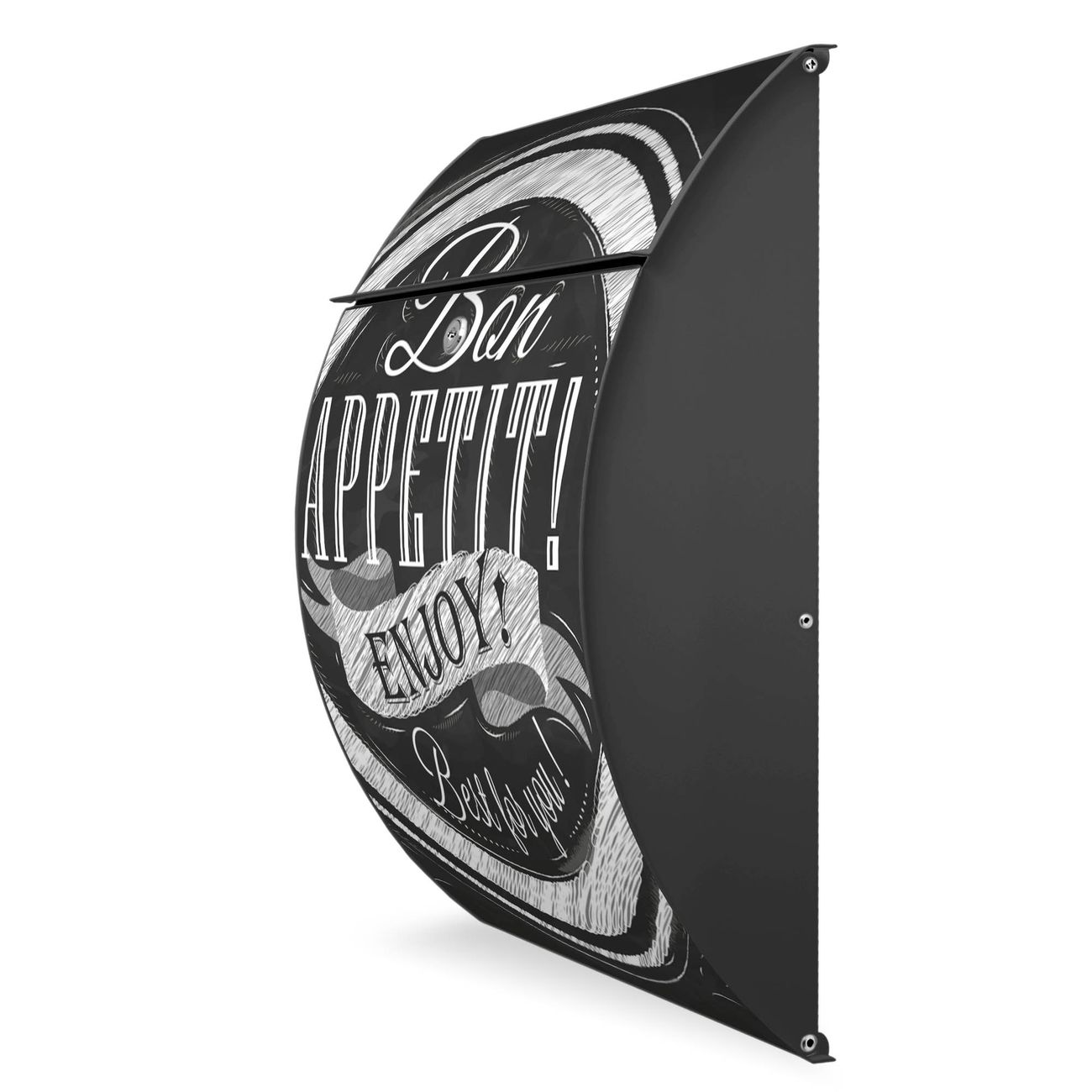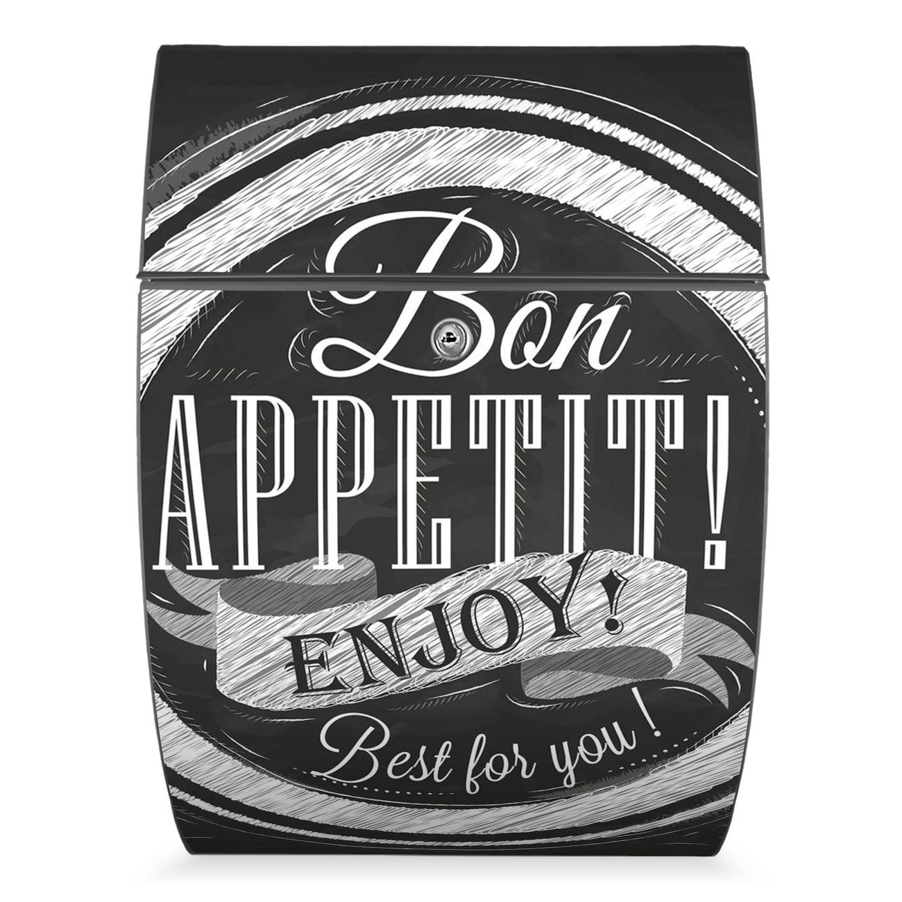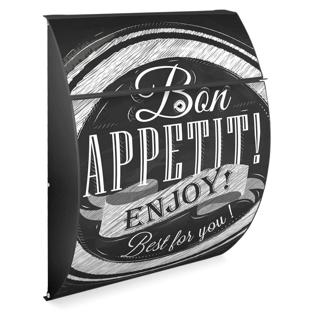 FUNKTION: DESIGN: Das Modell Riviera mit Motiv Bon Appetit hat ein sehr ansprechendes und zeitloses Design. Heben Sie Sich von der tristen grauen Masse ab, ohne auf Funktionalität zu verzichten. Der integrierte Öffnungsstopp ermöglicht eine einfache Handhabung beim Entnehmen der Post. DETAILS: Der Postkasten besteht aus vollflächig verzinktem Stahl welcher in Anthrazit lackiert wurde. Das Motiv besteht aus einer wetter- und UV-festen Folie, die mit einem Schutzlaminat überzogen ist, durch die Ihren Briefkasten zusätzlich vor Kratzern geschützt ist. Sie erhalten 2 Schlüssel sowie das passende Montagematerial. NUTZEN: Sie können den Briefkasten sowohl als Wandbriefkasten montieren oder einen passenden Ständer kaufen und als Standbriefkasten einbetonieren. Die Größe bietet genügend Platz für Sendungen aller Art, der Einwurf fasst auch größere A4 Sendungen. BANJADO: Ihr Briefkasten wird in Sachsen in einer kleinen Manufaktur von Hand veredelt. Die Motivfolie ist lösungsmittelfrei und schutzlaminiert, dies sorgt für einen langen Halt. Wir legen großen Wert auf die Verbindung von Funktionalität und Design. Sie erhalten Handarbeit aus Sachsen.