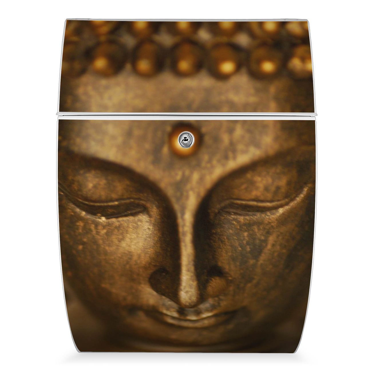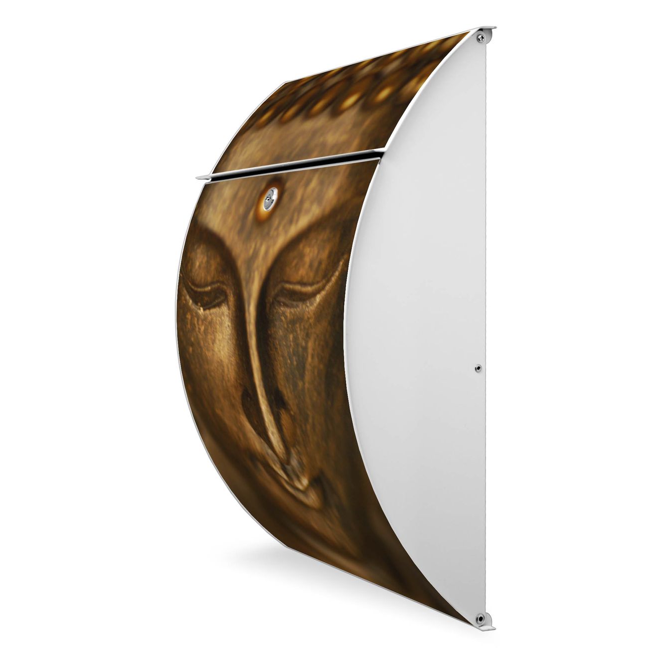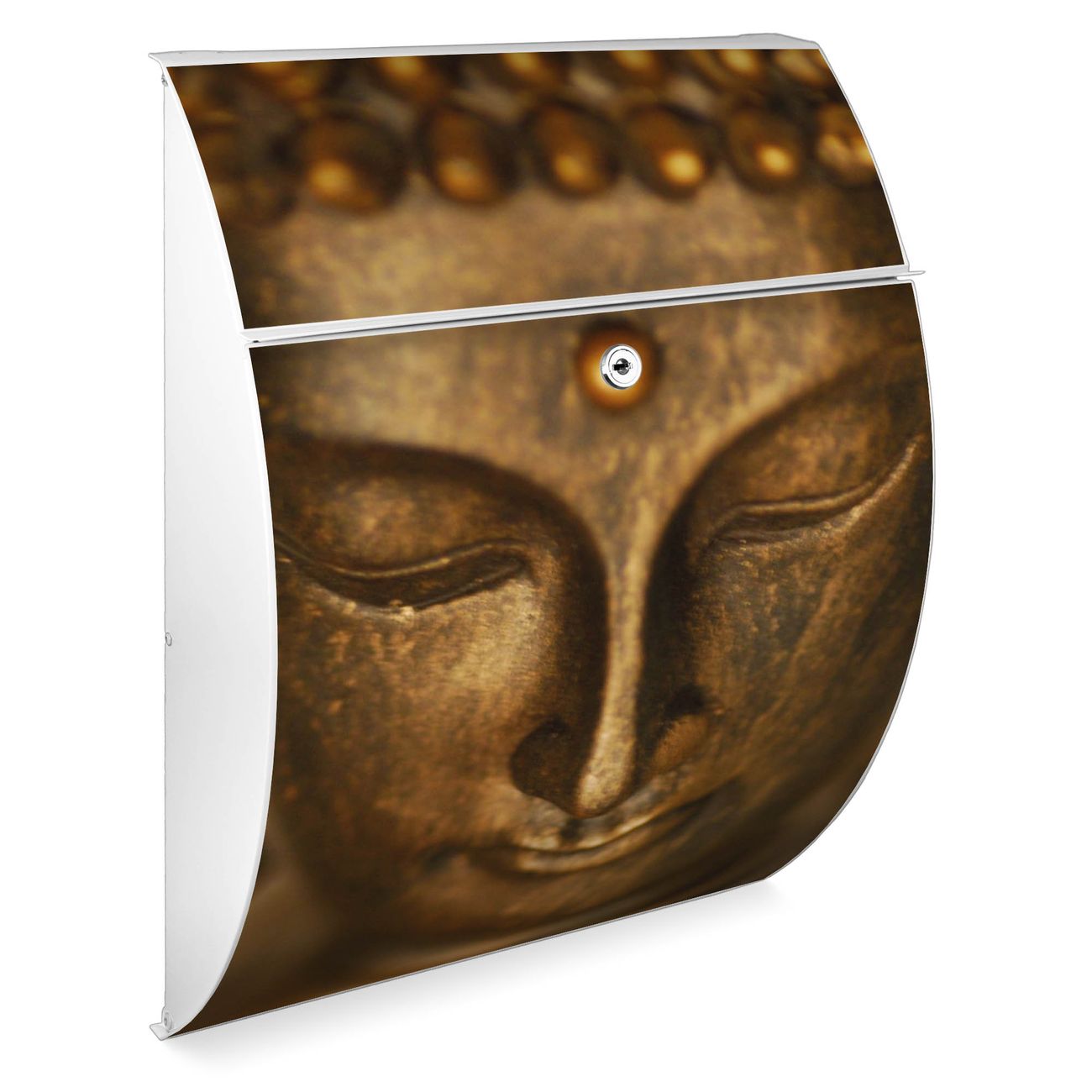 Der weiße Burg Wächter Design Briefkasten mit Motiv Buddha Gold bietet Ihnen mit seinem Fassungsvermögen genügend Platz auch für große A4 Sendungen. Auf Wunsch können Sie bei uns auch den passenden Ständer kaufen und so aus dem Wandbriefkasten einen Standbriefkasten machen.