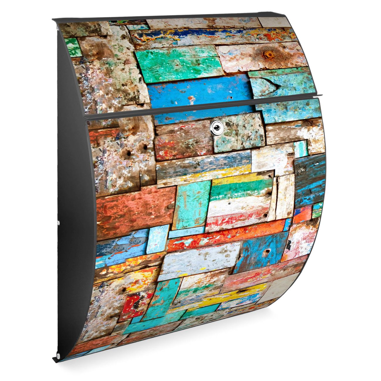 FUNKTION: DESIGN: Das Modell Riviera mit Motiv Bunte Holzschindeln hat ein sehr ansprechendes und zeitloses Design. Heben Sie Sich von der tristen grauen Masse ab, ohne auf Funktionalität zu verzichten. Der integrierte Öffnungsstopp ermöglicht eine einfache Handhabung beim Entnehmen der Post. DETAILS: Der Postkasten besteht aus vollflächig verzinktem Stahl welcher in Anthrazit lackiert wurde. Das Motiv besteht aus einer wetter- und UV-festen Folie, die mit einem Schutzlaminat überzogen ist, durch die Ihren Briefkasten zusätzlich vor Kratzern geschützt ist. Sie erhalten 2 Schlüssel sowie das passende Montagematerial. NUTZEN: Sie können den Briefkasten sowohl als Wandbriefkasten montieren oder einen passenden Ständer kaufen und als Standbriefkasten einbetonieren. Die Größe bietet genügend Platz für Sendungen aller Art, der Einwurf fasst auch größere A4 Sendungen. BANJADO: Ihr Briefkasten wird in Sachsen in einer kleinen Manufaktur von Hand veredelt. Die Motivfolie ist lösungsmittelfrei und schutzlaminiert, dies sorgt für einen langen Halt. Wir legen großen Wert auf die Verbindung von Funktionalität und Design. Sie erhalten Handarbeit aus Sachsen.