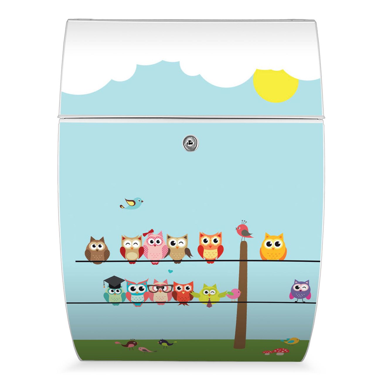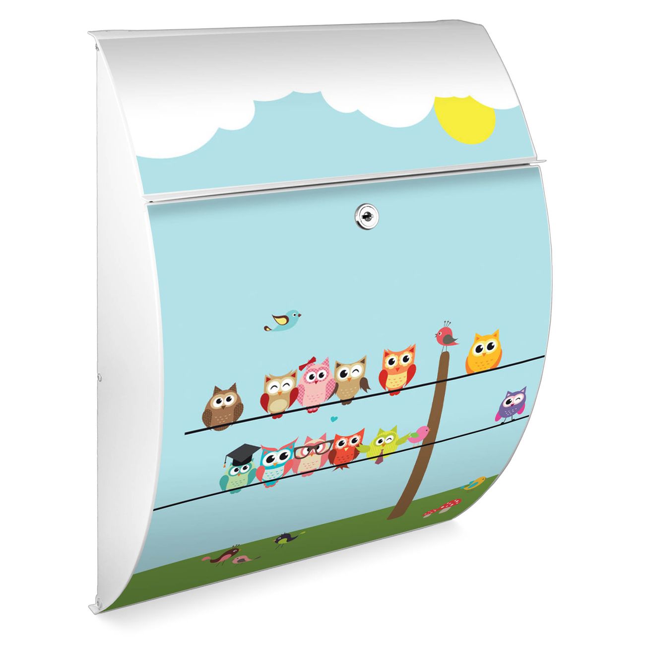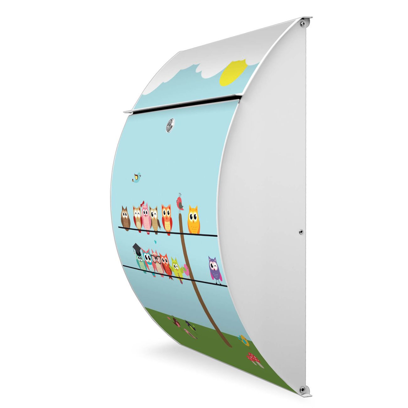 Der weiße Burg Wächter Design Briefkasten mit Motiv Da Wären Wir bietet Ihnen mit seinem Fassungsvermögen genügend Platz auch für große A4 Sendungen. Auf Wunsch können Sie bei uns auch den passenden Ständer kaufen und so aus dem Wandbriefkasten einen Standbriefkasten machen.