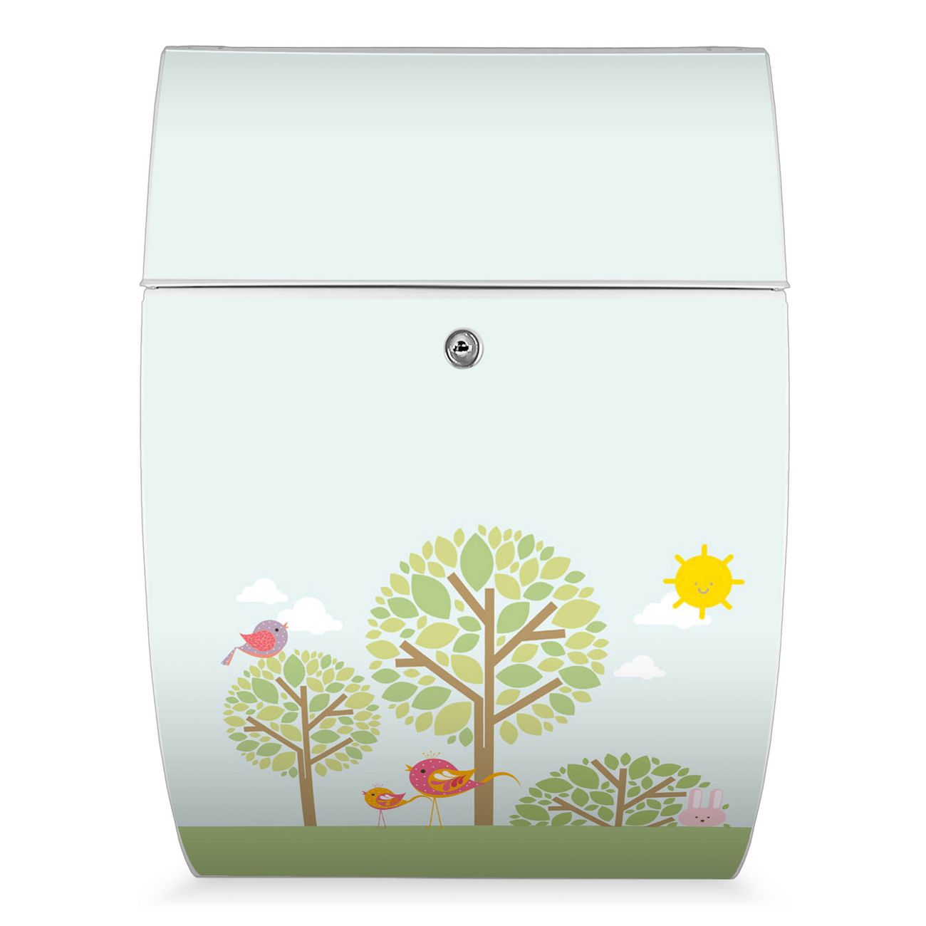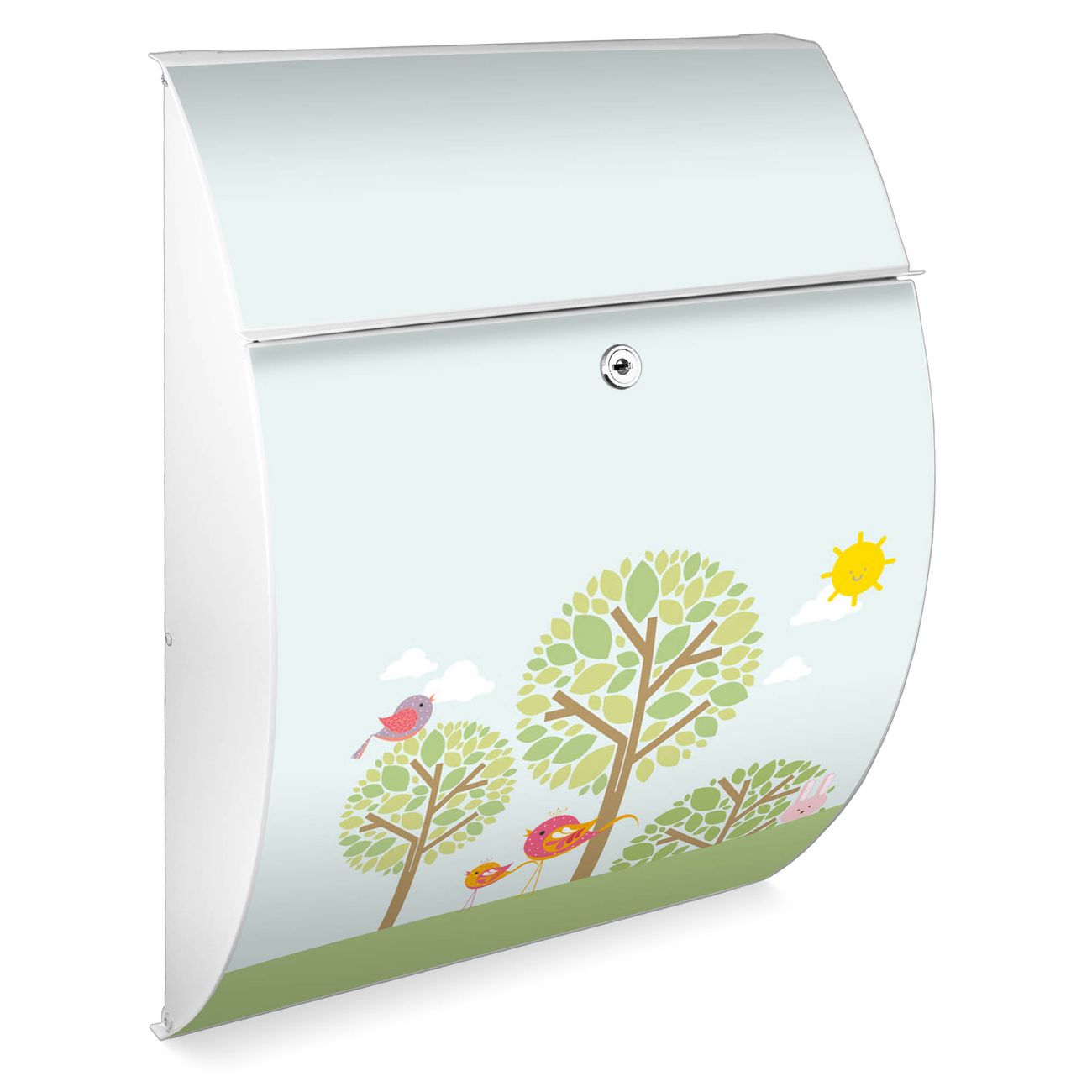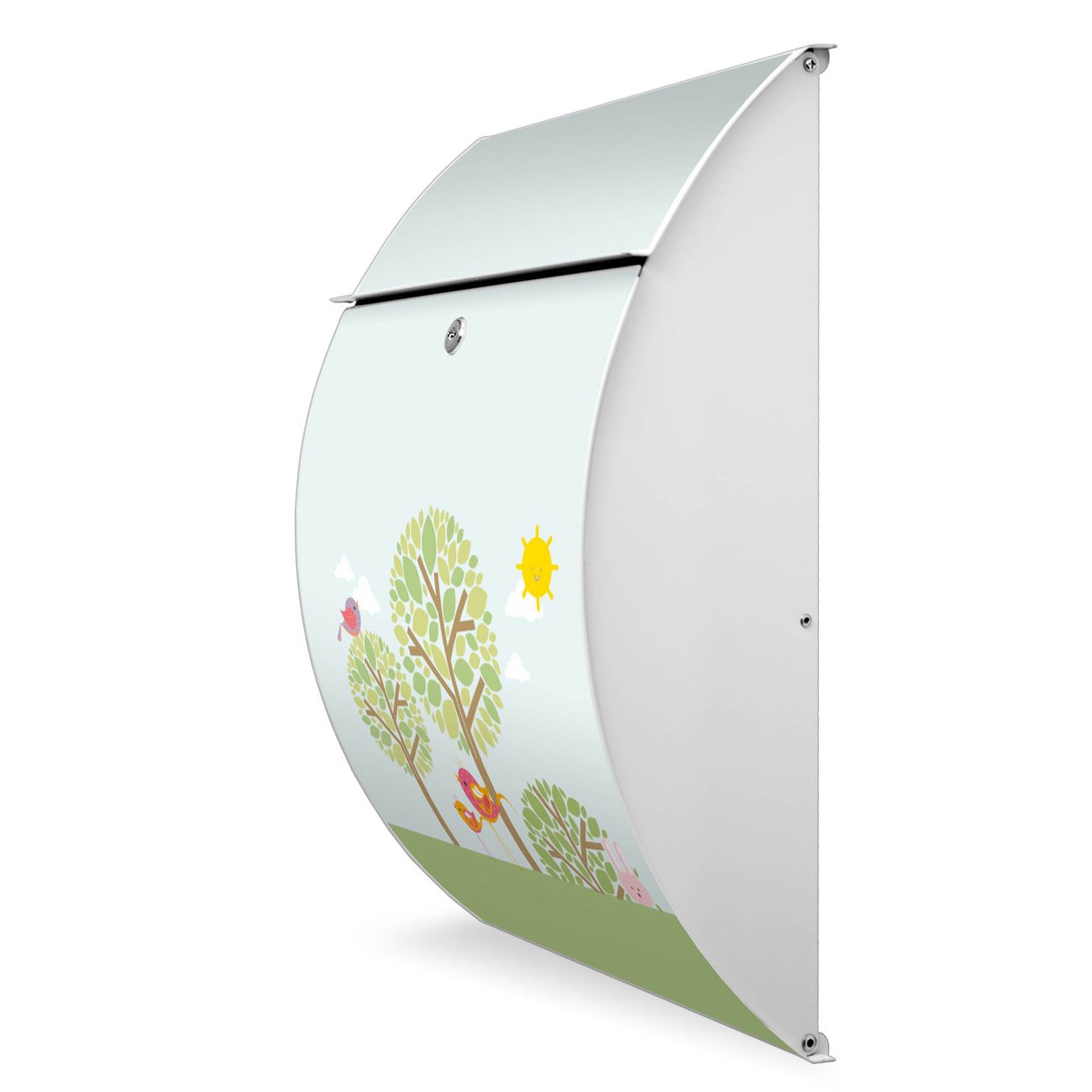 Der weiße Burg Wächter Design Briefkasten mit Motiv Drei Bäume bietet Ihnen mit seinem Fassungsvermögen genügend Platz auch für große A4 Sendungen. Auf Wunsch können Sie bei uns auch den passenden Ständer kaufen und so aus dem Wandbriefkasten einen Standbriefkasten machen.