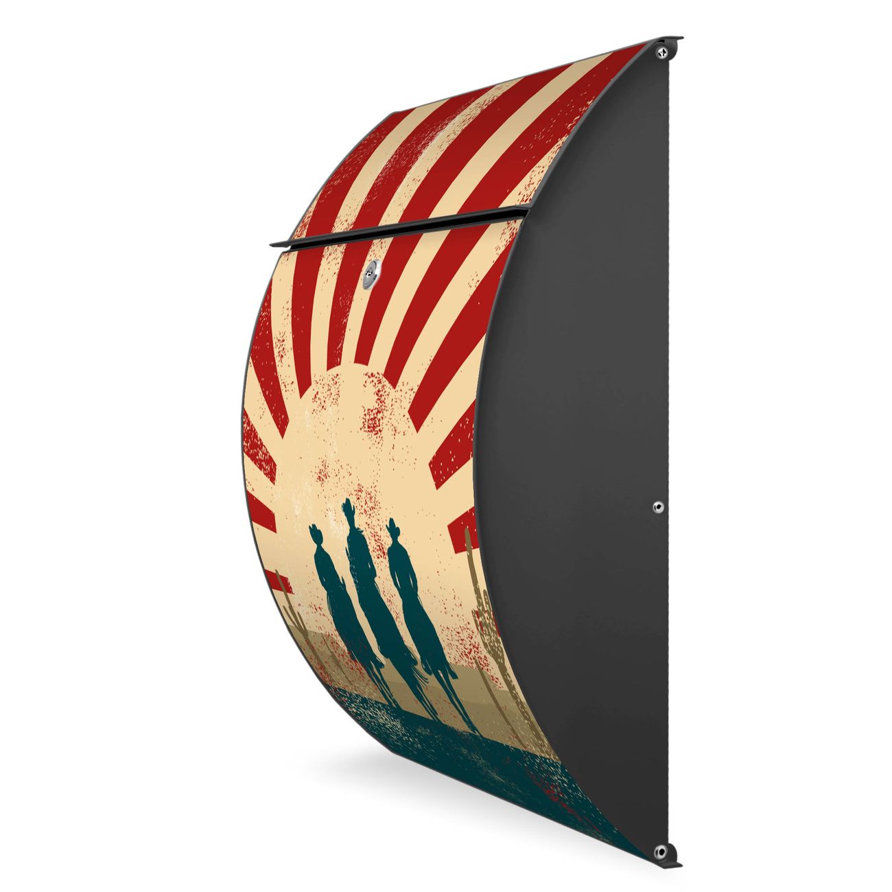 FUNKTION: DESIGN: Das Modell Riviera mit Motiv Drei Cowboys hat ein sehr ansprechendes und zeitloses Design. Heben Sie Sich von der tristen grauen Masse ab, ohne auf Funktionalität zu verzichten. Der integrierte Öffnungsstopp ermöglicht eine einfache Handhabung beim Entnehmen der Post. DETAILS: Der Postkasten besteht aus vollflächig verzinktem Stahl welcher in Anthrazit lackiert wurde. Das Motiv besteht aus einer wetter- und UV-festen Folie, die mit einem Schutzlaminat überzogen ist, durch die Ihren Briefkasten zusätzlich vor Kratzern geschützt ist. Sie erhalten 2 Schlüssel sowie das passende Montagematerial. NUTZEN: Sie können den Briefkasten sowohl als Wandbriefkasten montieren oder einen passenden Ständer kaufen und als Standbriefkasten einbetonieren. Die Größe bietet genügend Platz für Sendungen aller Art, der Einwurf fasst auch größere A4 Sendungen. BANJADO: Ihr Briefkasten wird in Sachsen in einer kleinen Manufaktur von Hand veredelt. Die Motivfolie ist lösungsmittelfrei und schutzlaminiert, dies sorgt für einen langen Halt. Wir legen großen Wert auf die Verbindung von Funktionalität und Design. Sie erhalten Handarbeit aus Sachsen.