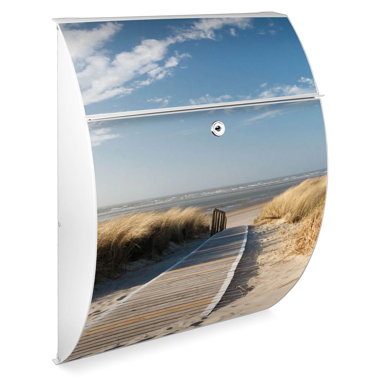 FUNKTION: DESIGN: Das Modell Riviera mit Motiv Dünen hat ein sehr ansprechendes und zeitloses Design. Heben Sie Sich von der tristen grauen Masse ab, ohne auf Funktionalität zu verzichten. Der integrierte Öffnungsstopp ermöglicht eine einfache Handhabung beim Entnehmen der Post. DETAILS: Der Postkasten besteht aus vollflächig verzinktem Stahl welcher in weiß lackiert wurde. Das Motiv besteht aus einer wetter- und UV-festen Folie, die mit einem Schutzlaminat überzogen ist, durch die Ihren Briefkasten zusätzlich vor Kratzern geschützt ist. Sie erhalten 2 Schlüssel sowie das passende Montagematerial. NUTZEN: Sie können den Briefkasten sowohl als Wandbriefkasten montieren oder einen passenden Ständer kaufen und als Standbriefkasten einbetonieren. Die Größe bietet genügend Platz für Sendungen aller Art, der Einwurf fasst auch größere A4 Sendungen. BANJADO: Ihr Briefkasten wird in Sachsen in einer kleinen Manufaktur von Hand veredelt. Die Motivfolie ist lösungsmittelfrei und schutzlaminiert, dies sorgt für einen langen Halt. Wir legen großen Wert auf die Verbindung von Funktionalität und Design. Sie erhalten Handarbeit aus Sachsen.