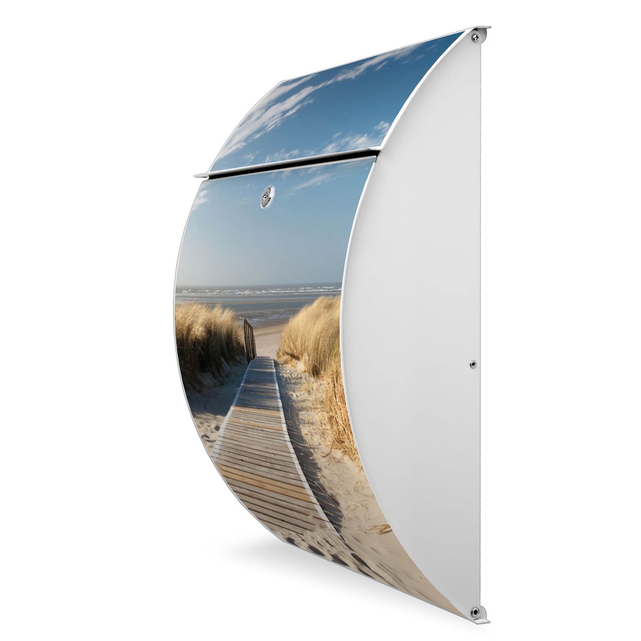 Der weiße Burg Wächter Design Briefkasten mit Motiv Dünen bietet Ihnen mit seinem Fassungsvermögen genügend Platz auch für große A4 Sendungen. Auf Wunsch können Sie bei uns auch den passenden Ständer kaufen und so aus dem Wandbriefkasten einen Standbriefkasten machen.