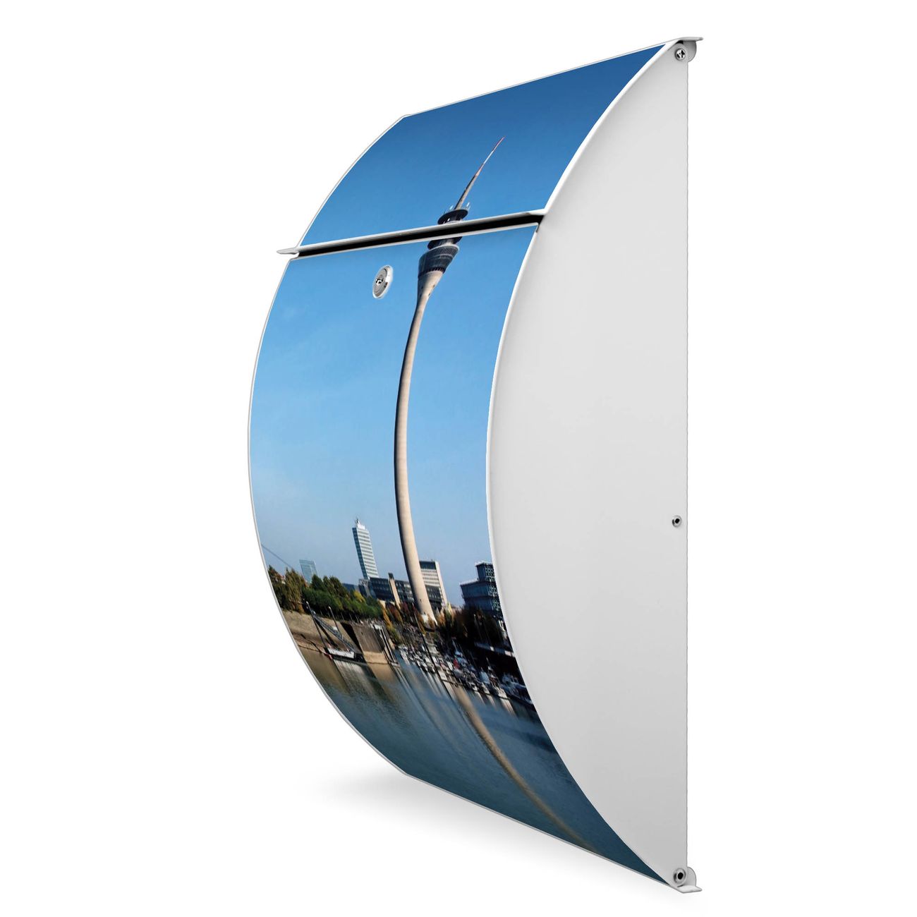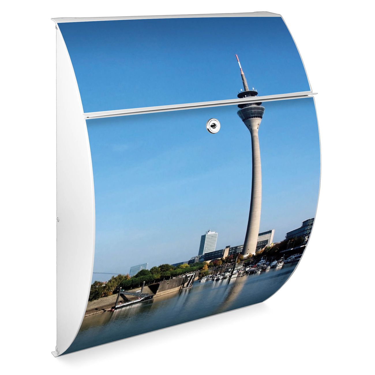 Der weiße Burg Wächter Design Briefkasten mit Motiv Düsseldorf bietet Ihnen mit seinem Fassungsvermögen genügend Platz auch für große A4 Sendungen. Auf Wunsch können Sie bei uns auch den passenden Ständer kaufen und so aus dem Wandbriefkasten einen Standbriefkasten machen.