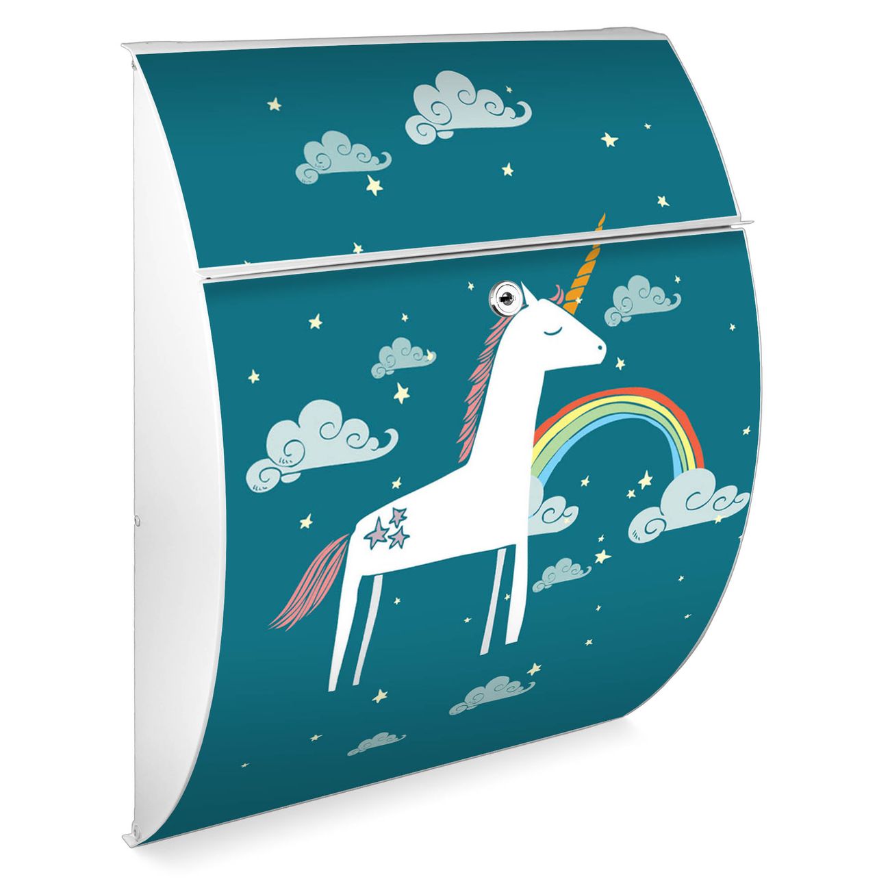 FUNKTION: DESIGN: Das Modell Riviera mit Motiv Einhorn hat ein sehr ansprechendes und zeitloses Design. Heben Sie Sich von der tristen grauen Masse ab, ohne auf Funktionalität zu verzichten. Der integrierte Öffnungsstopp ermöglicht eine einfache Handhabung beim Entnehmen der Post. DETAILS: Der Postkasten besteht aus vollflächig verzinktem Stahl welcher in weiß lackiert wurde. Das Motiv besteht aus einer wetter- und UV-festen Folie, die mit einem Schutzlaminat überzogen ist, durch die Ihren Briefkasten zusätzlich vor Kratzern geschützt ist. Sie erhalten 2 Schlüssel sowie das passende Montagematerial. NUTZEN: Sie können den Briefkasten sowohl als Wandbriefkasten montieren oder einen passenden Ständer kaufen und als Standbriefkasten einbetonieren. Die Größe bietet genügend Platz für Sendungen aller Art, der Einwurf fasst auch größere A4 Sendungen. BANJADO: Ihr Briefkasten wird in Sachsen in einer kleinen Manufaktur von Hand veredelt. Die Motivfolie ist lösungsmittelfrei und schutzlaminiert, dies sorgt für einen langen Halt. Wir legen großen Wert auf die Verbindung von Funktionalität und Design. Sie erhalten Handarbeit aus Sachsen.