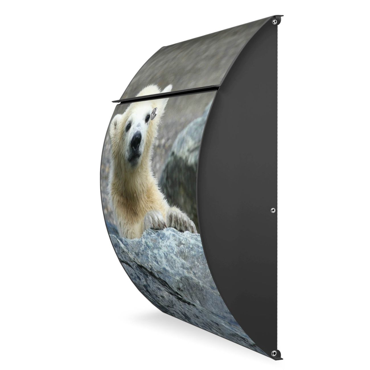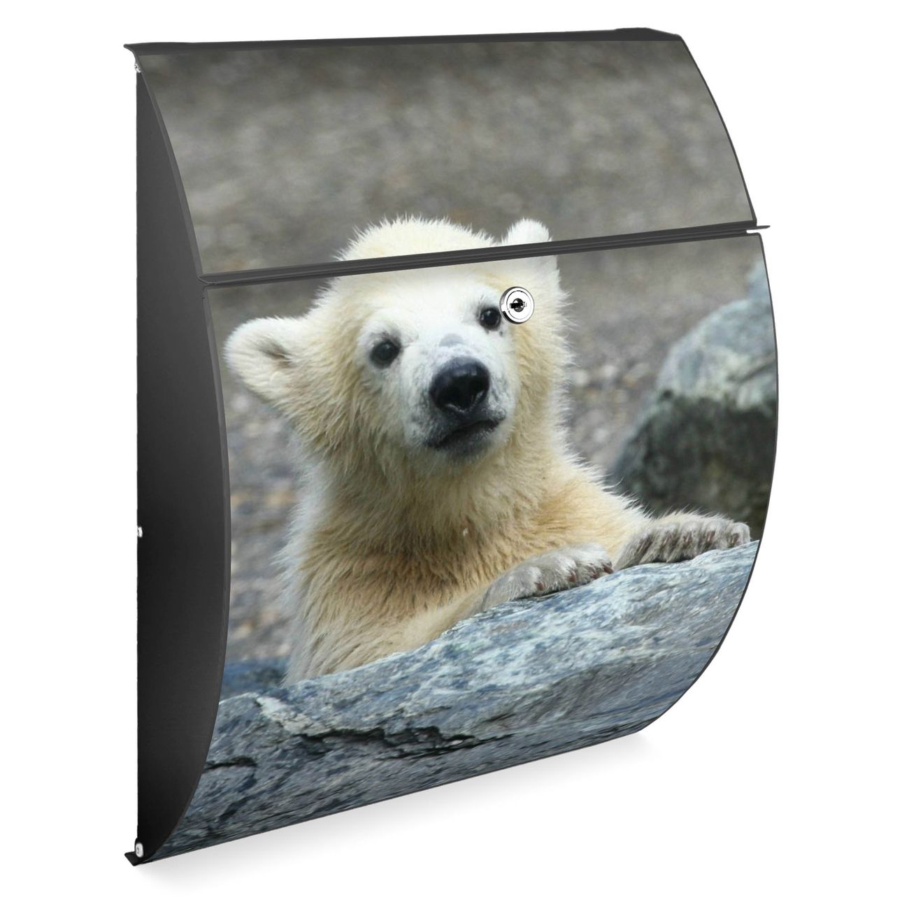 FUNKTION: DESIGN: Das Modell Riviera mit Motiv Eisbär Baby hat ein sehr ansprechendes und zeitloses Design. Heben Sie Sich von der tristen grauen Masse ab, ohne auf Funktionalität zu verzichten. Der integrierte Öffnungsstopp ermöglicht eine einfache Handhabung beim Entnehmen der Post. DETAILS: Der Postkasten besteht aus vollflächig verzinktem Stahl welcher in Anthrazit lackiert wurde. Das Motiv besteht aus einer wetter- und UV-festen Folie, die mit einem Schutzlaminat überzogen ist, durch die Ihren Briefkasten zusätzlich vor Kratzern geschützt ist. Sie erhalten 2 Schlüssel sowie das passende Montagematerial. NUTZEN: Sie können den Briefkasten sowohl als Wandbriefkasten montieren oder einen passenden Ständer kaufen und als Standbriefkasten einbetonieren. Die Größe bietet genügend Platz für Sendungen aller Art, der Einwurf fasst auch größere A4 Sendungen. BANJADO: Ihr Briefkasten wird in Sachsen in einer kleinen Manufaktur von Hand veredelt. Die Motivfolie ist lösungsmittelfrei und schutzlaminiert, dies sorgt für einen langen Halt. Wir legen großen Wert auf die Verbindung von Funktionalität und Design. Sie erhalten Handarbeit aus Sachsen.