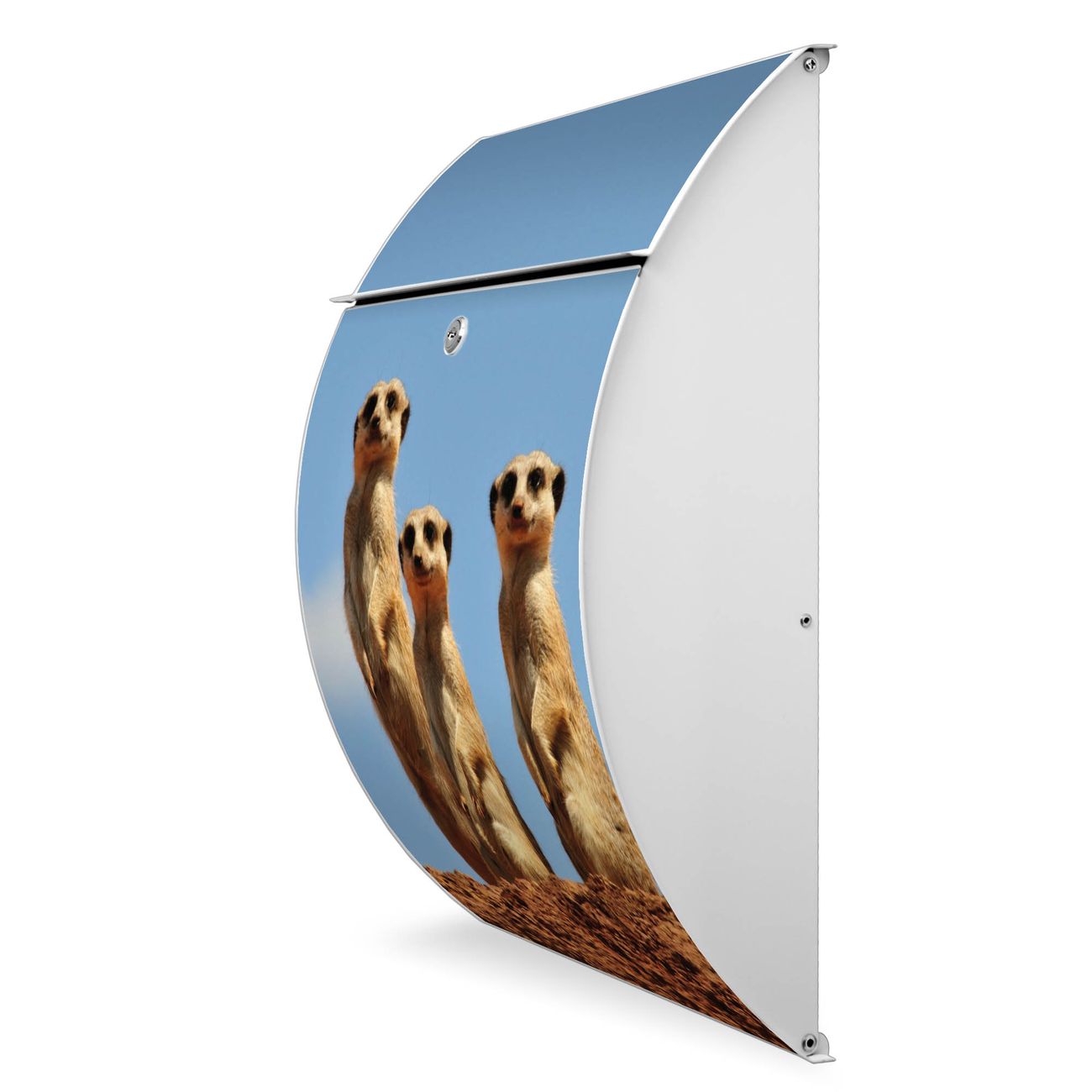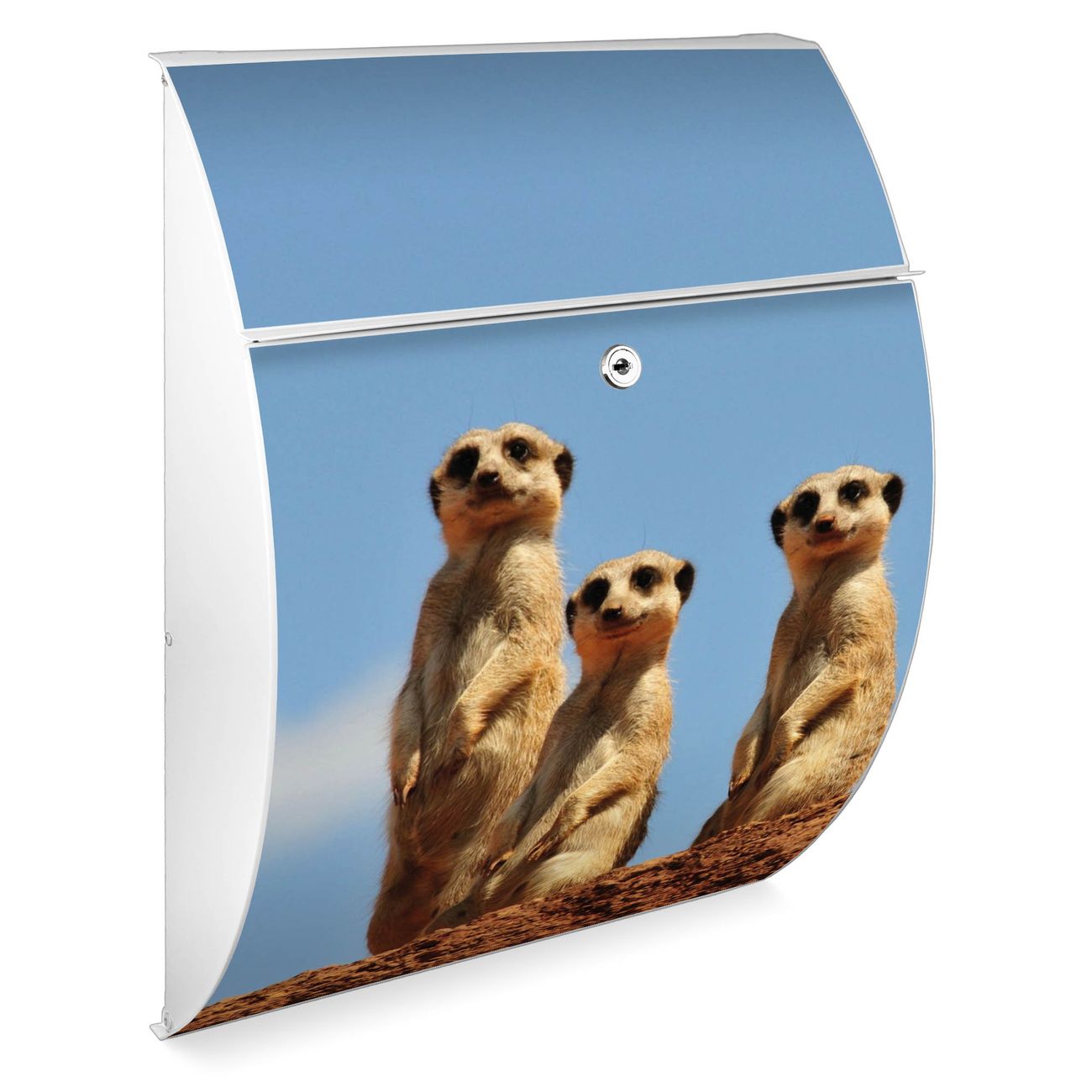 Der weiße Burg Wächter Design Briefkasten mit Motiv Erdmännchenfamilie bietet Ihnen mit seinem Fassungsvermögen genügend Platz auch für große A4 Sendungen. Auf Wunsch können Sie bei uns auch den passenden Ständer kaufen und so aus dem Wandbriefkasten einen Standbriefkasten machen.