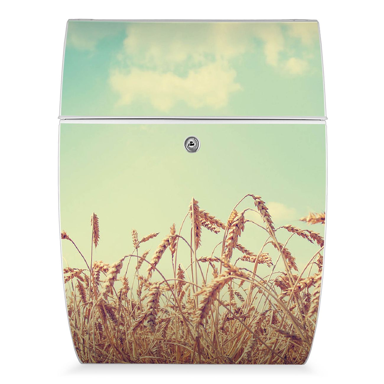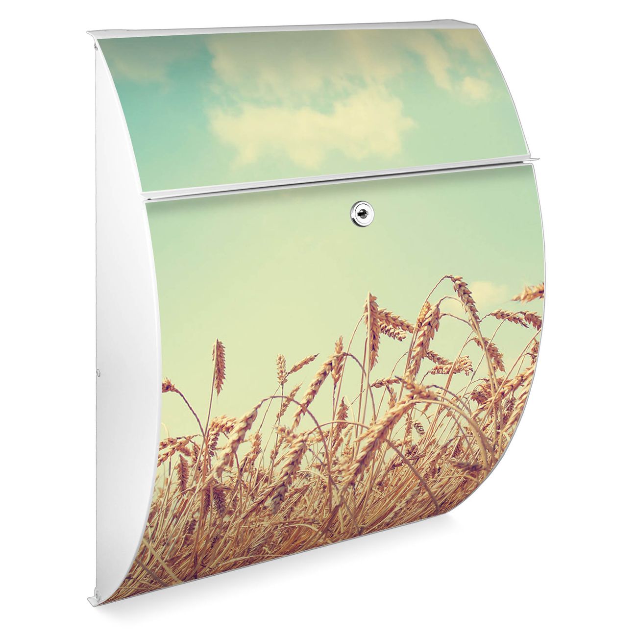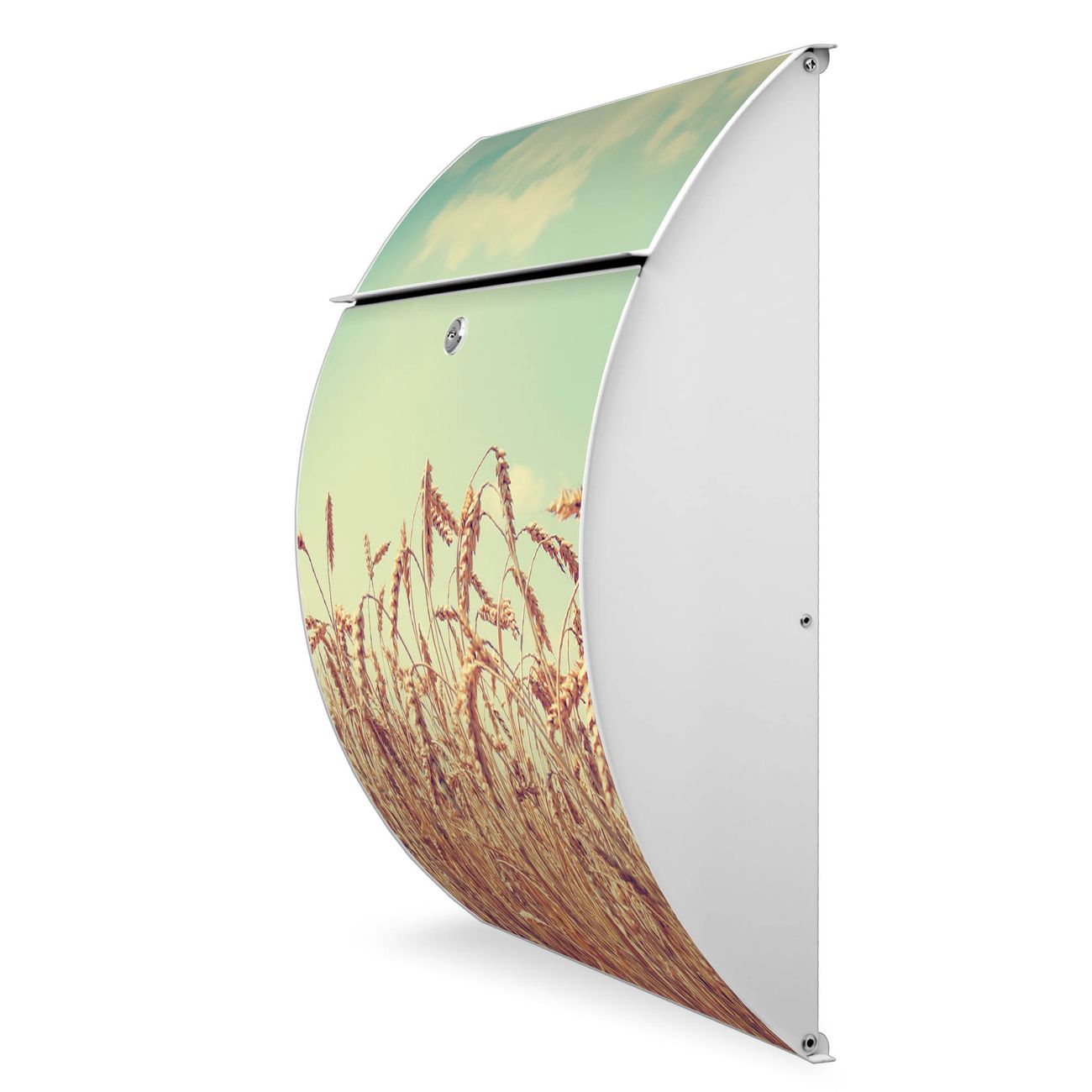 Der weiße Burg Wächter Design Briefkasten mit Motiv Erntezeit bietet Ihnen mit seinem Fassungsvermögen genügend Platz auch für große A4 Sendungen. Auf Wunsch können Sie bei uns auch den passenden Ständer kaufen und so aus dem Wandbriefkasten einen Standbriefkasten machen.