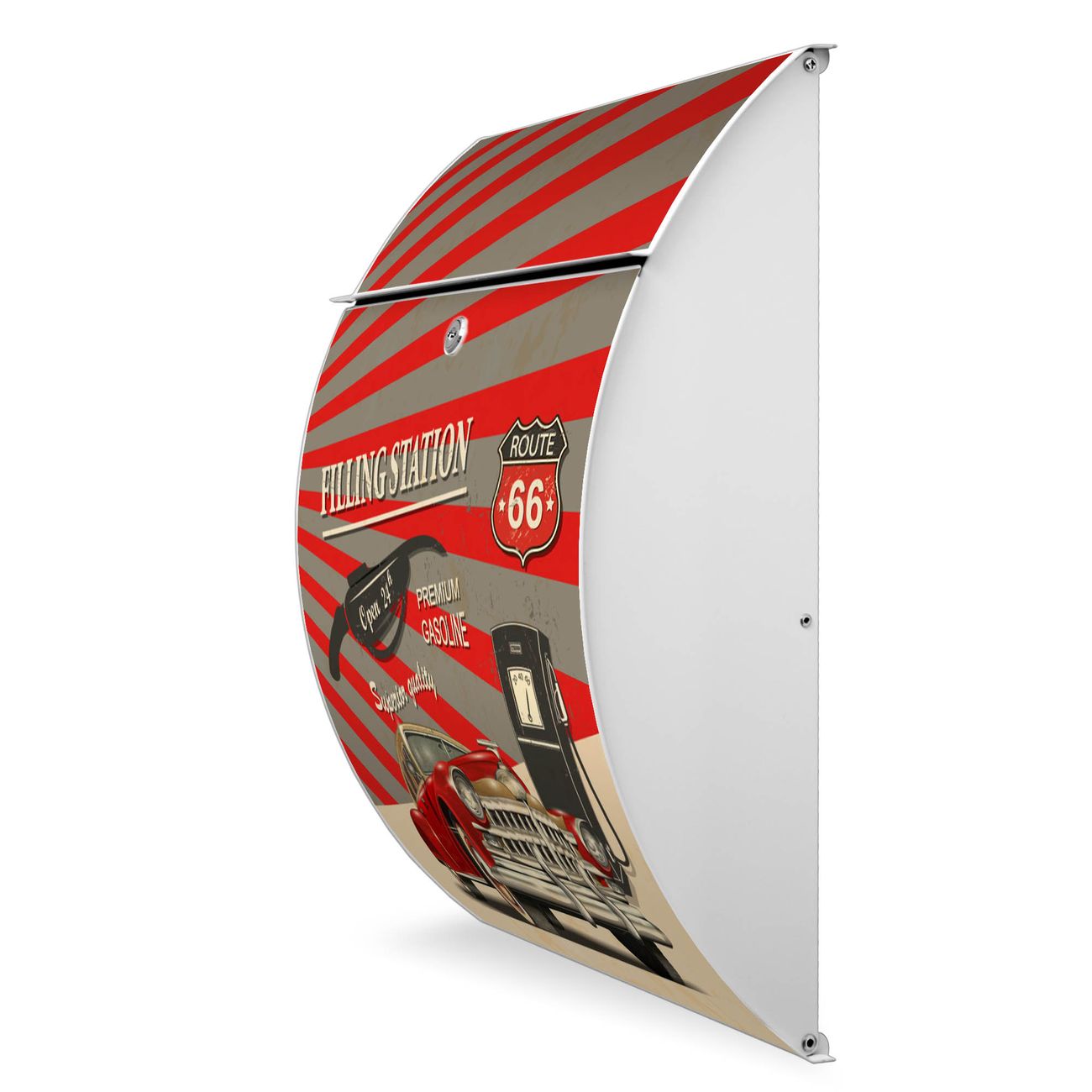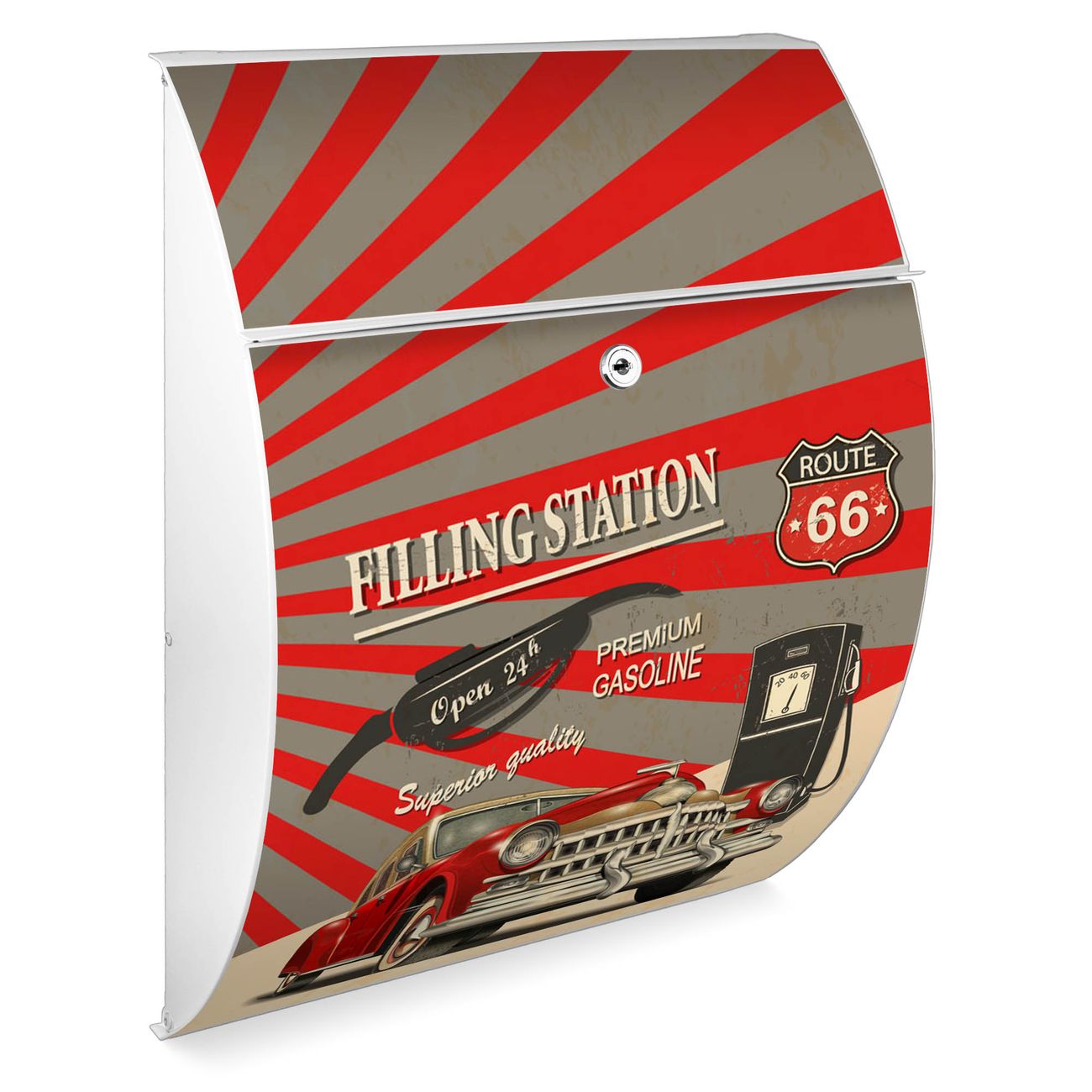 Der weiße Burg Wächter Design Briefkasten mit Motiv Filling Station bietet Ihnen mit seinem Fassungsvermögen genügend Platz auch für große A4 Sendungen. Auf Wunsch können Sie bei uns auch den passenden Ständer kaufen und so aus dem Wandbriefkasten einen Standbriefkasten machen.