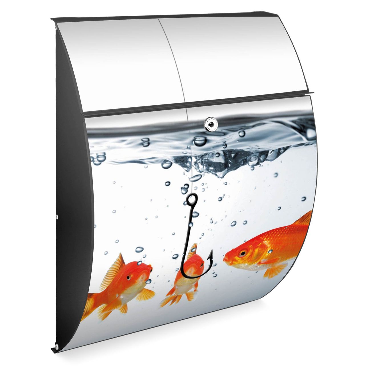 FUNKTION: DESIGN: Das Modell Riviera mit Motiv Fische hat ein sehr ansprechendes und zeitloses Design. Heben Sie Sich von der tristen grauen Masse ab, ohne auf Funktionalität zu verzichten. Der integrierte Öffnungsstopp ermöglicht eine einfache Handhabung beim Entnehmen der Post. DETAILS: Der Postkasten besteht aus vollflächig verzinktem Stahl welcher in Anthrazit lackiert wurde. Das Motiv besteht aus einer wetter- und UV-festen Folie, die mit einem Schutzlaminat überzogen ist, durch die Ihren Briefkasten zusätzlich vor Kratzern geschützt ist. Sie erhalten 2 Schlüssel sowie das passende Montagematerial. NUTZEN: Sie können den Briefkasten sowohl als Wandbriefkasten montieren oder einen passenden Ständer kaufen und als Standbriefkasten einbetonieren. Die Größe bietet genügend Platz für Sendungen aller Art, der Einwurf fasst auch größere A4 Sendungen. BANJADO: Ihr Briefkasten wird in Sachsen in einer kleinen Manufaktur von Hand veredelt. Die Motivfolie ist lösungsmittelfrei und schutzlaminiert, dies sorgt für einen langen Halt. Wir legen großen Wert auf die Verbindung von Funktionalität und Design. Sie erhalten Handarbeit aus Sachsen.