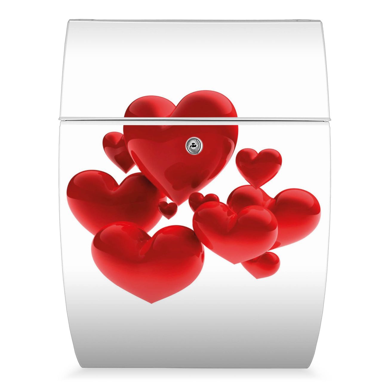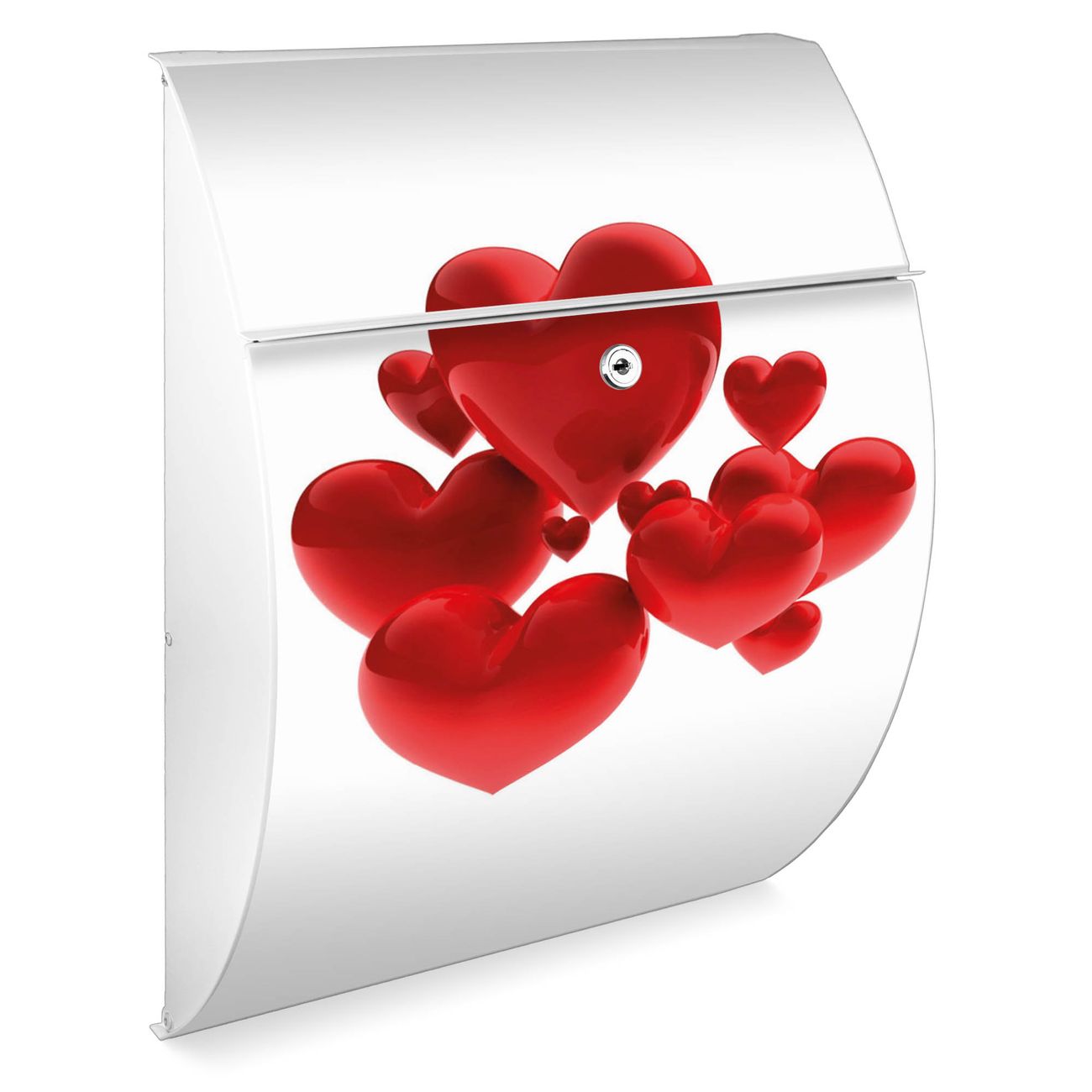 Der weiße Burg Wächter Design Briefkasten mit Motiv Fliegende Herzen bietet Ihnen mit seinem Fassungsvermögen genügend Platz auch für große A4 Sendungen. Auf Wunsch können Sie bei uns auch den passenden Ständer kaufen und so aus dem Wandbriefkasten einen Standbriefkasten machen.