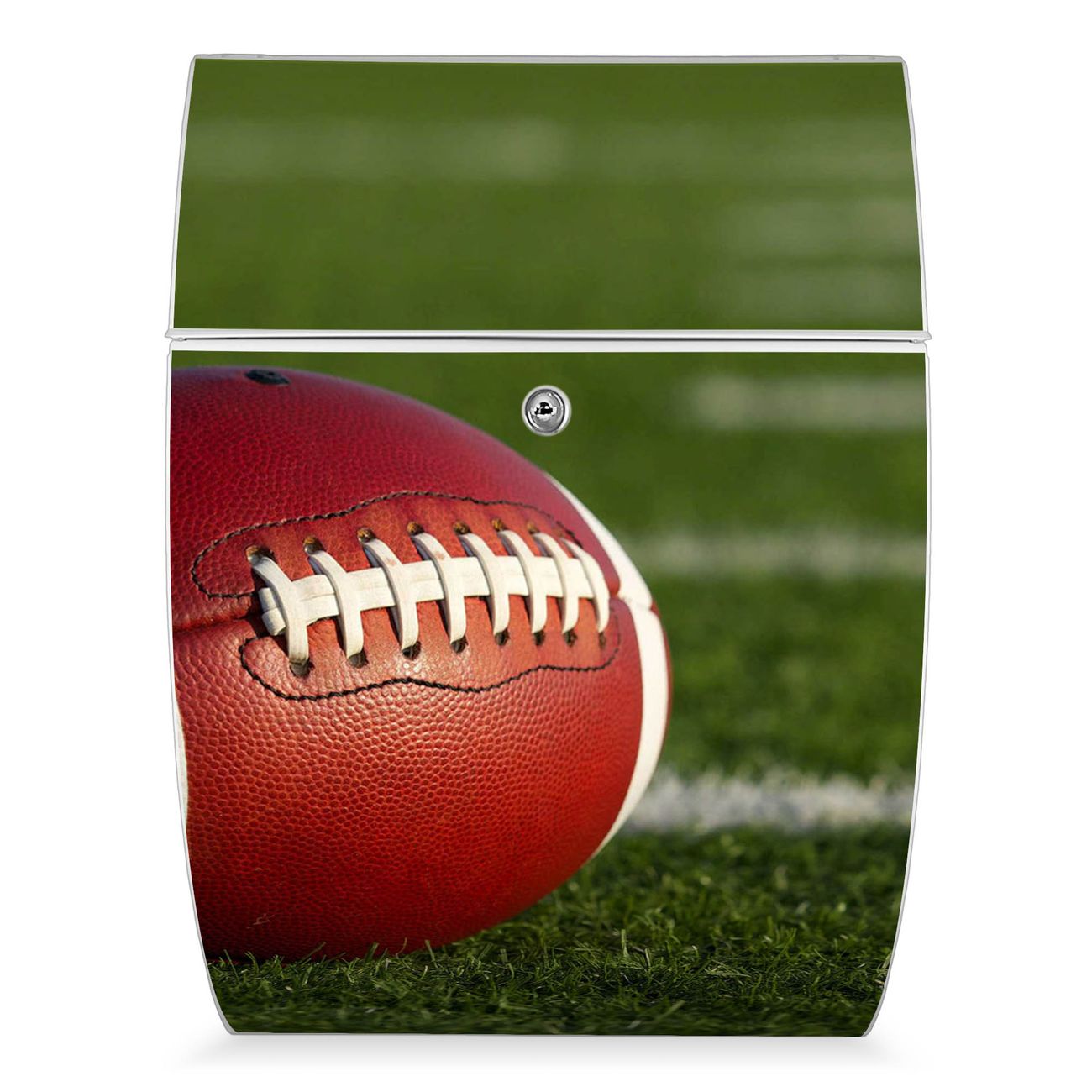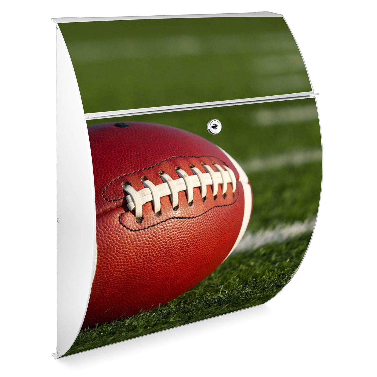 Der weiße Burg Wächter Design Briefkasten mit Motiv Football bietet Ihnen mit seinem Fassungsvermögen genügend Platz auch für große A4 Sendungen. Auf Wunsch können Sie bei uns auch den passenden Ständer kaufen und so aus dem Wandbriefkasten einen Standbriefkasten machen.